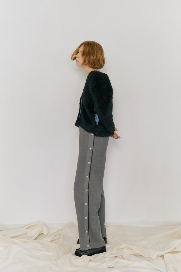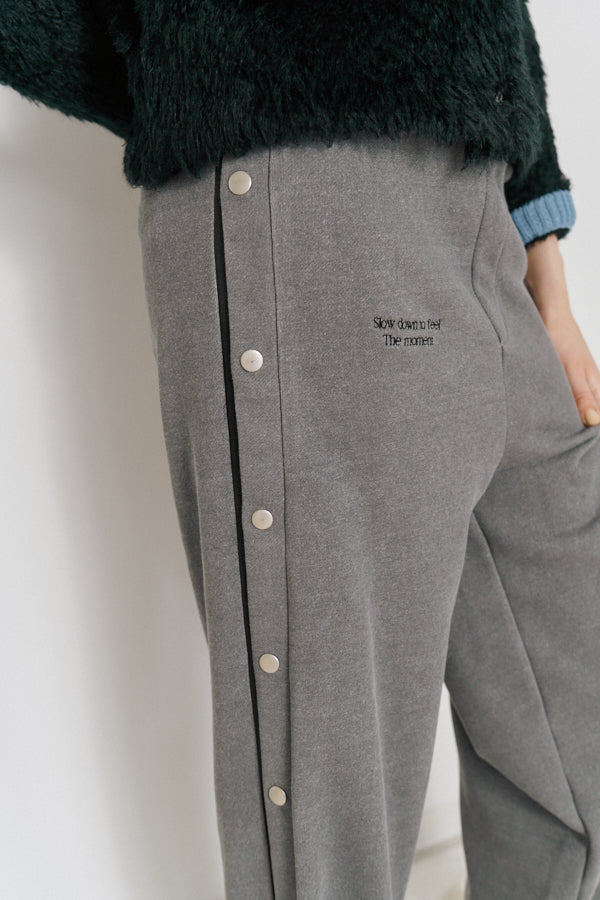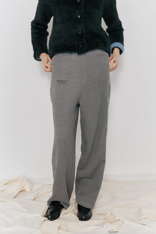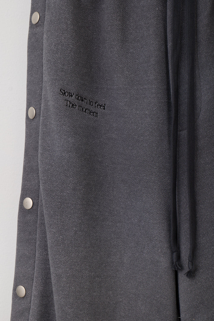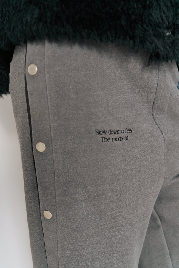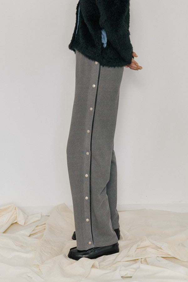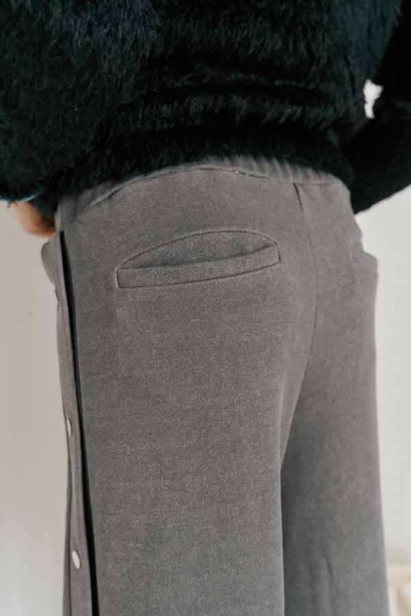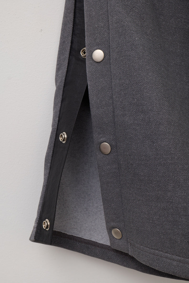 ピグメント加工で仕上げ、程よい色ムラと風合いがヴィンテージライクな雰囲気を演出するスナップボタン付きパンツ。サイドに並ぶスナップはデザインアクセントになるだけでなく、裾から膝までは開けられる仕様で、シルエットやスタイリングに変化をつけられます。ウエストはイージー仕様で快適な穿き心地。