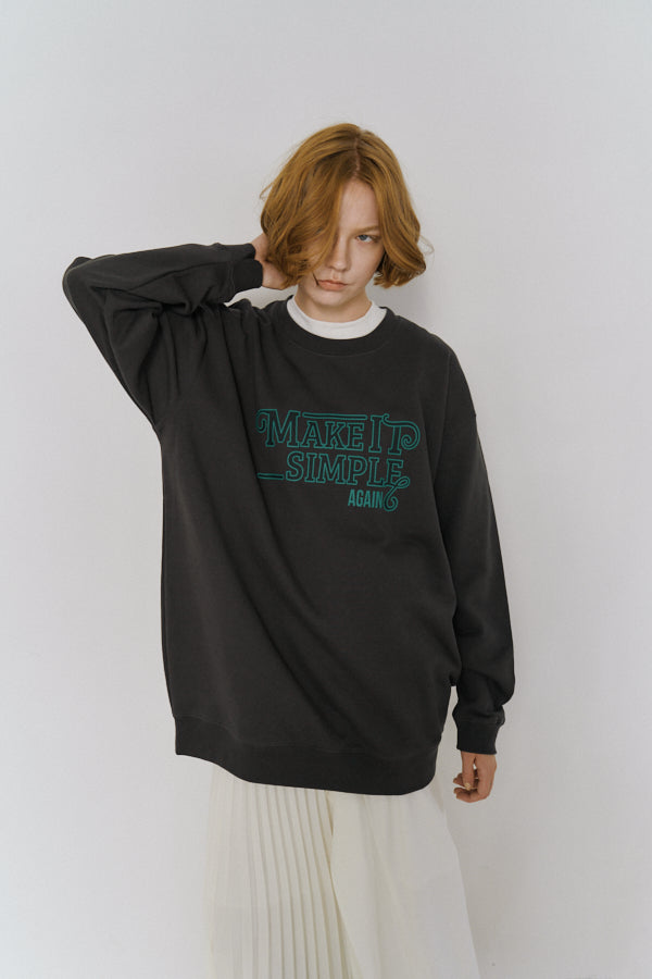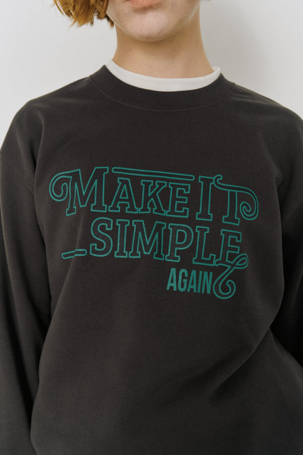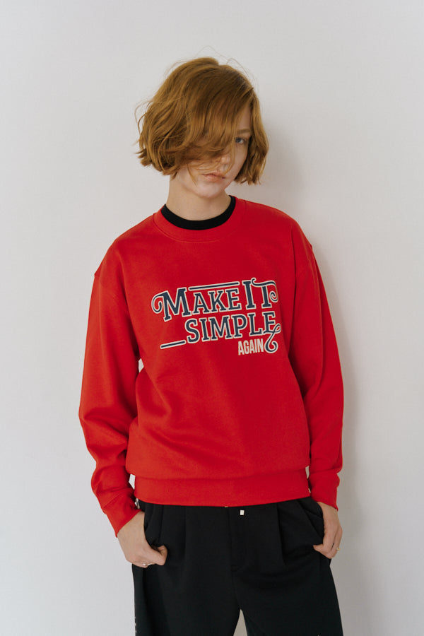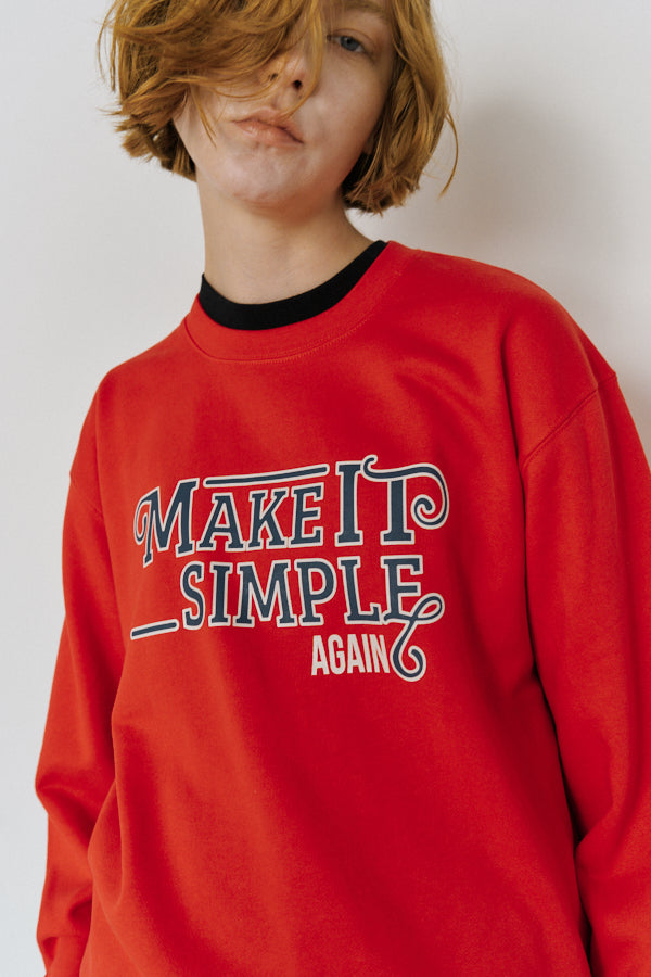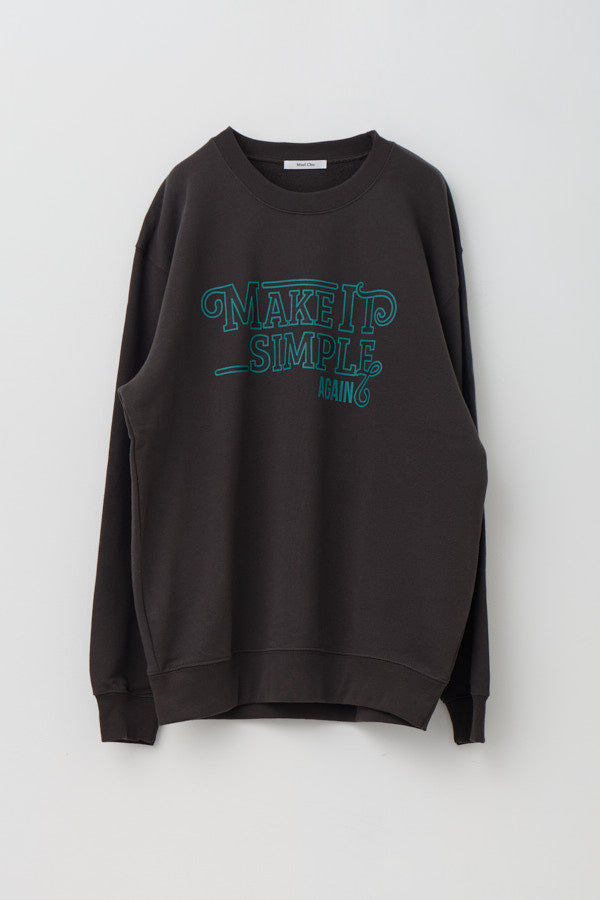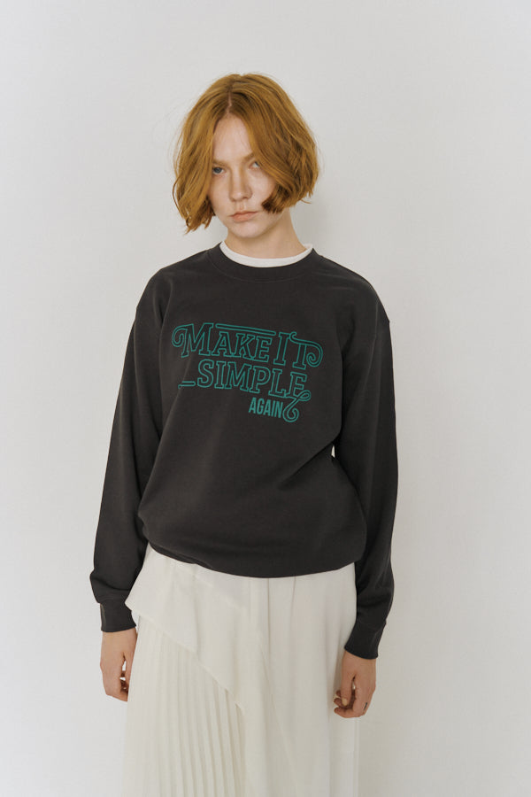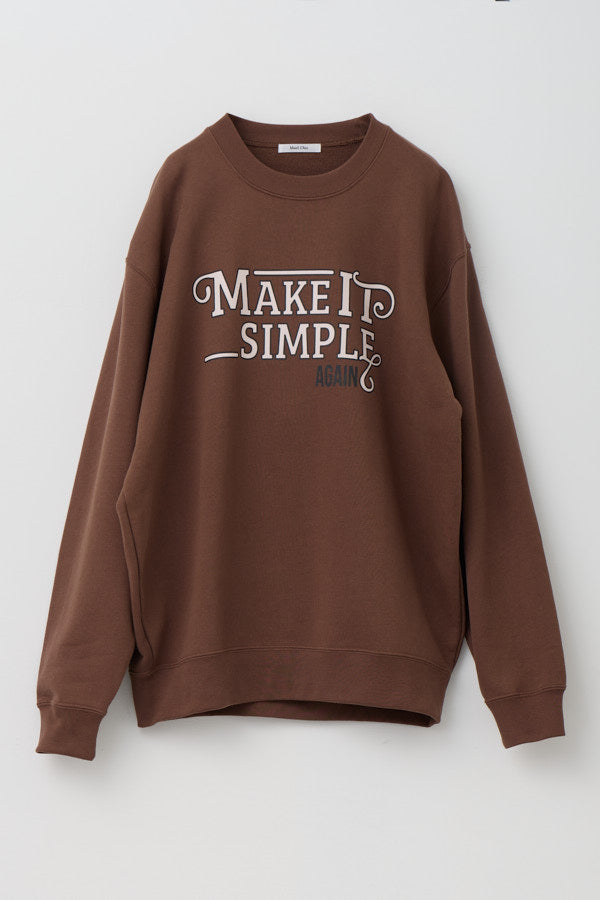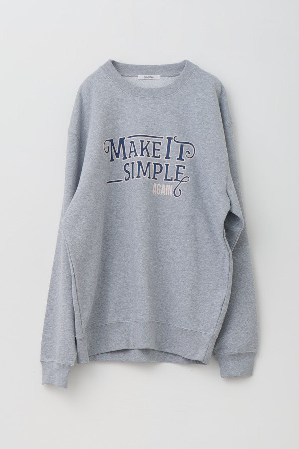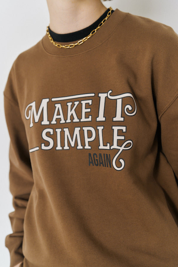 大胆なメッセージロゴ「MAKE IT SIMPLE AGAIN」が目を惹くクルーネックスウェット。