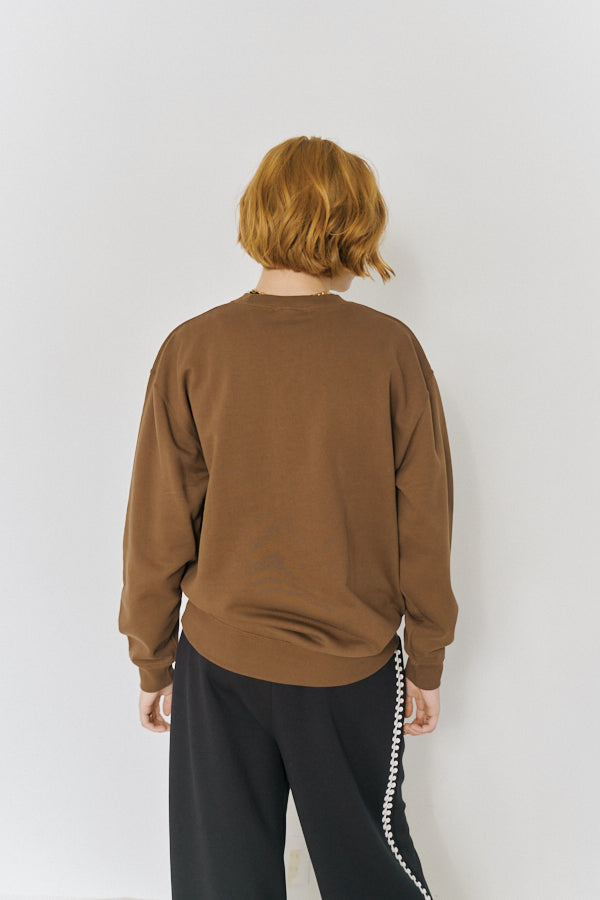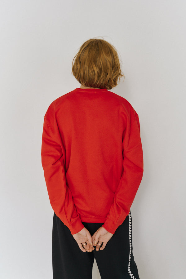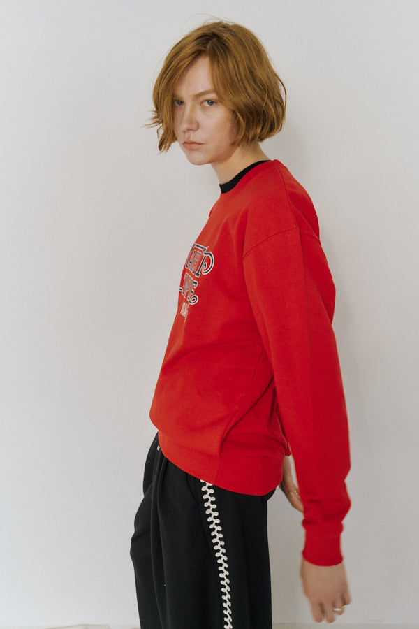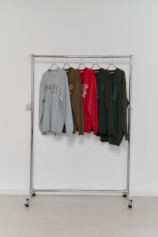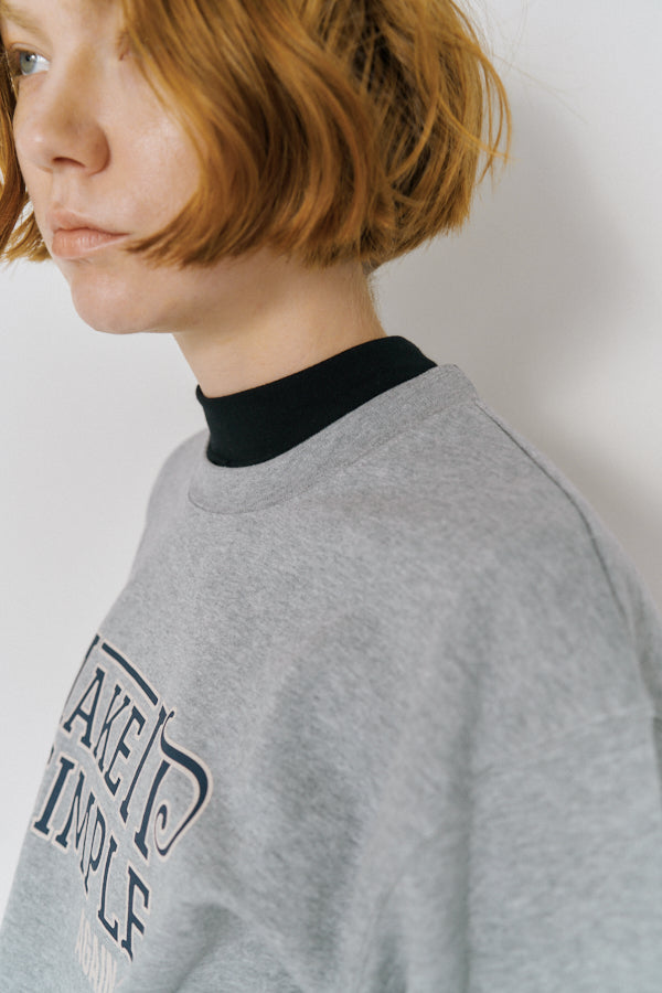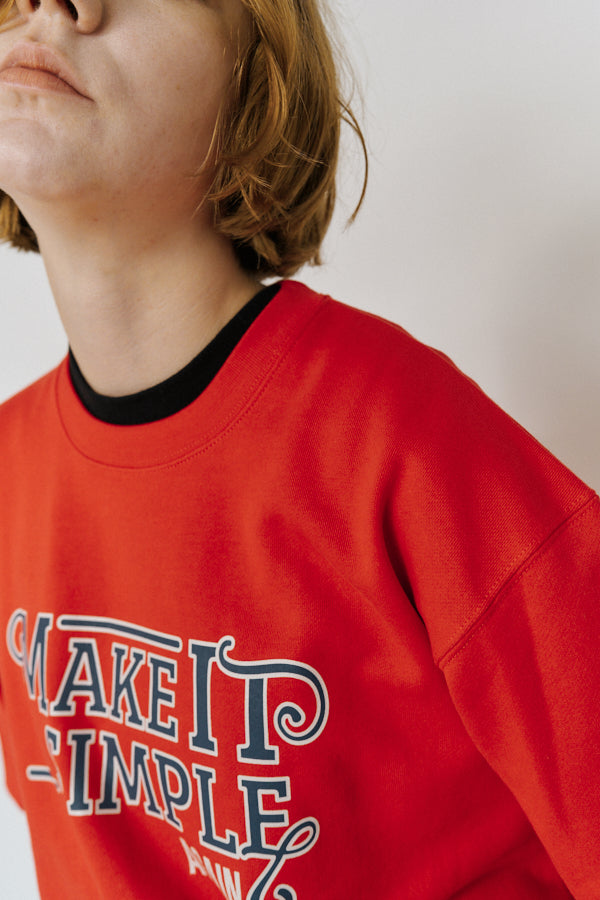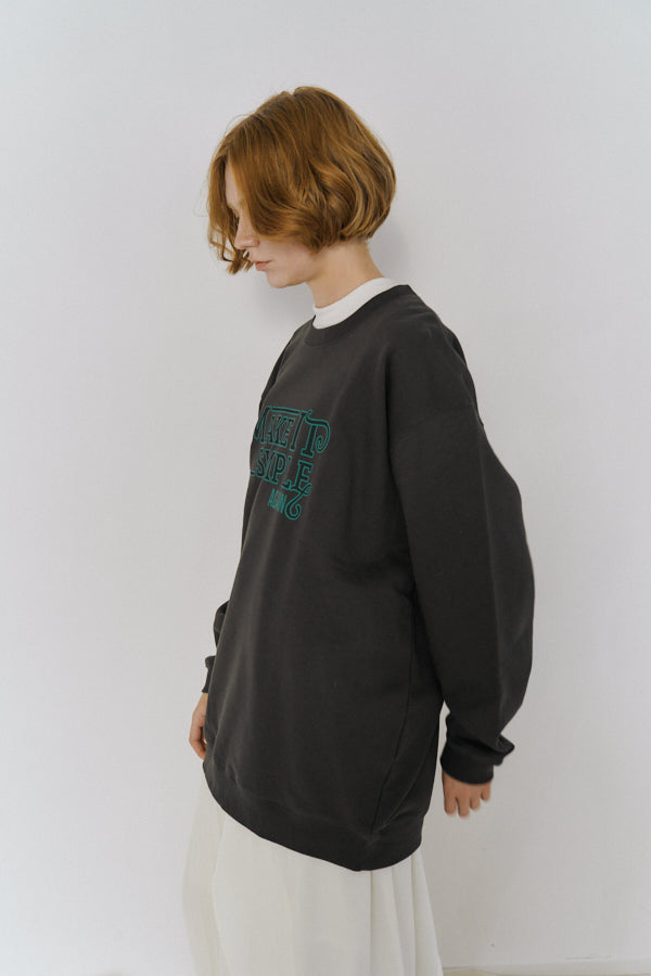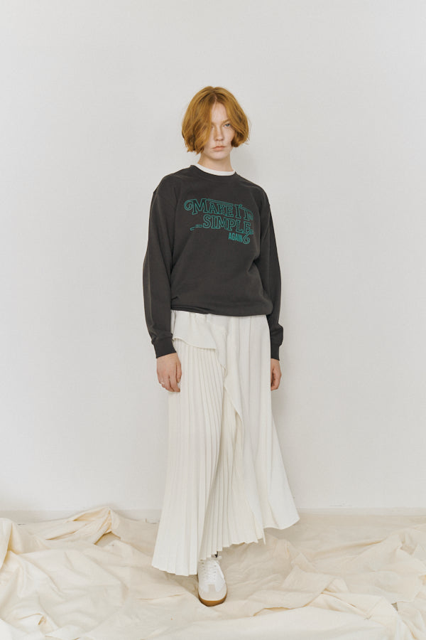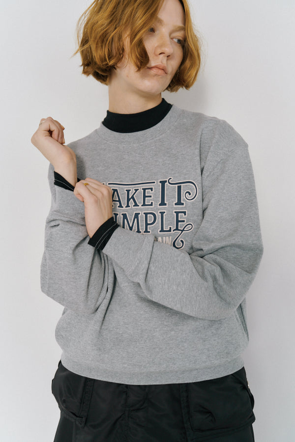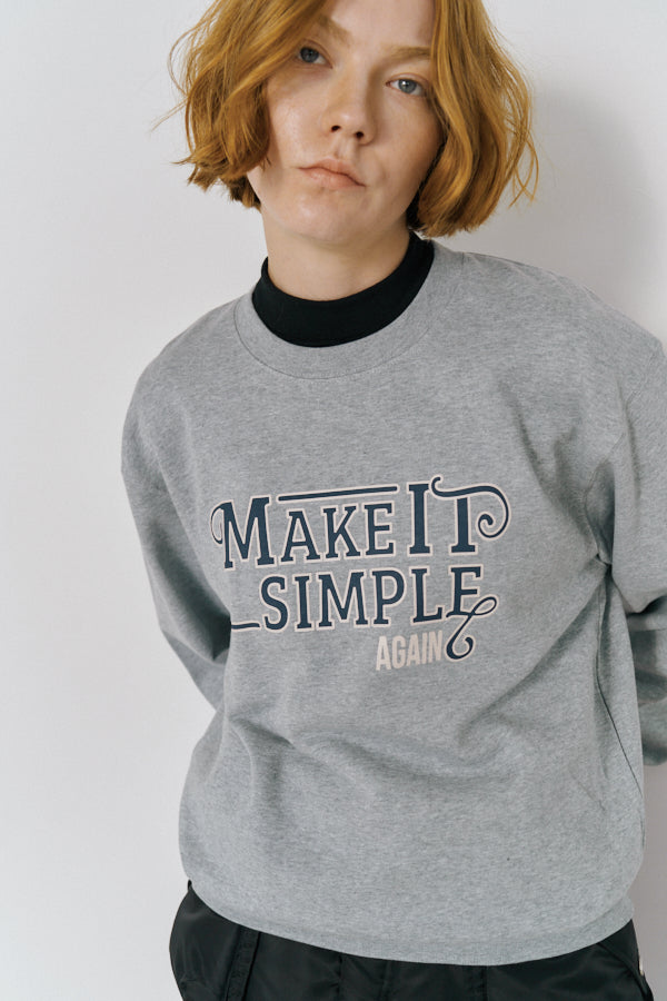大胆なメッセージロゴ「MAKE IT SIMPLE AGAIN」が目を惹くクルーネックスウェット。
