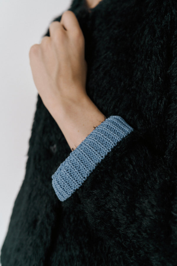 すっきりとしたクルーネックにコンパクトなシルエットで、デイリーに取り入れやすいデザイン。裾や襟ぐりからチラリと覗く配色ニットがポイントになり、シンプルな中に遊び心をプラスしています。フロントはクラシックなボタン仕様で、落ち着きのある表情に仕上げました。