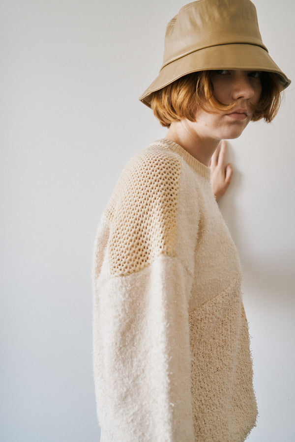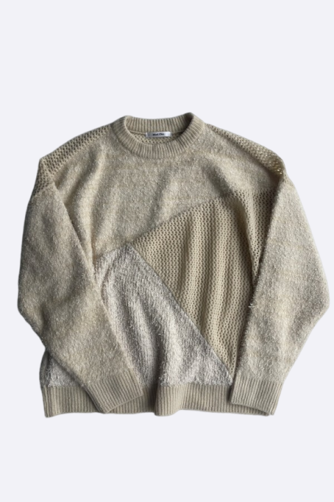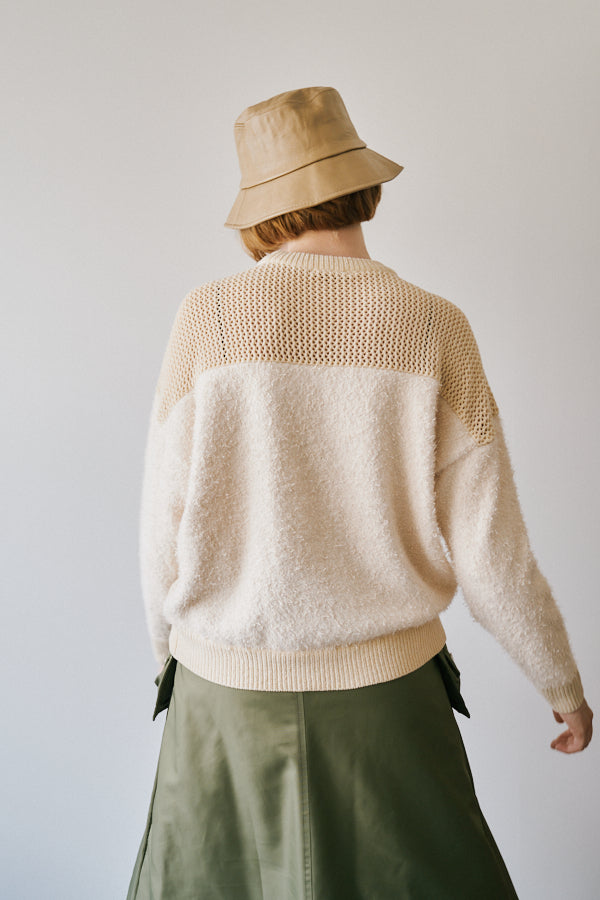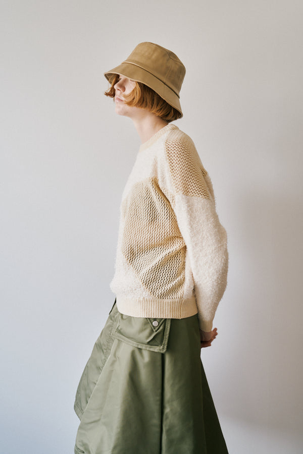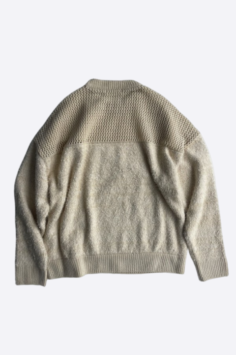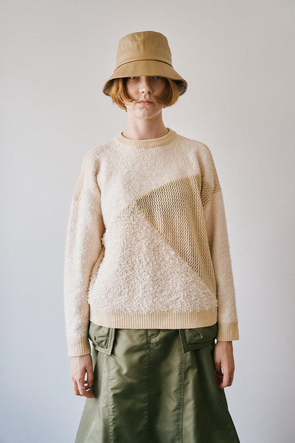 ふんわりとしたシャギー素材とメッシュ調ニットを組み合わせた、ニュアンスたっぷりのプルオーバーニット。