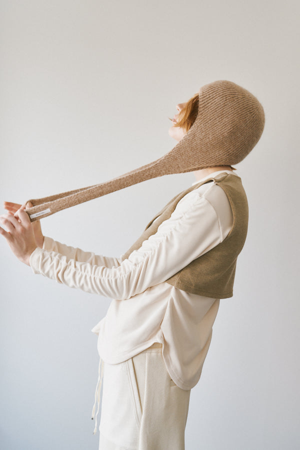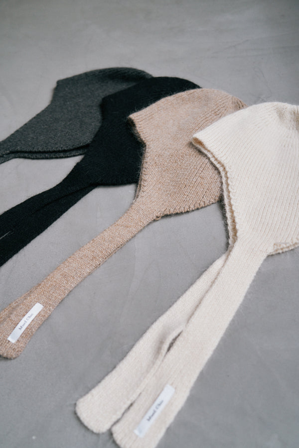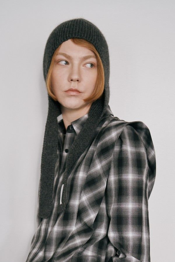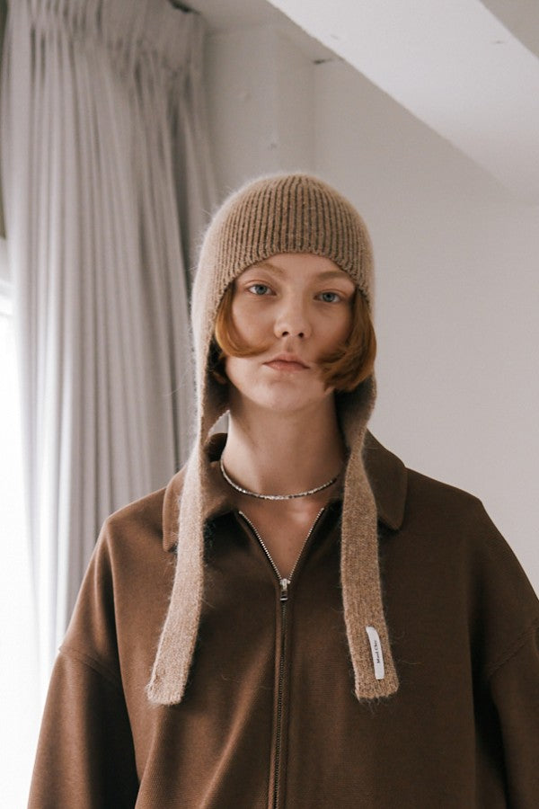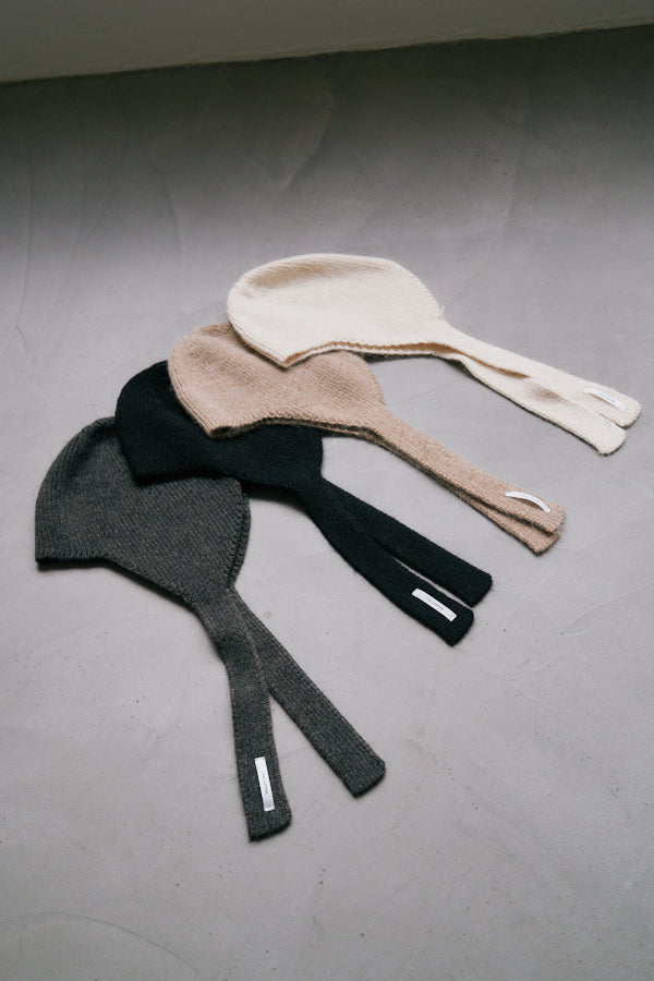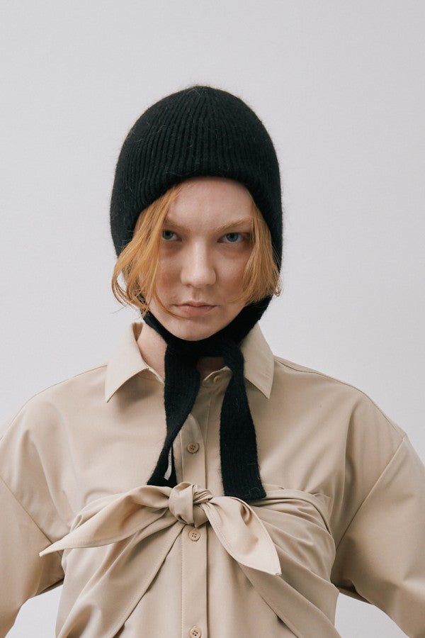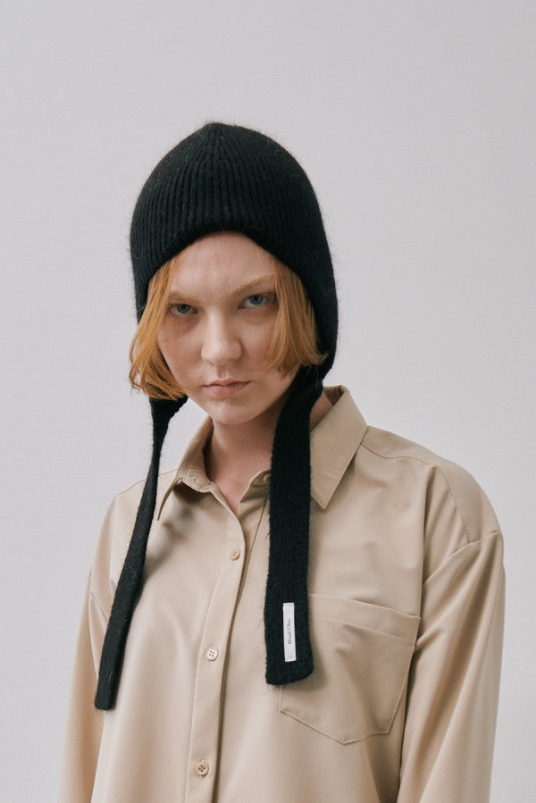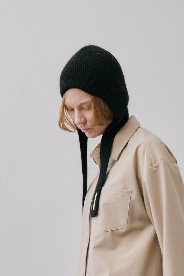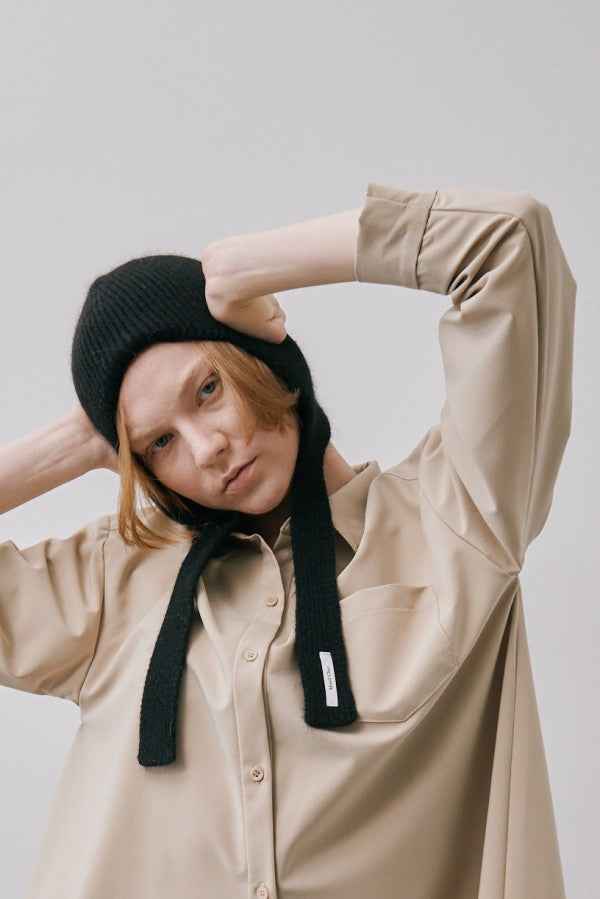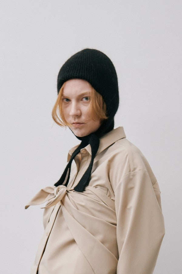 フード感覚でかぶれるスタイリッシュなニット帽。シャープなシルエットと長めのストラップが特徴で、結んでもラフに垂らしてもモードな雰囲気を演出します。シンプルなコーディネートにプラスするだけで、トレンド感と洗練されたアクセントを添えてくれるアイテムです。