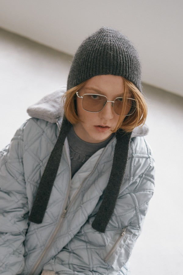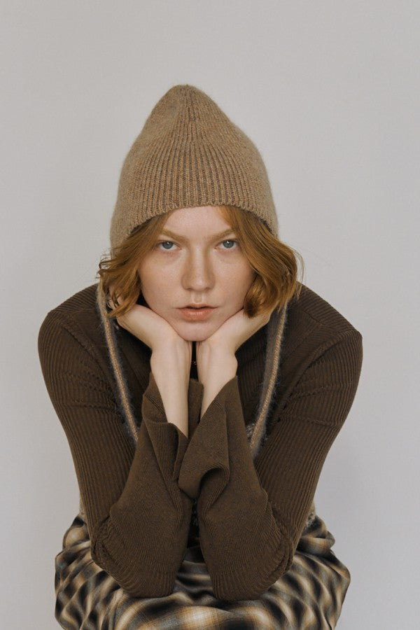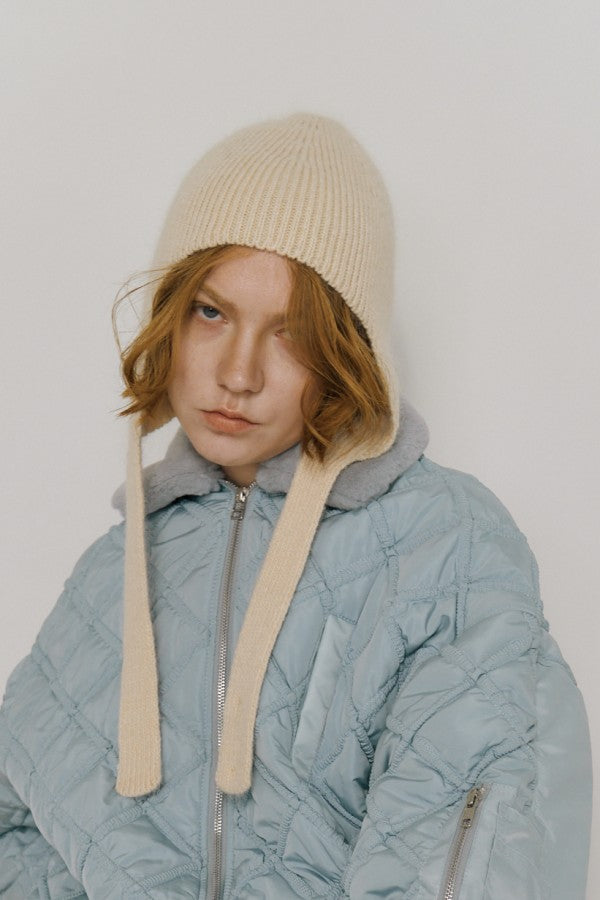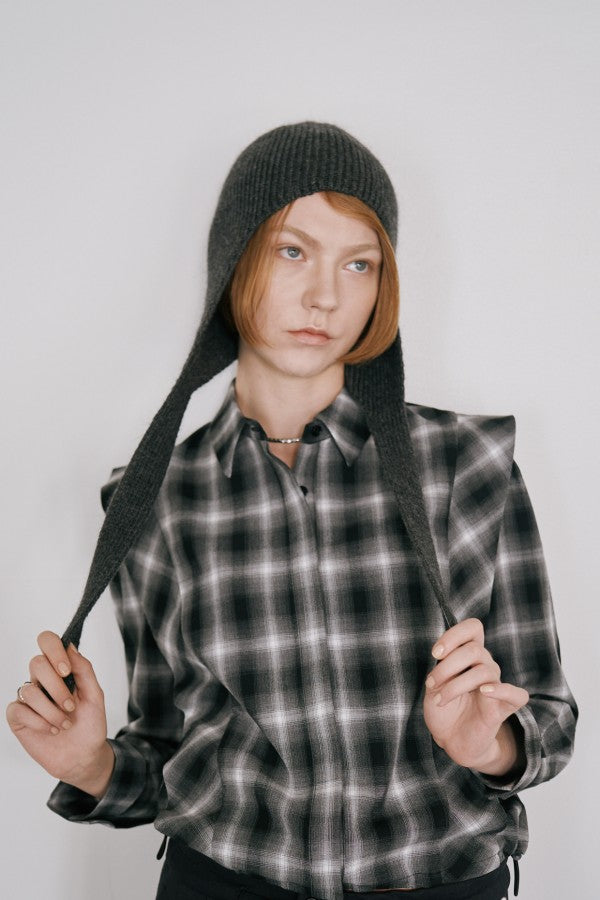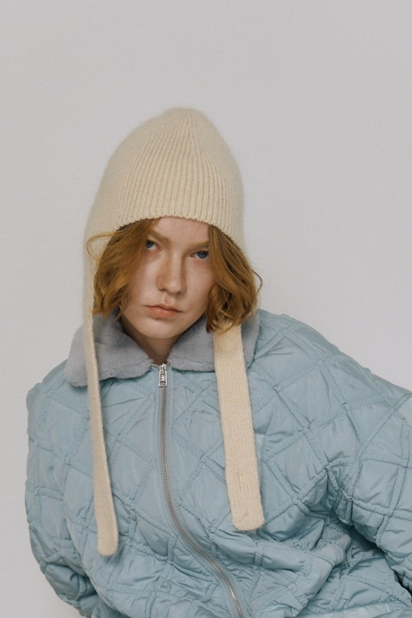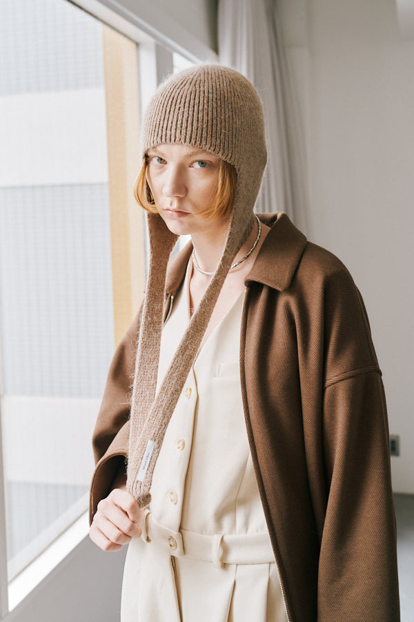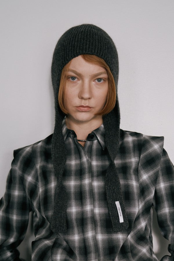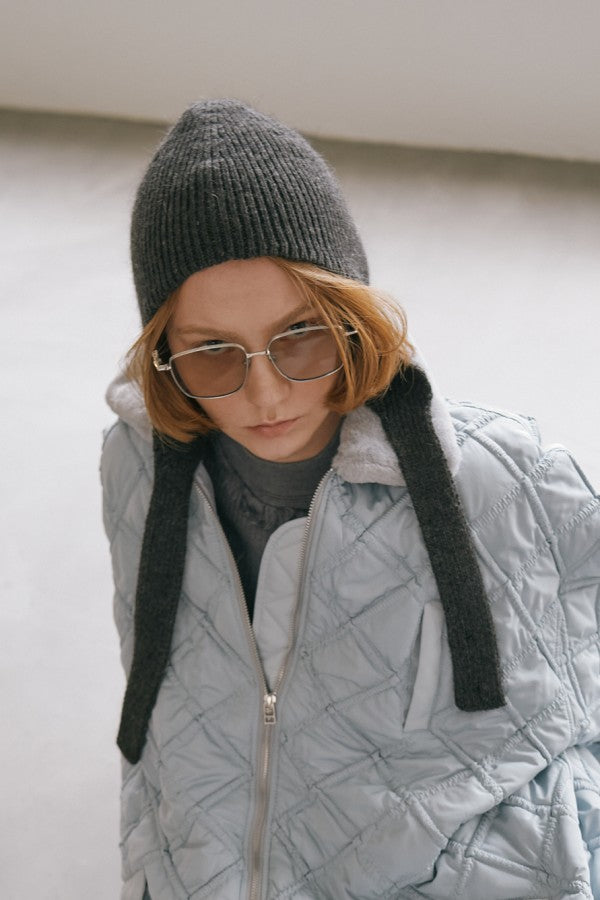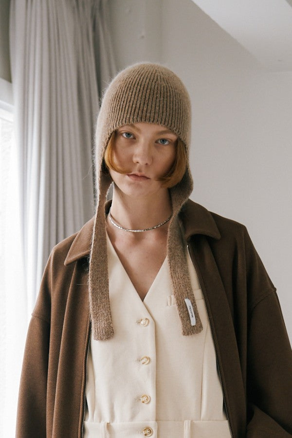 フード感覚でかぶれるスタイリッシュなニット帽。シャープなシルエットと長めのストラップが特徴で、結んでもラフに垂らしてもモードな雰囲気を演出します。シンプルなコーディネートにプラスするだけで、トレンド感と洗練されたアクセントを添えてくれるアイテムです。