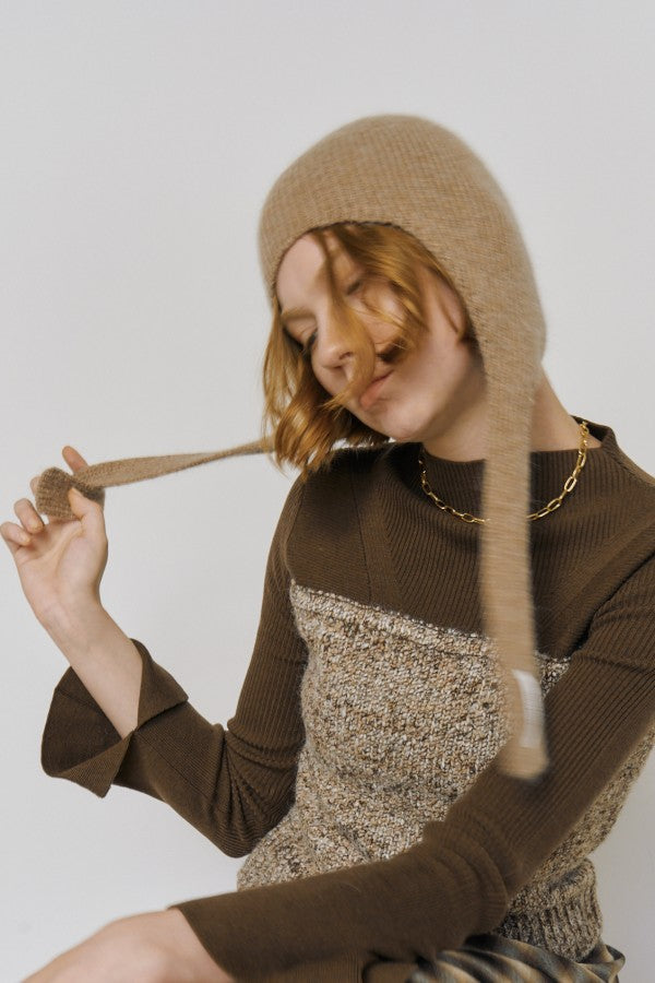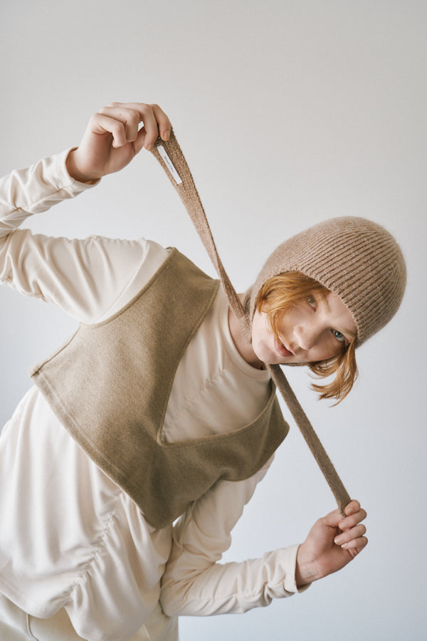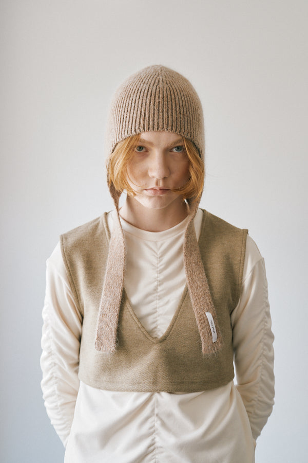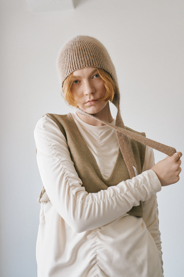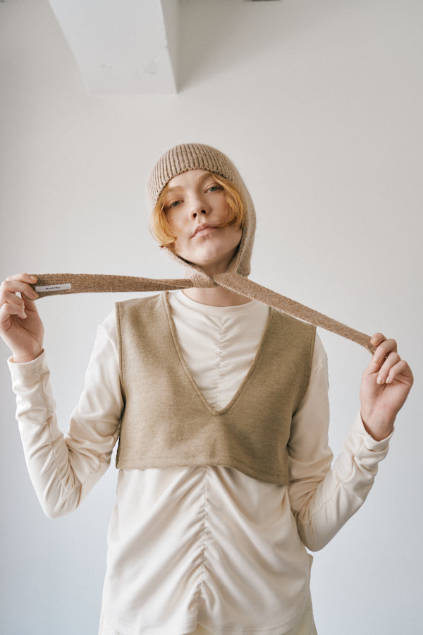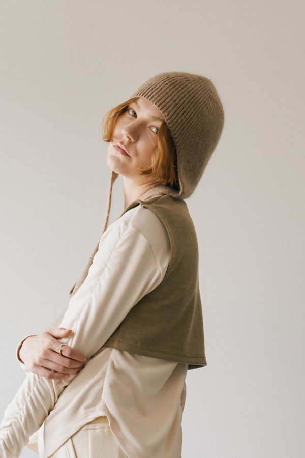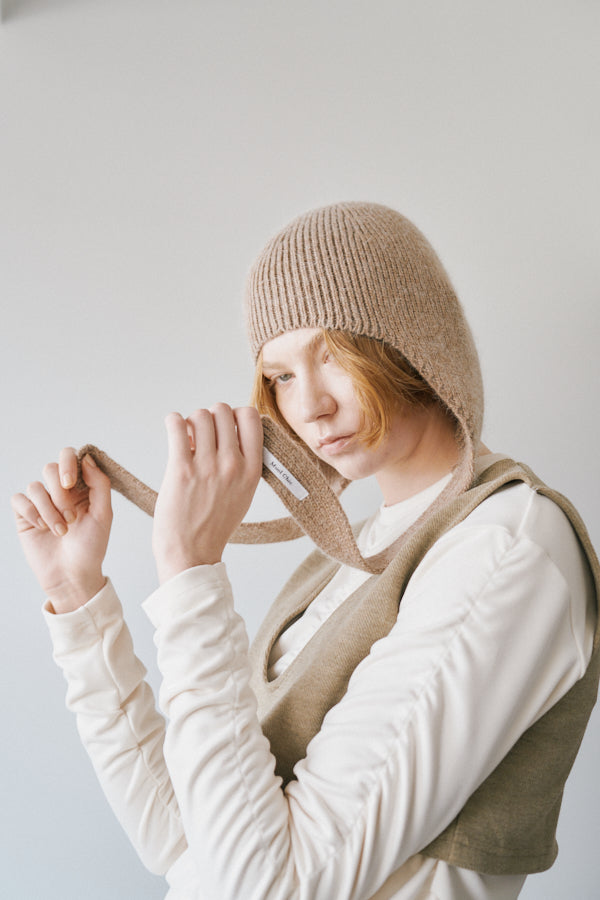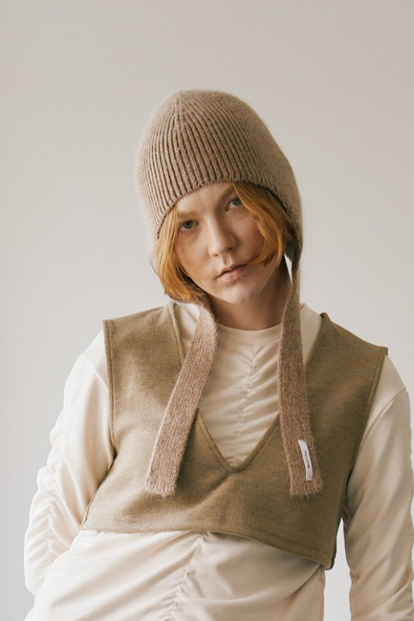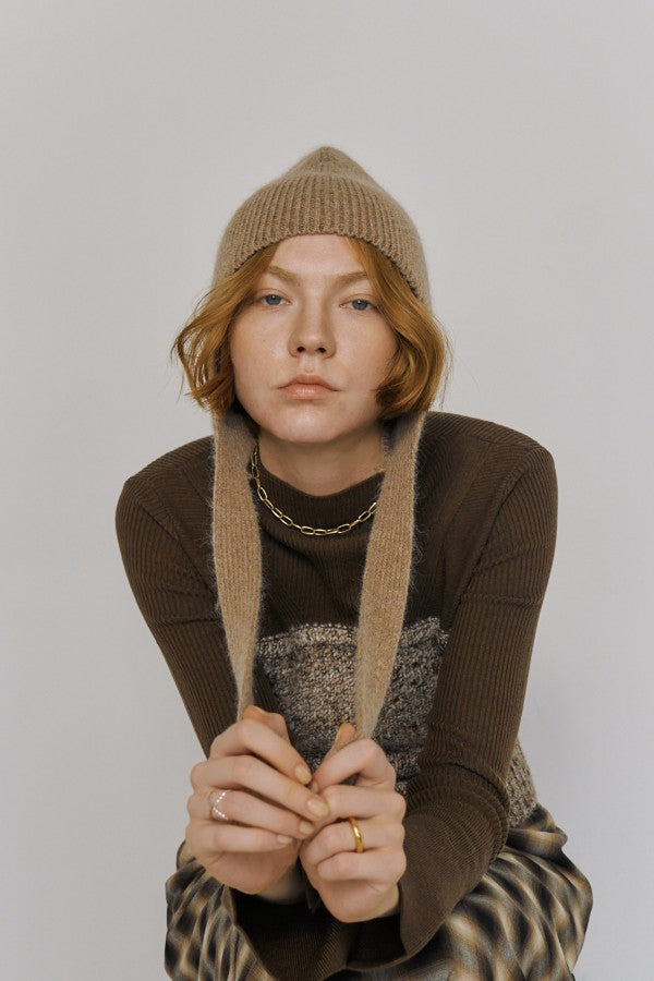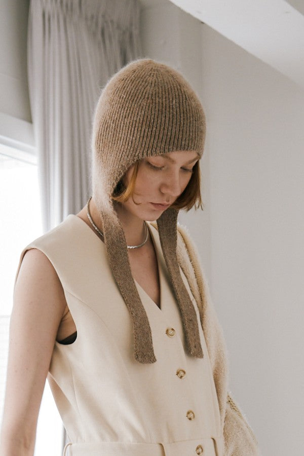 フード感覚でかぶれるスタイリッシュなニット帽。シャープなシルエットと長めのストラップが特徴で、結んでもラフに垂らしてもモードな雰囲気を演出します。シンプルなコーディネートにプラスするだけで、トレンド感と洗練されたアクセントを添えてくれるアイテムです。