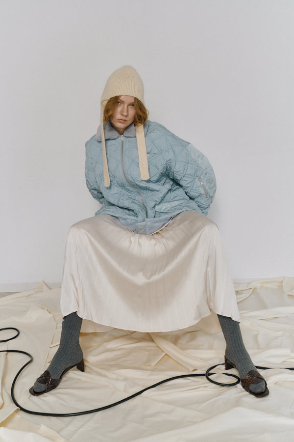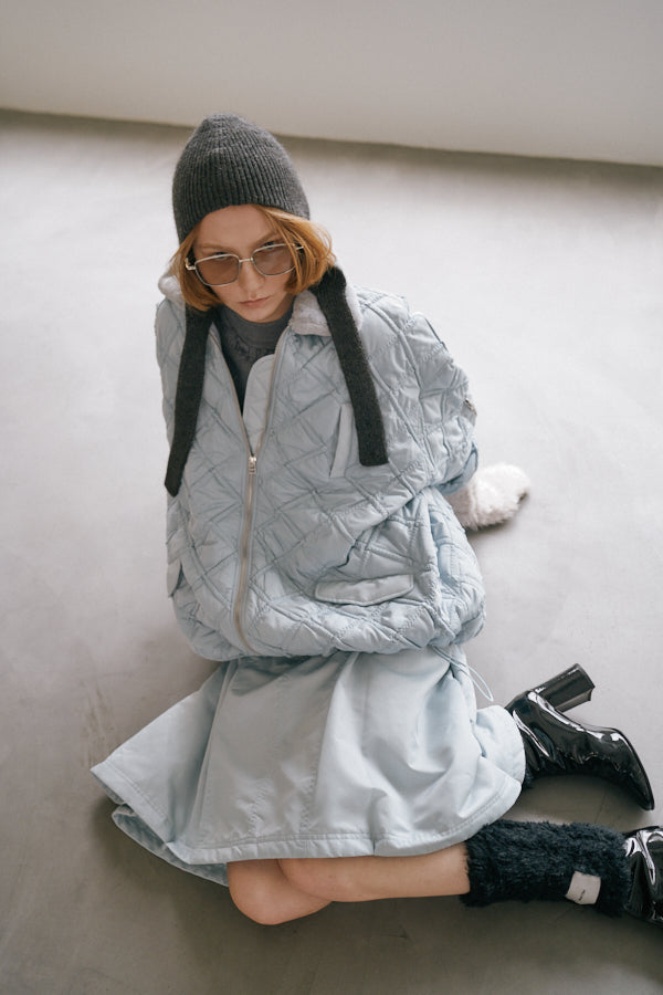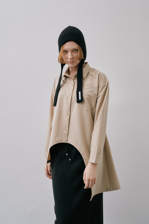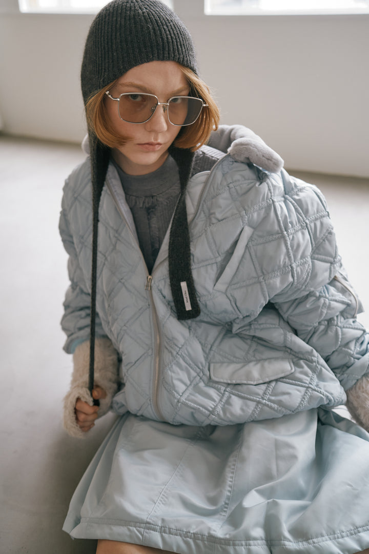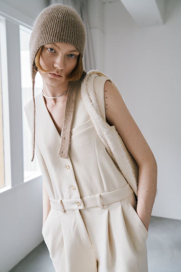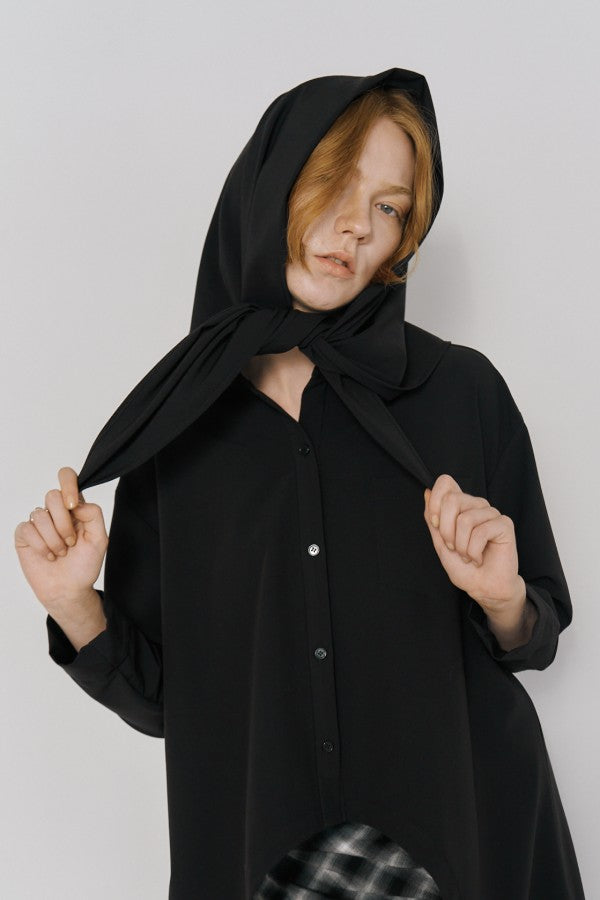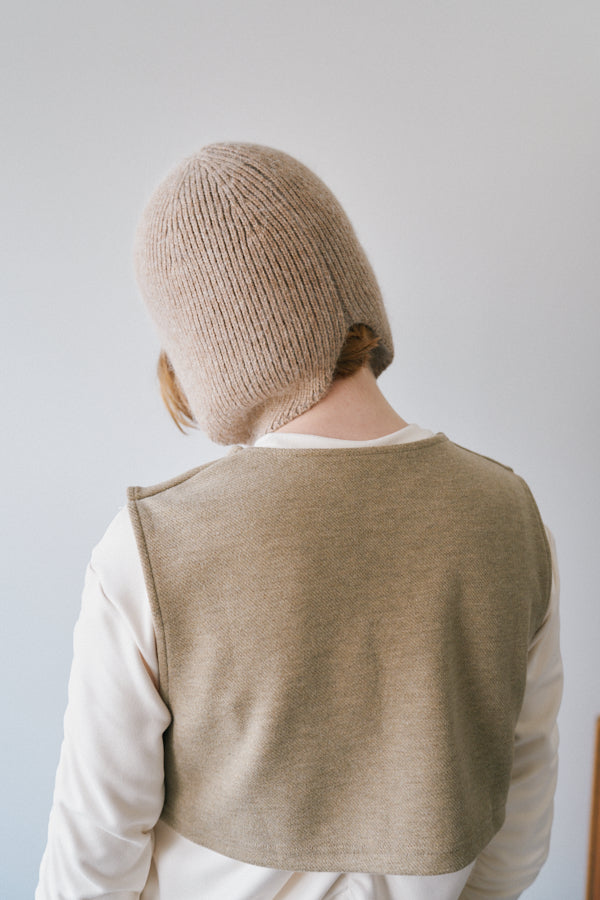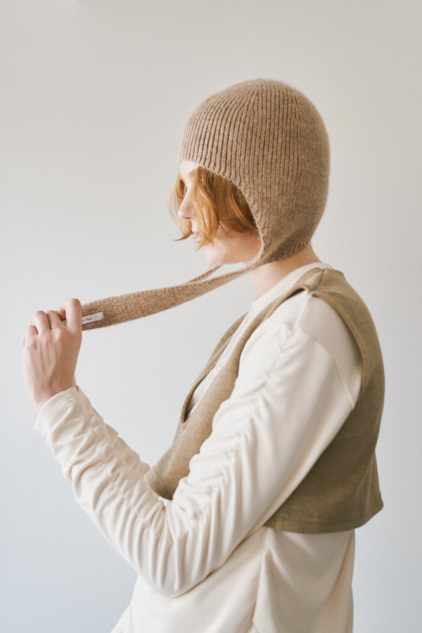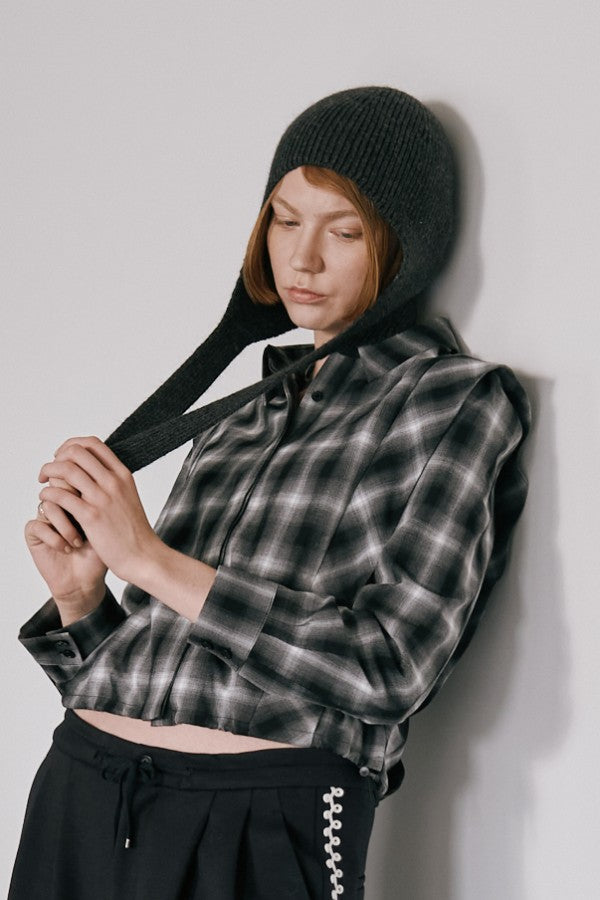 フード感覚でかぶれるスタイリッシュなニット帽。シャープなシルエットと長めのストラップが特徴で、結んでもラフに垂らしてもモードな雰囲気を演出します。シンプルなコーディネートにプラスするだけで、トレンド感と洗練されたアクセントを添えてくれるアイテムです。