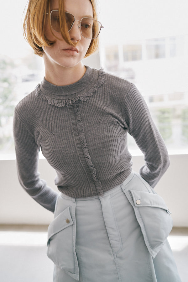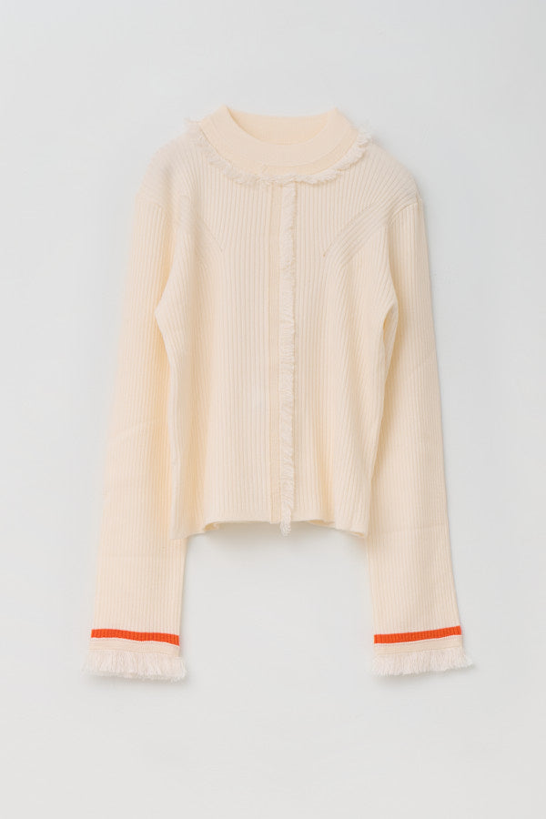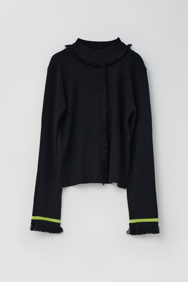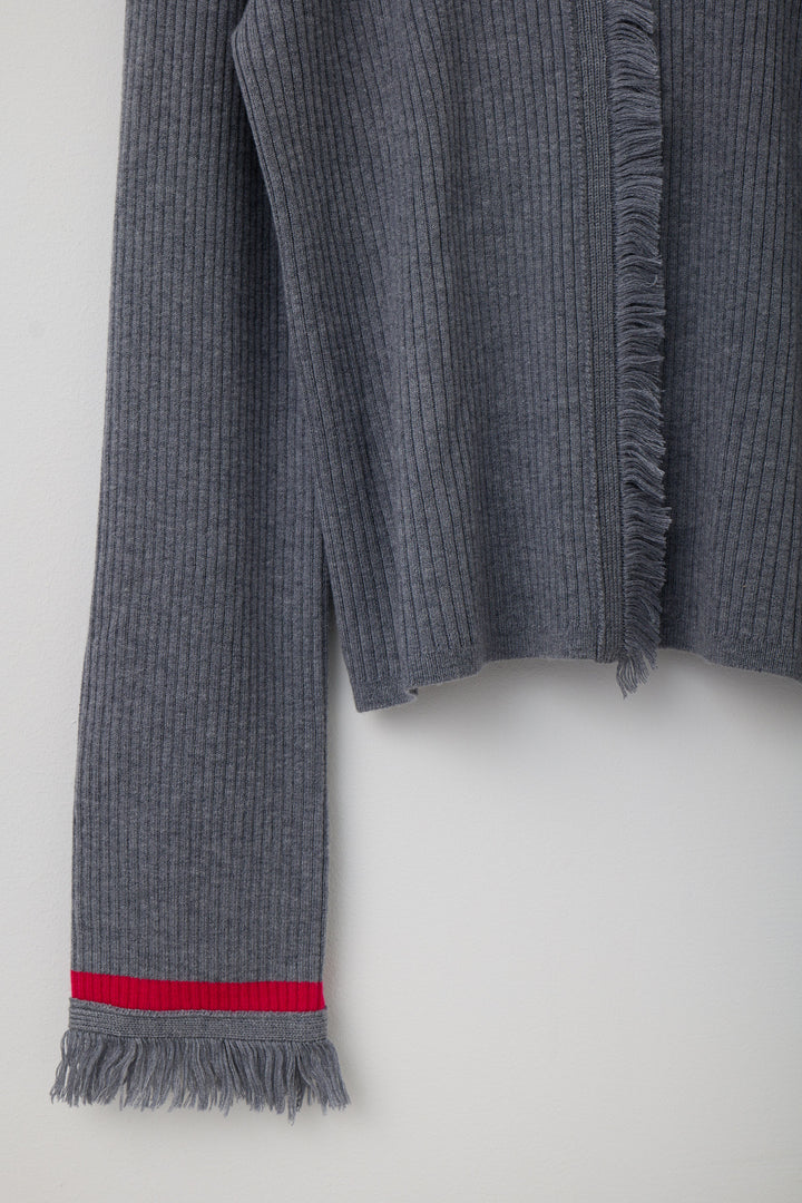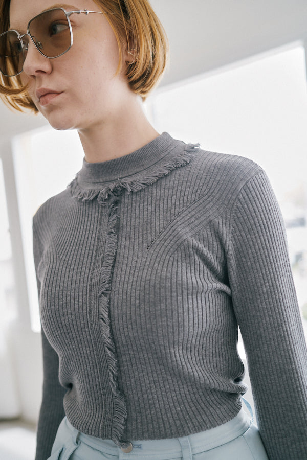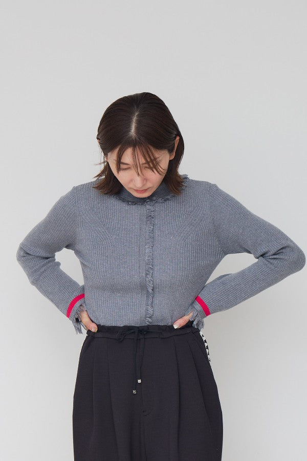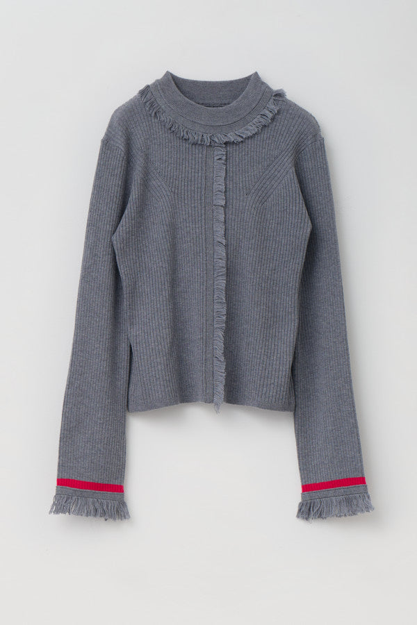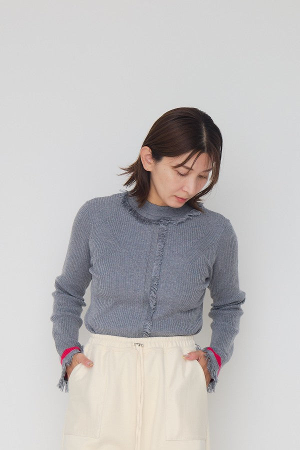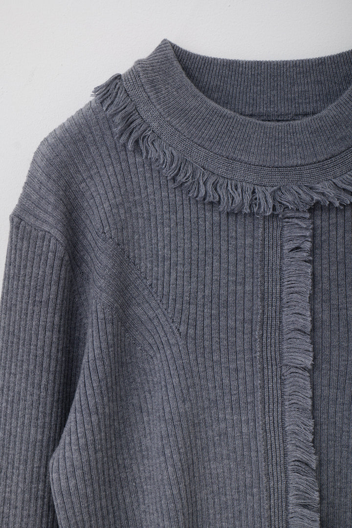 リブ編みをベースに、フリンジディテールを取り入れたデザインニット。首元から前立て、袖口にかけてあしらわれたフリンジが、シンプルなシルエットにさりげない動きをプラスしています。