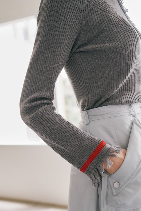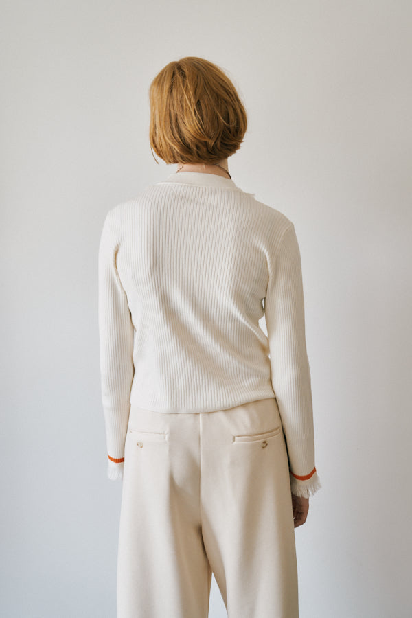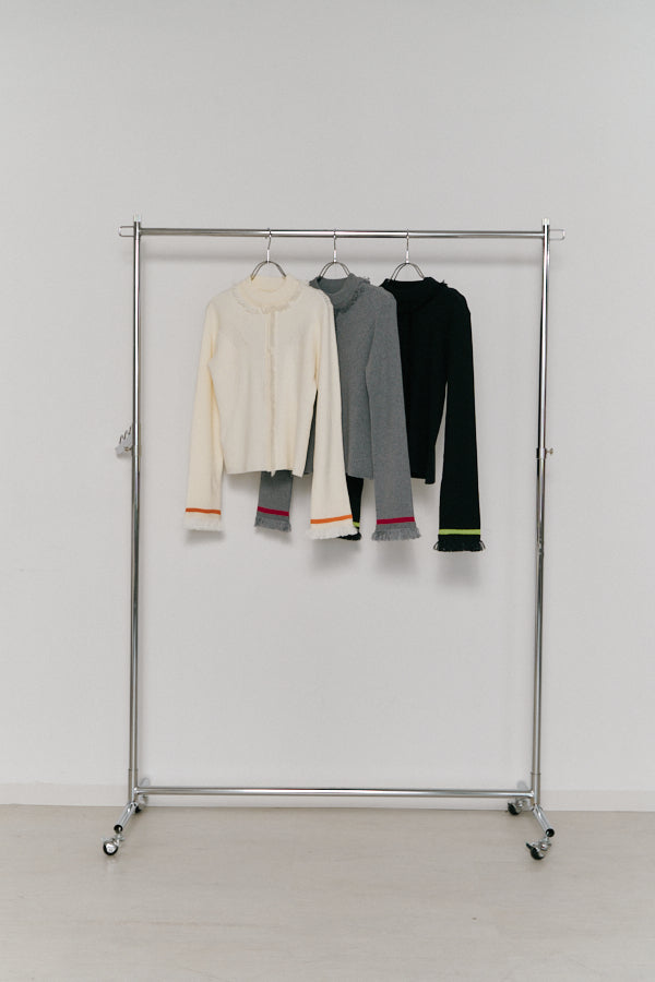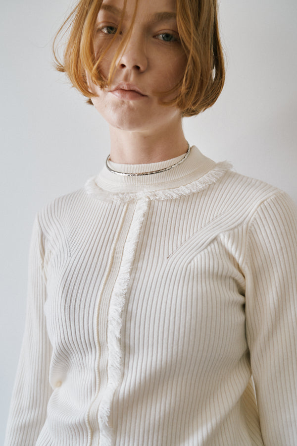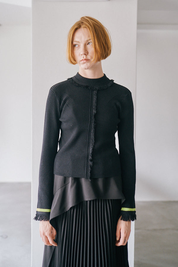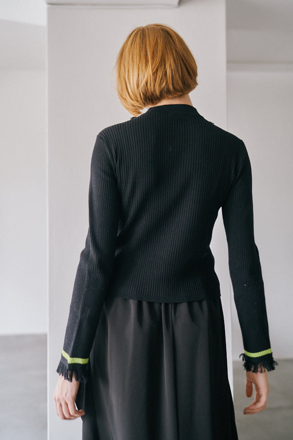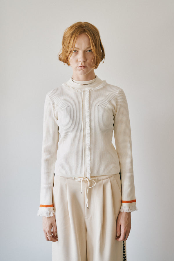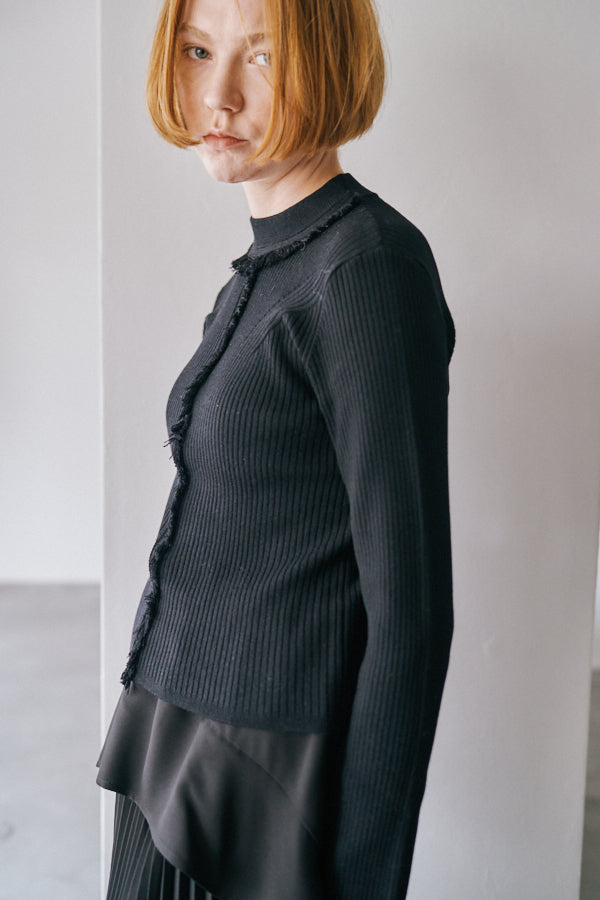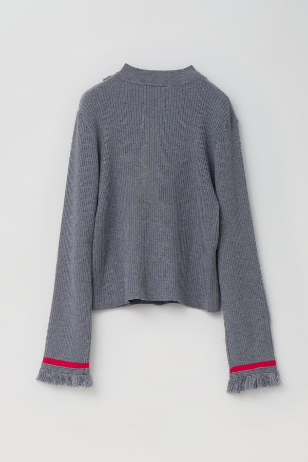 リブ編みをベースに、フリンジディテールを取り入れたデザインニット。首元から前立て、袖口にかけてあしらわれたフリンジが、シンプルなシルエットにさりげない動きをプラスしています。