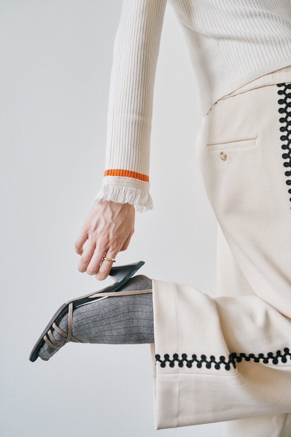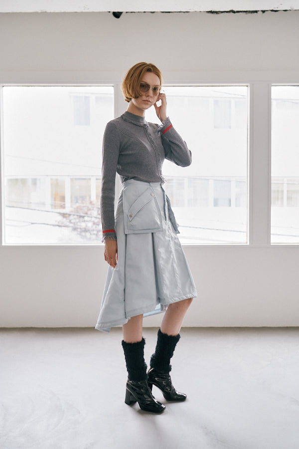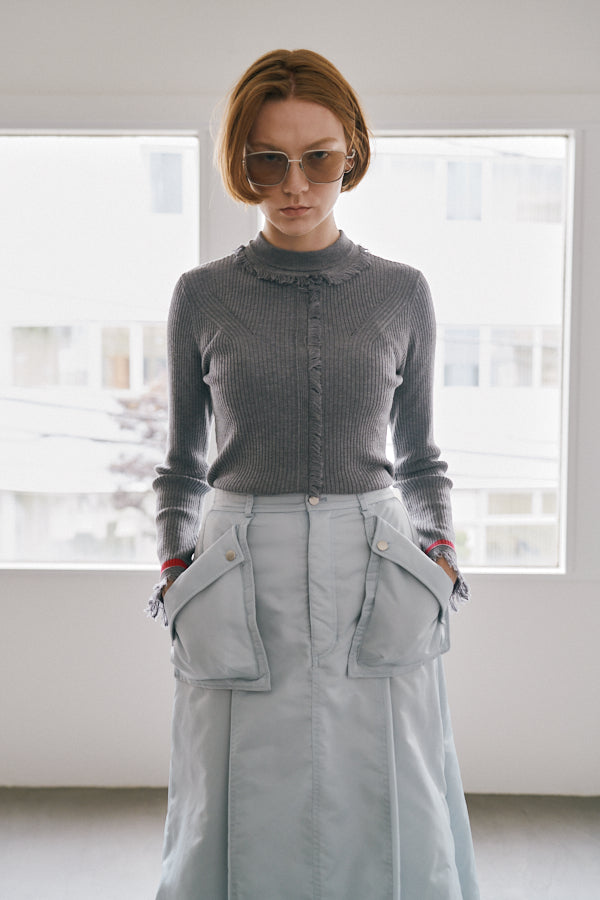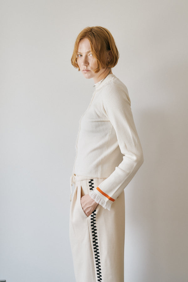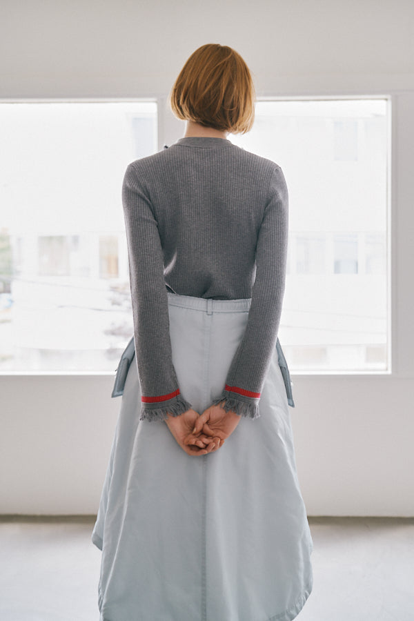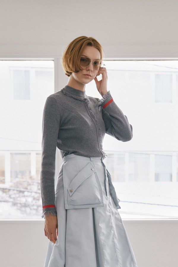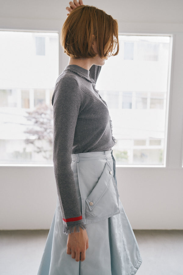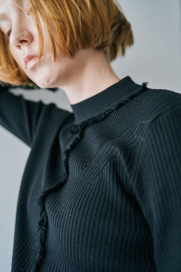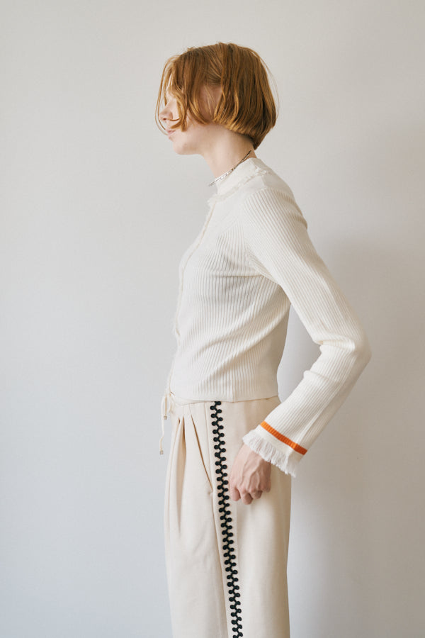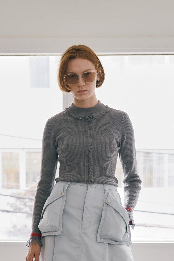 リブ編みをベースに、フリンジディテールを取り入れたデザインニット。首元から前立て、袖口にかけてあしらわれたフリンジが、シンプルなシルエットにさりげない動きをプラスしています。