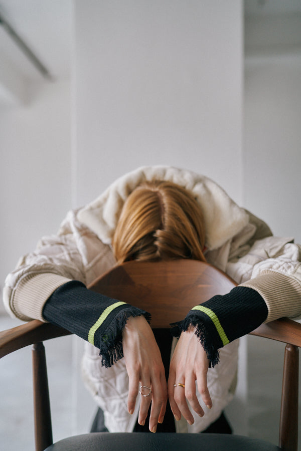 さらに袖口には蛍光カラーのラインを加え、アクセントの効いたモードな印象に。ベーシックな色合いの中に鮮やかなポイントが映え、コーディネートに遊び心を取り入れられる一枚です。