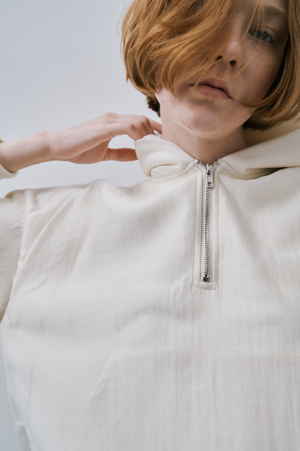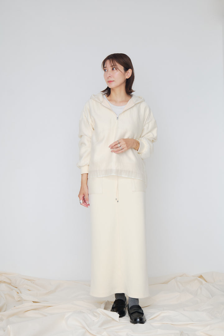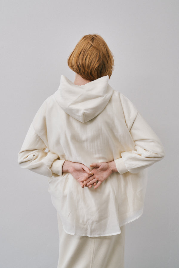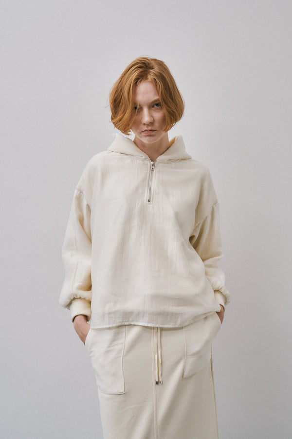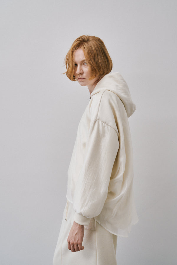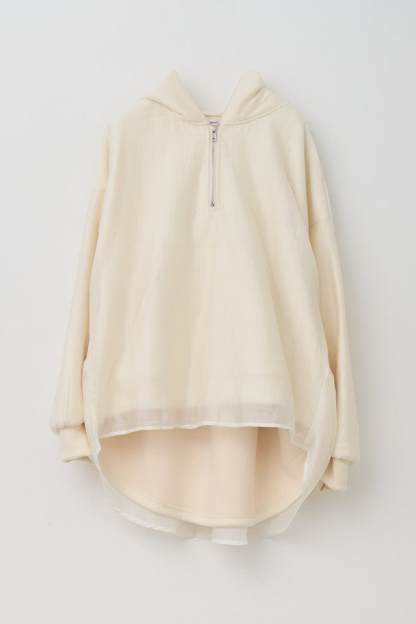 表情のあるポンチ素材と軽やかなシアー素材をドッキングしたデザインパーカー。