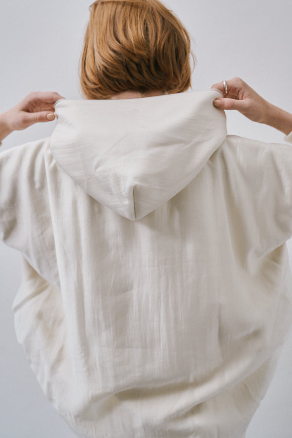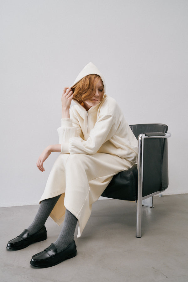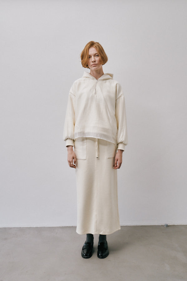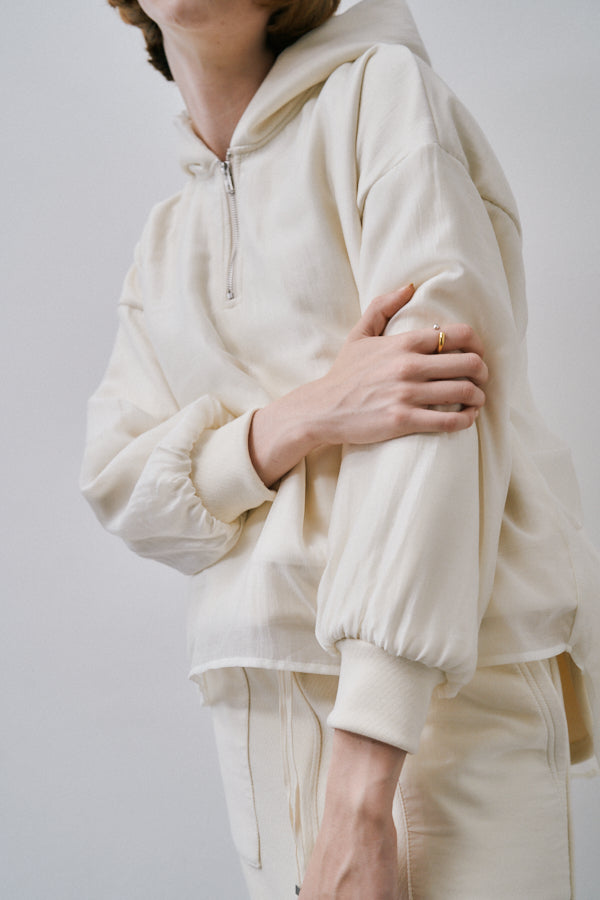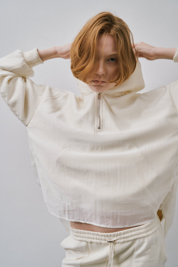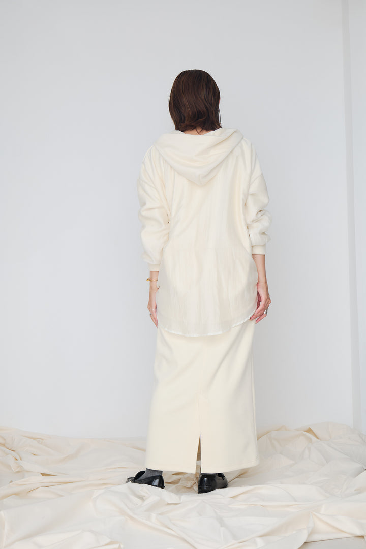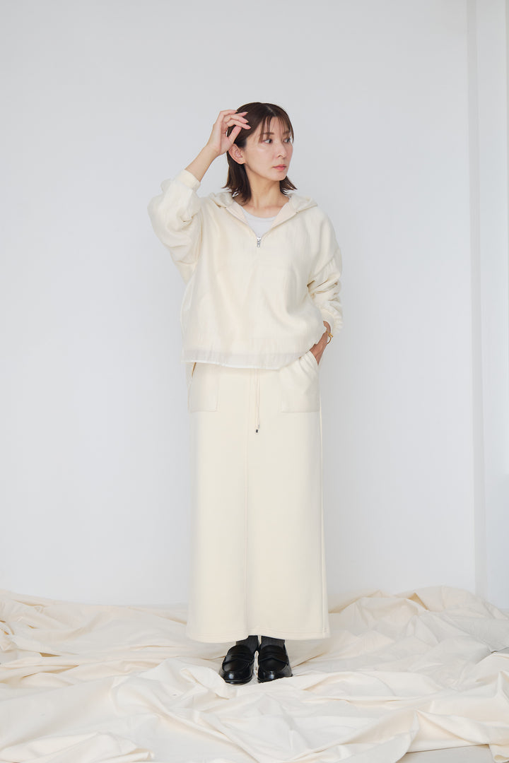 表情のあるポンチ素材と軽やかなシアー素材をドッキングしたデザインパーカー。