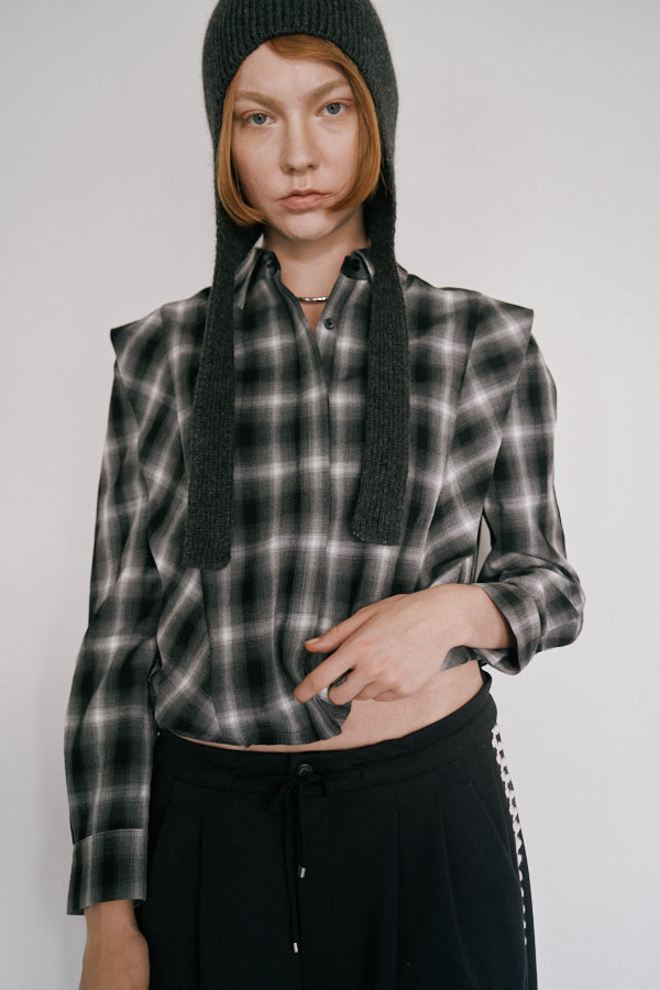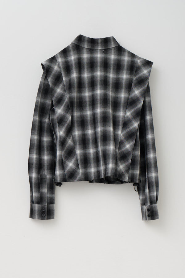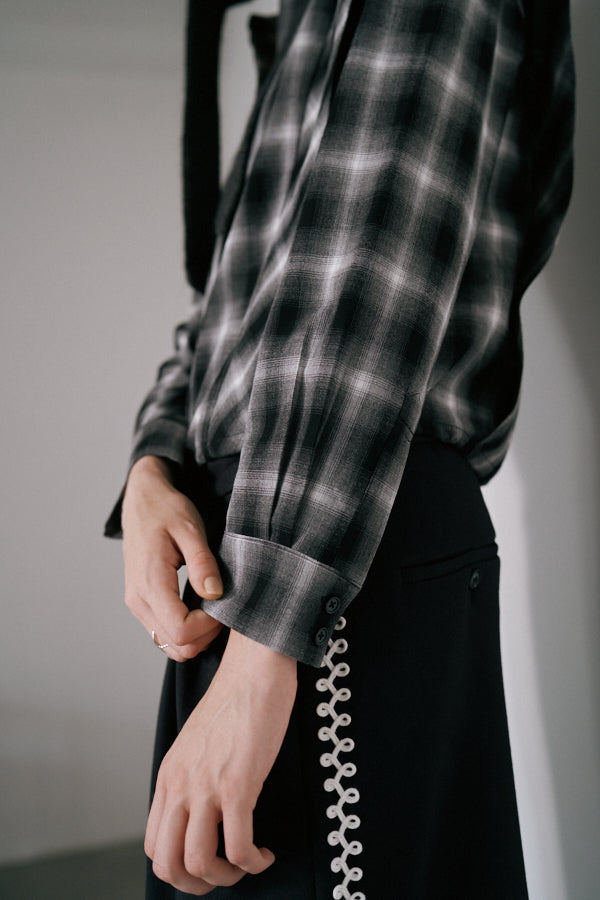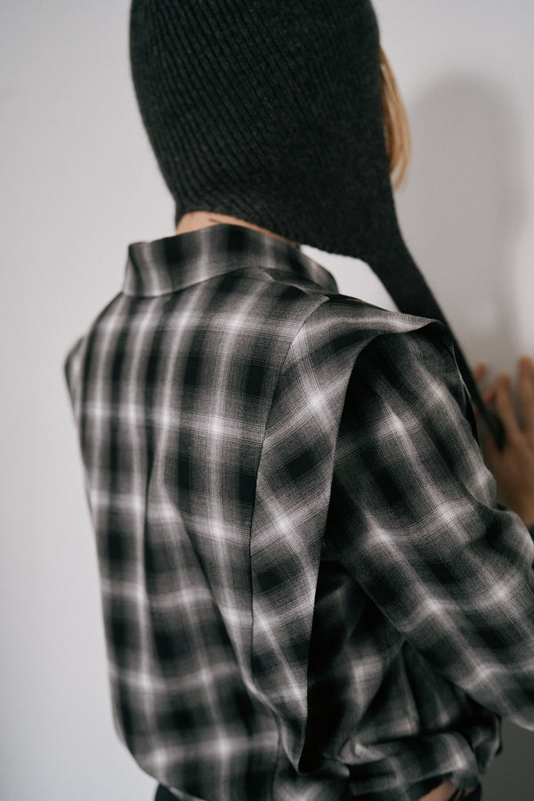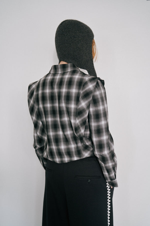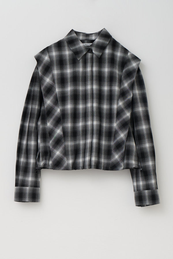 チェック柄が印象的なシャツブラウス。クラシックなデザインにモードな要素を取り入れた一枚で、スタイルの主役になるアイテムです。肩の切り替えラインや立体感のあるシルエットが特徴で、羽織るだけで存在感を演出してくれます。