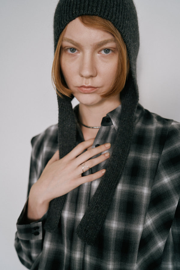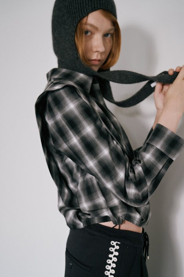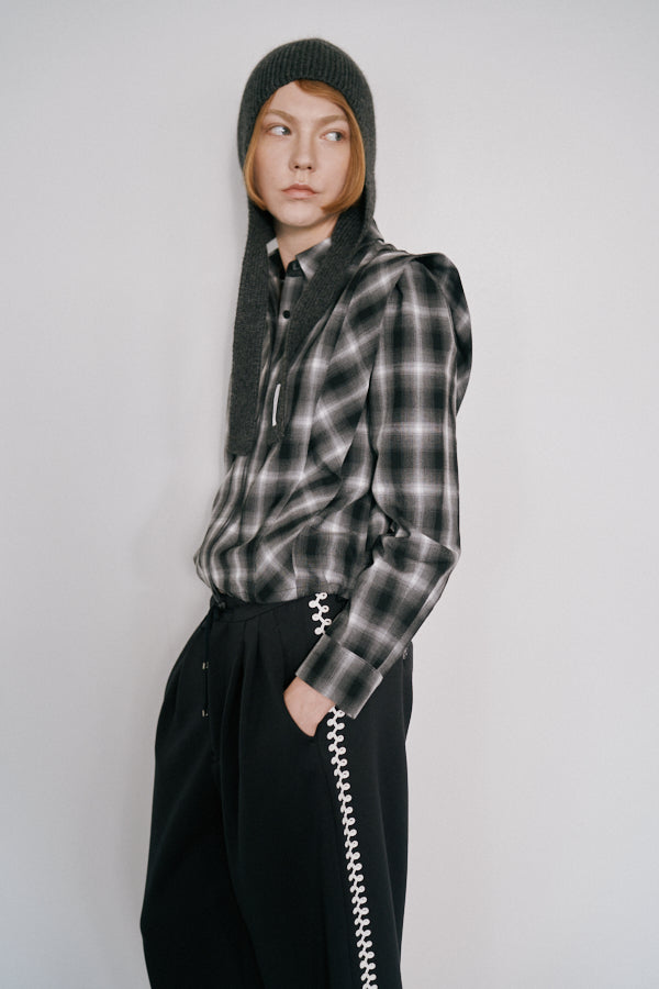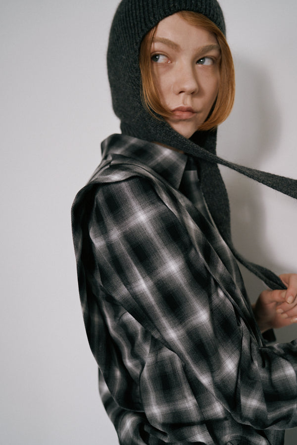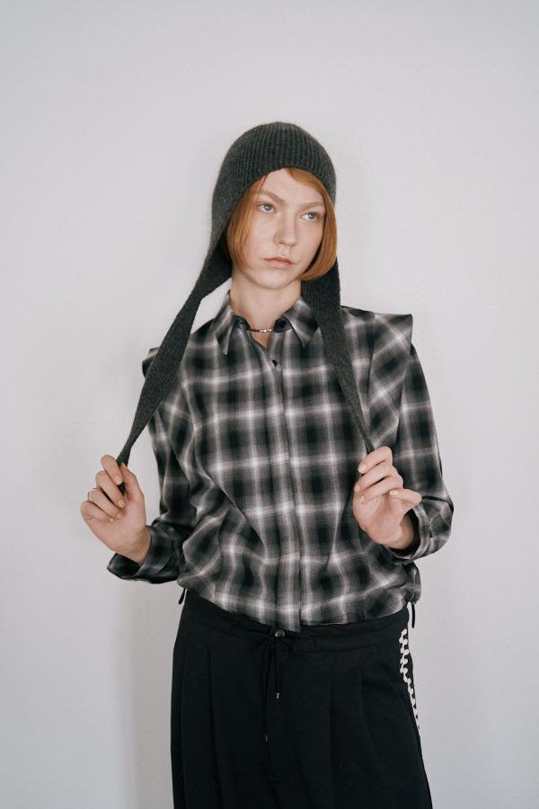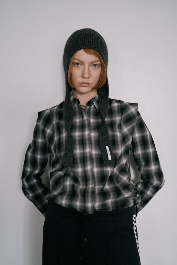チェック柄が印象的なシャツブラウス。クラシックなデザインにモードな要素を取り入れた一枚で、スタイルの主役になるアイテムです。肩の切り替えラインや立体感のあるシルエットが特徴で、羽織るだけで存在感を演出してくれます。