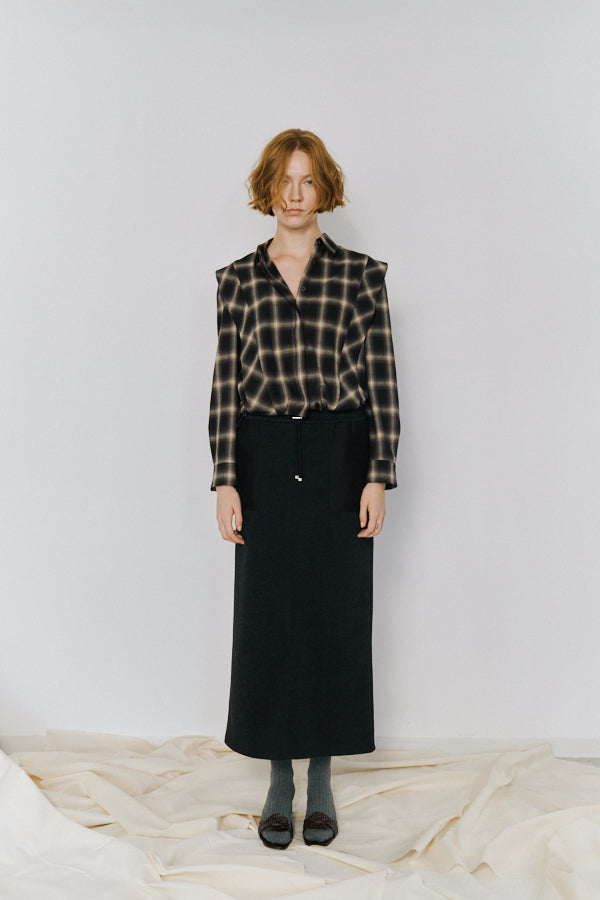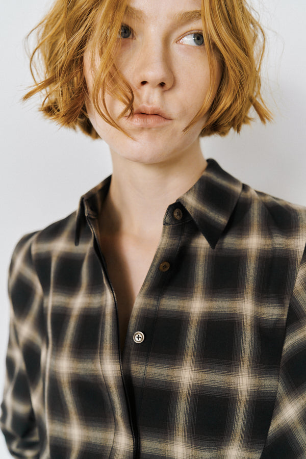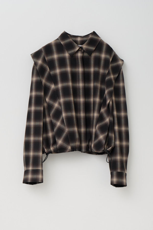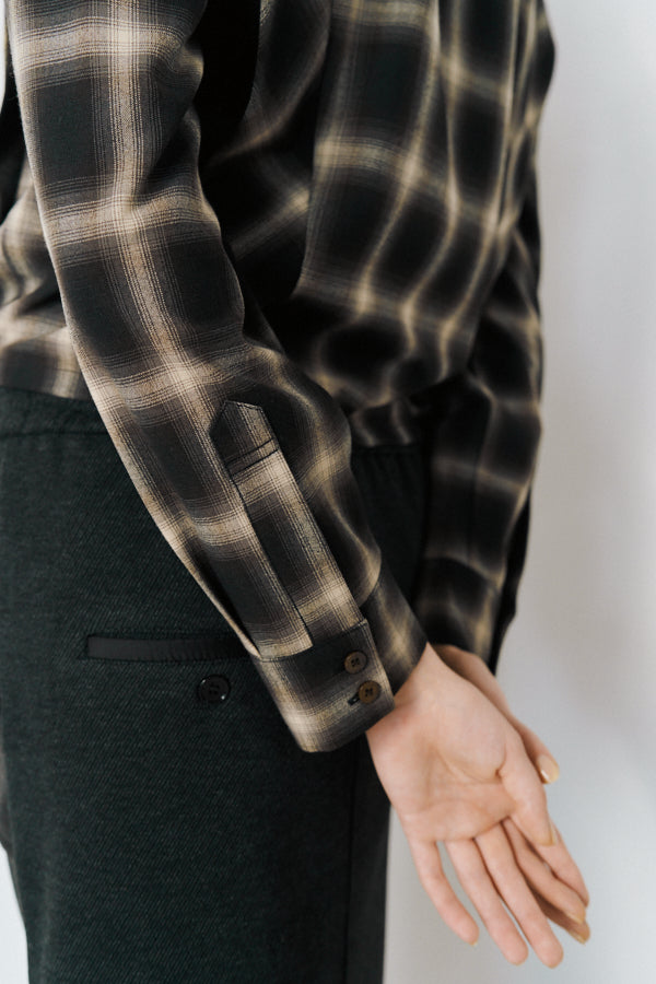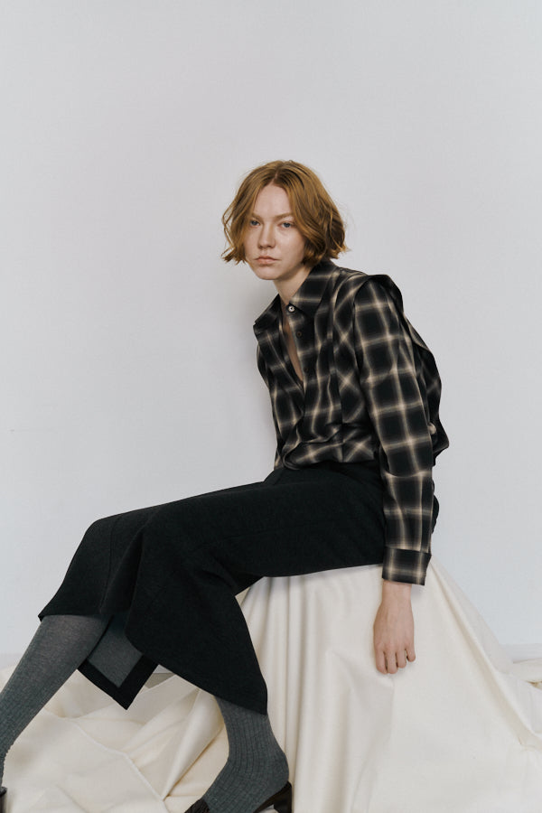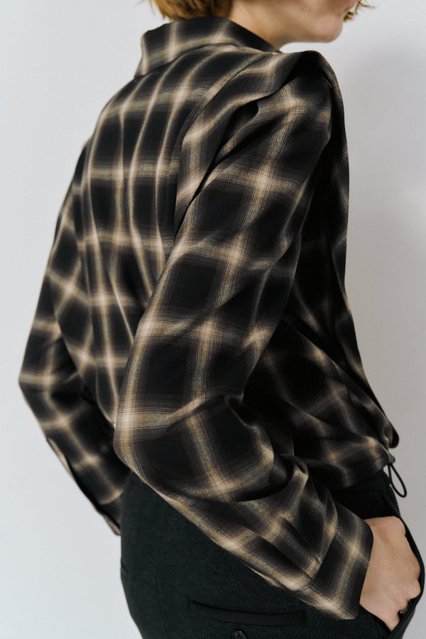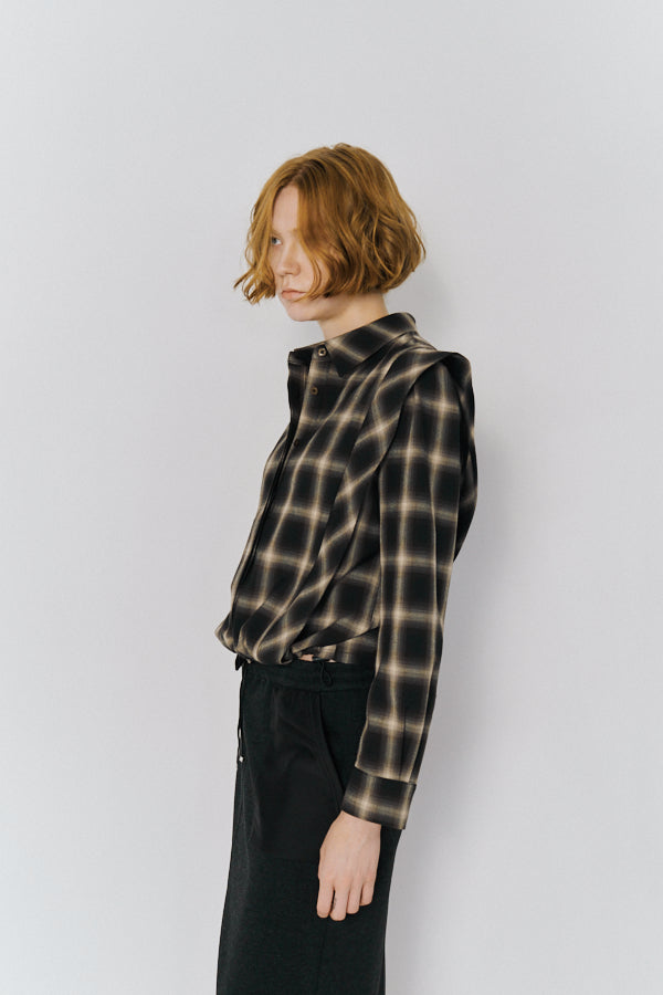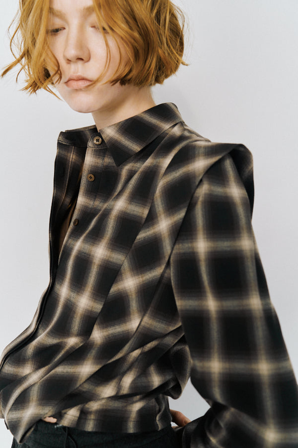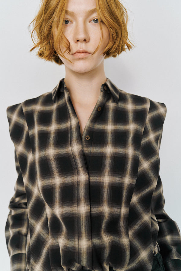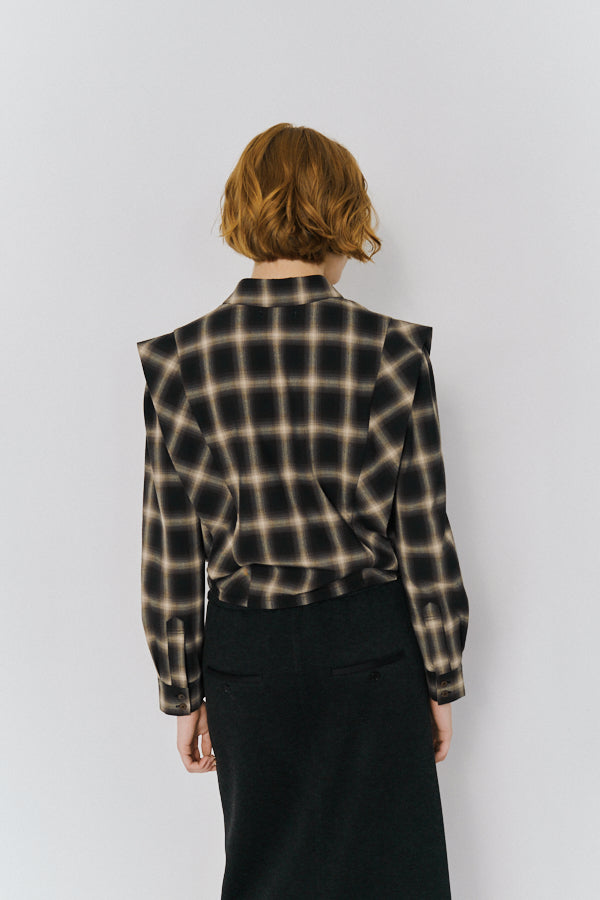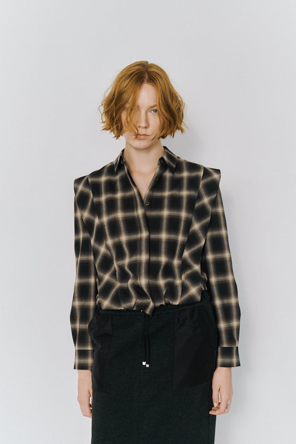 チェック柄が印象的なシャツブラウス。クラシックなデザインにモードな要素を取り入れた一枚で、スタイルの主役になるアイテムです。肩の切り替えラインや立体感のあるシルエットが特徴で、羽織るだけで存在感を演出してくれます。