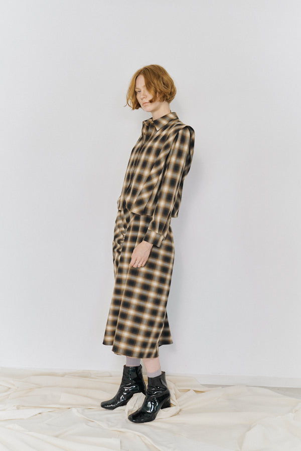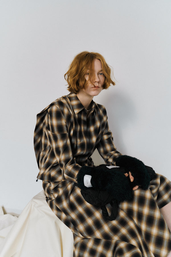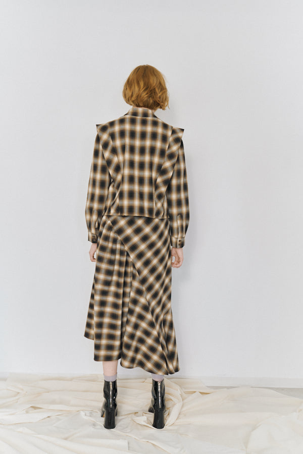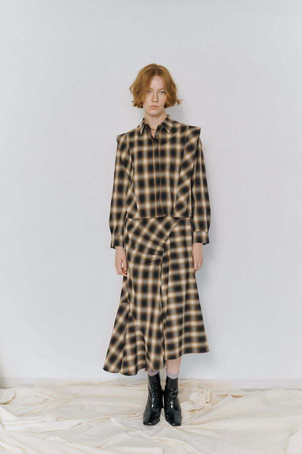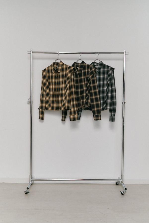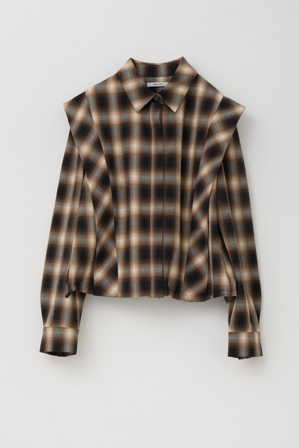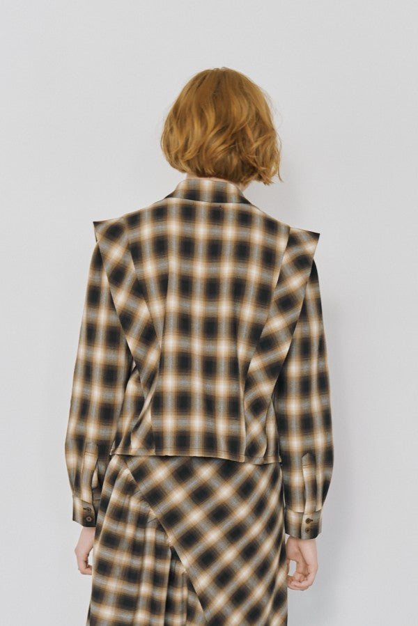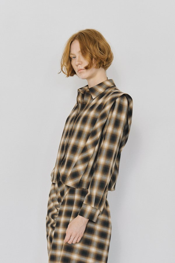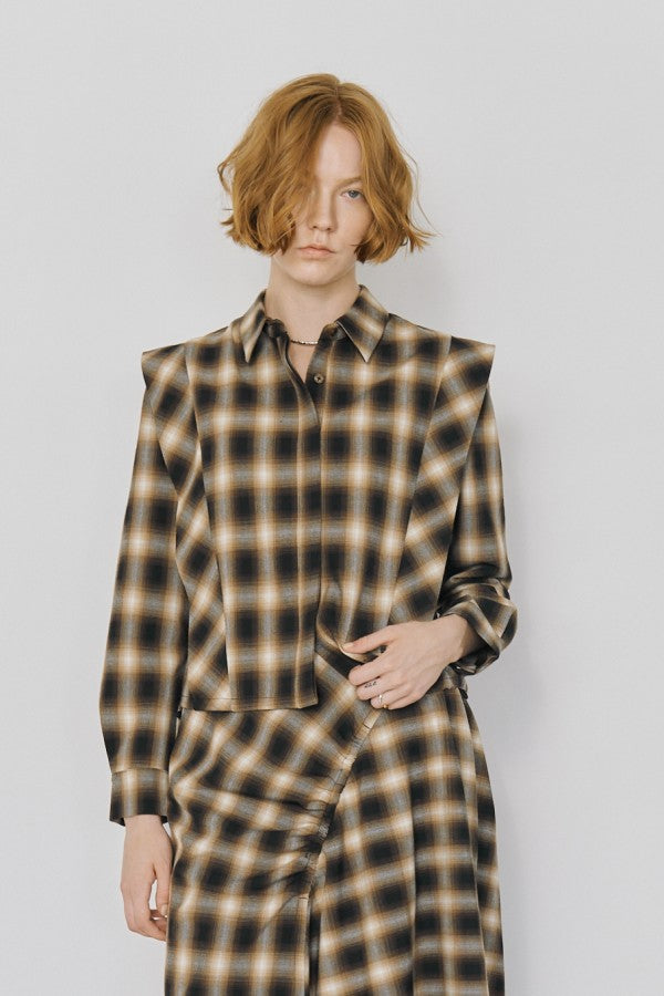 チェック柄が印象的なシャツブラウス。クラシックなデザインにモードな要素を取り入れた一枚で、スタイルの主役になるアイテムです。肩の切り替えラインや立体感のあるシルエットが特徴で、羽織るだけで存在感を演出してくれます。