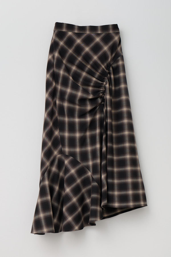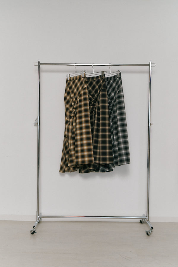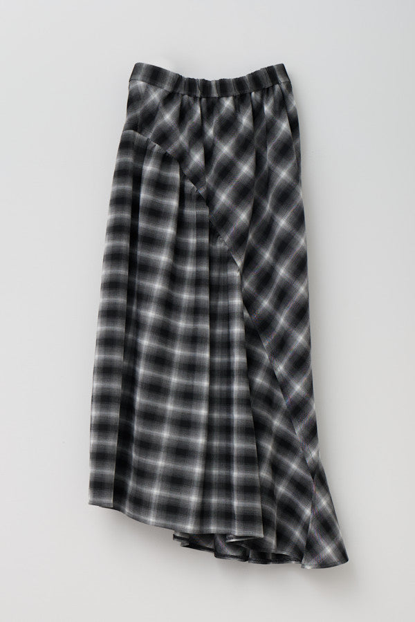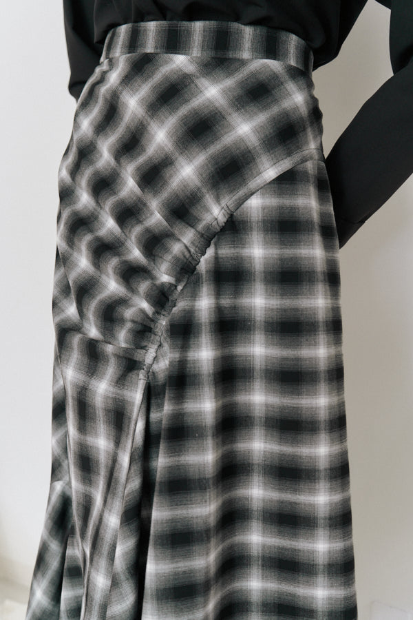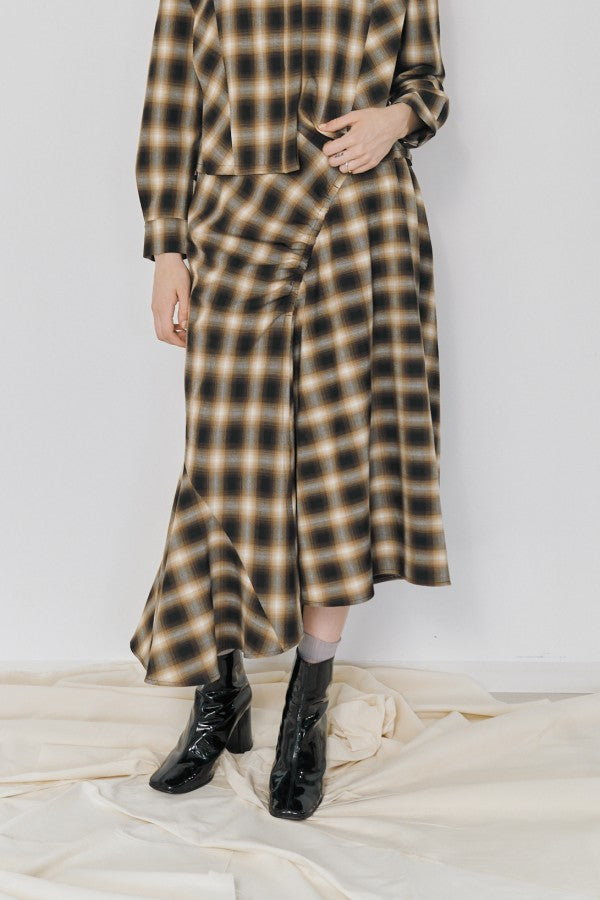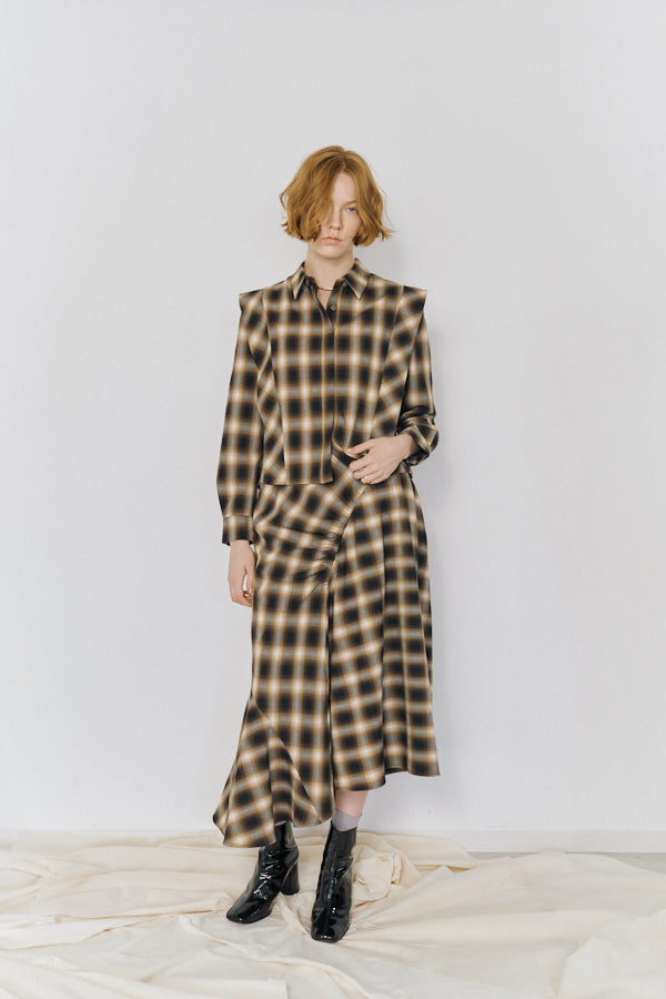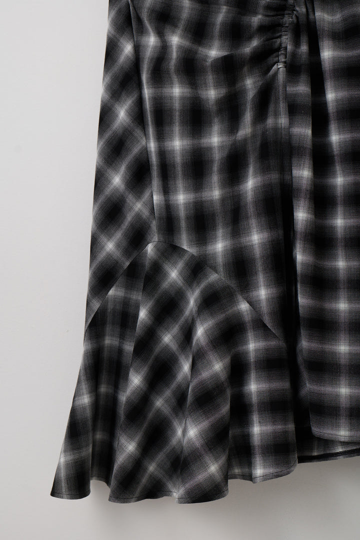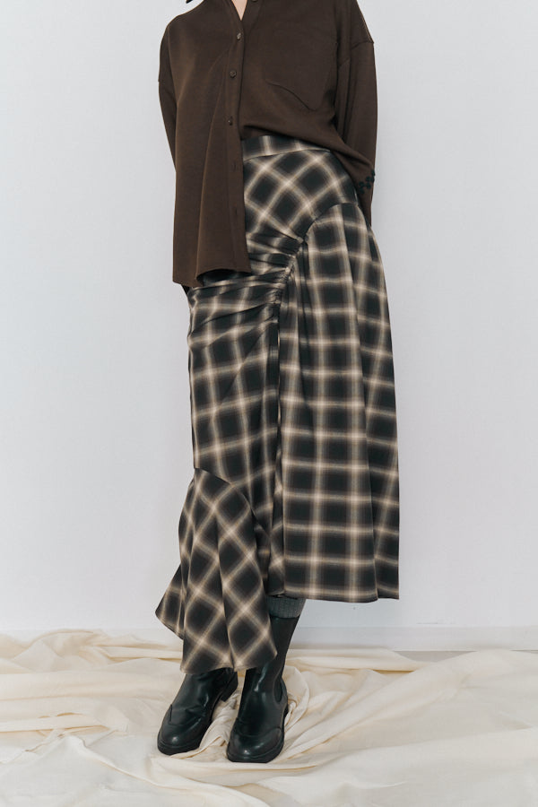 カジュアルになりすぎるチェック柄ですが、片側に寄せたギャザーとアシンメトリーなフレアで動きのある表情にすることで、クールかつモード感のあるデザインに仕上げました。