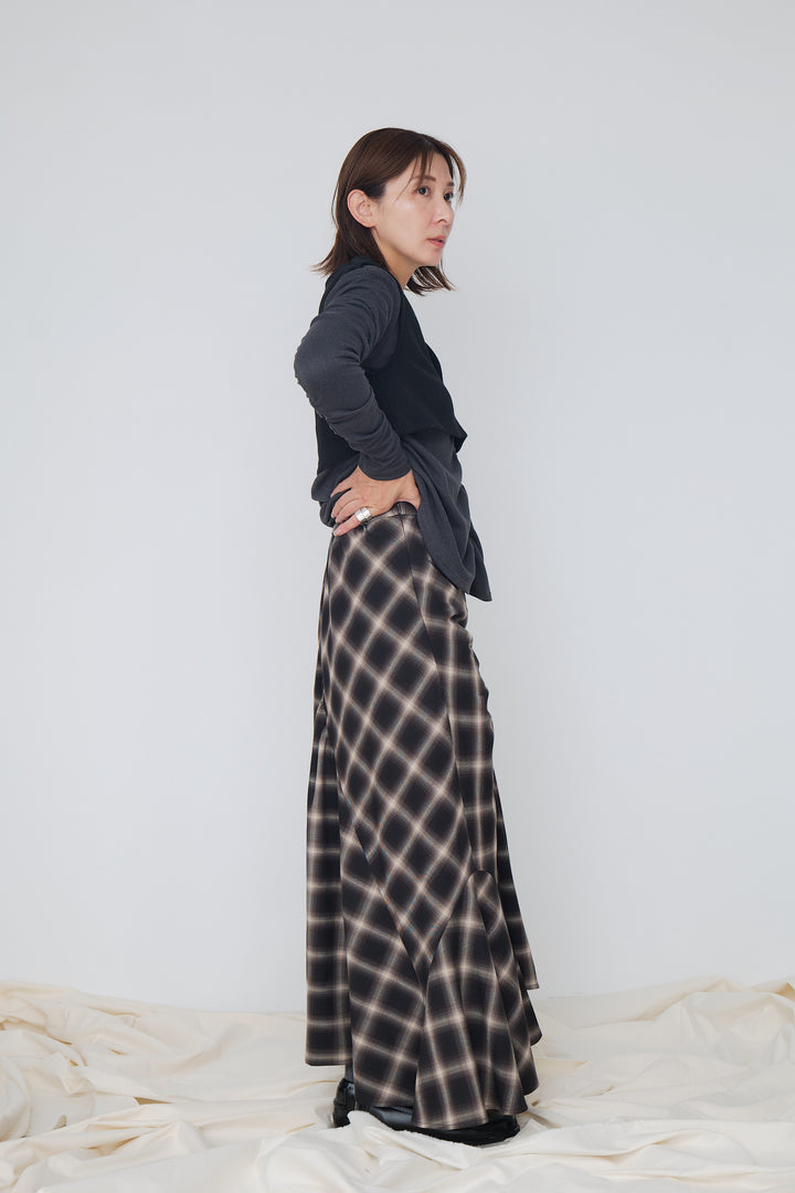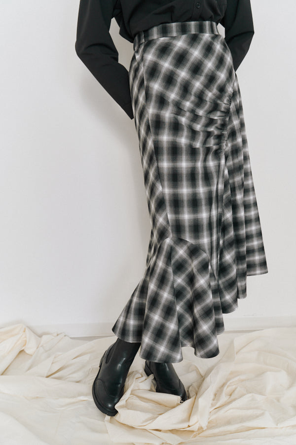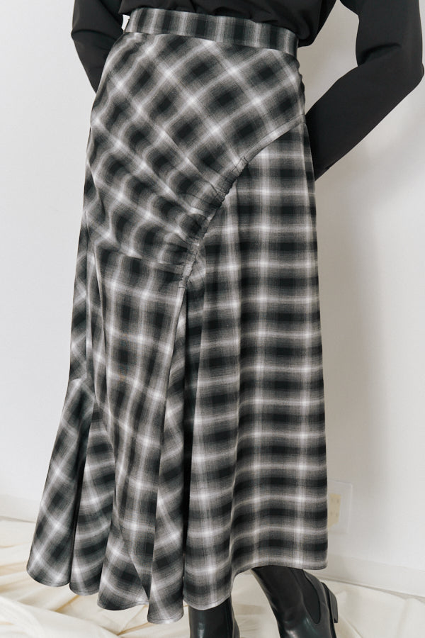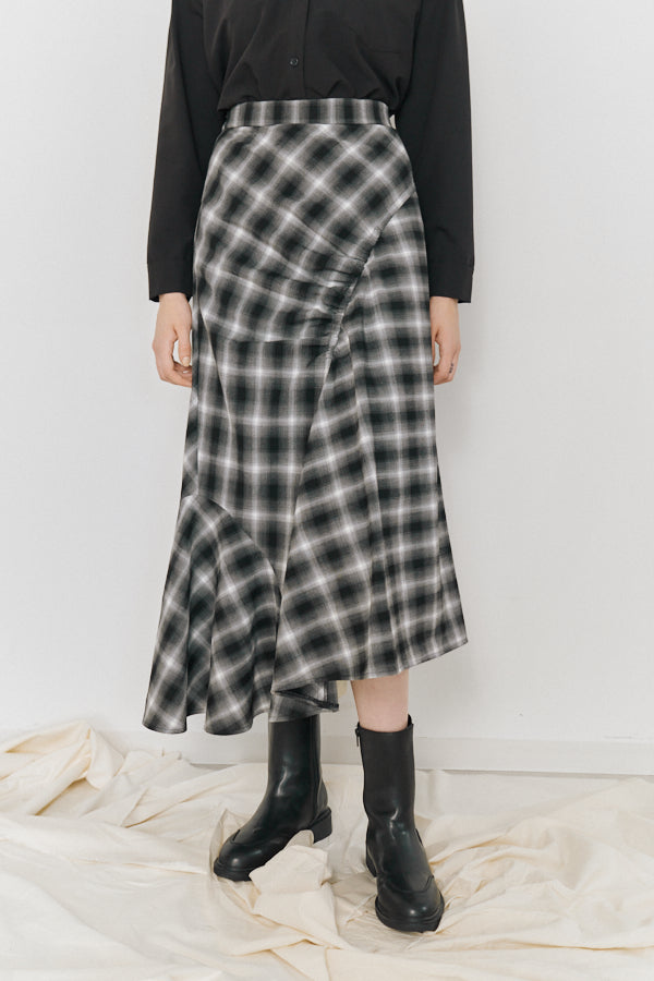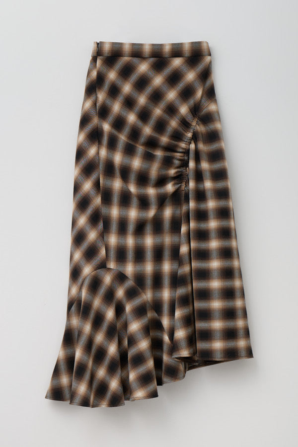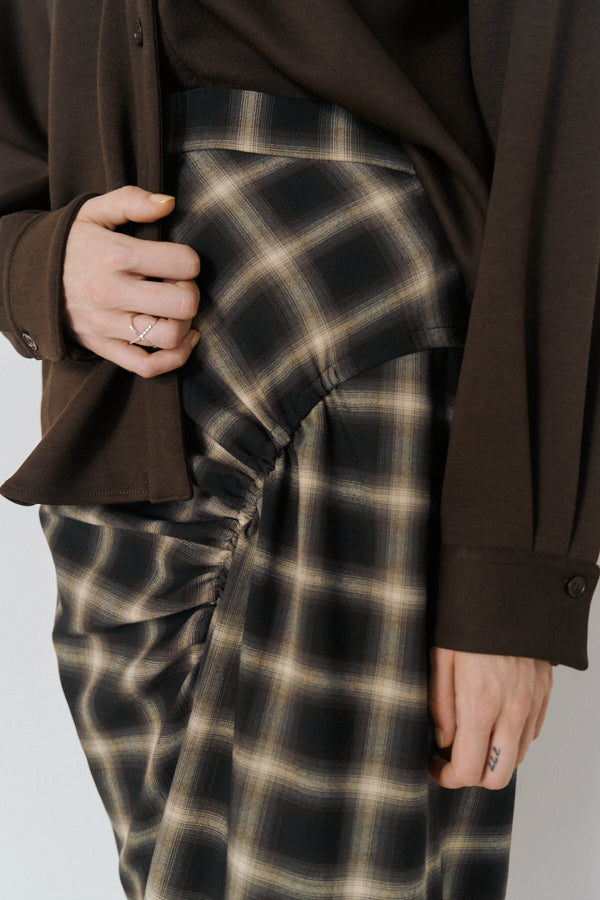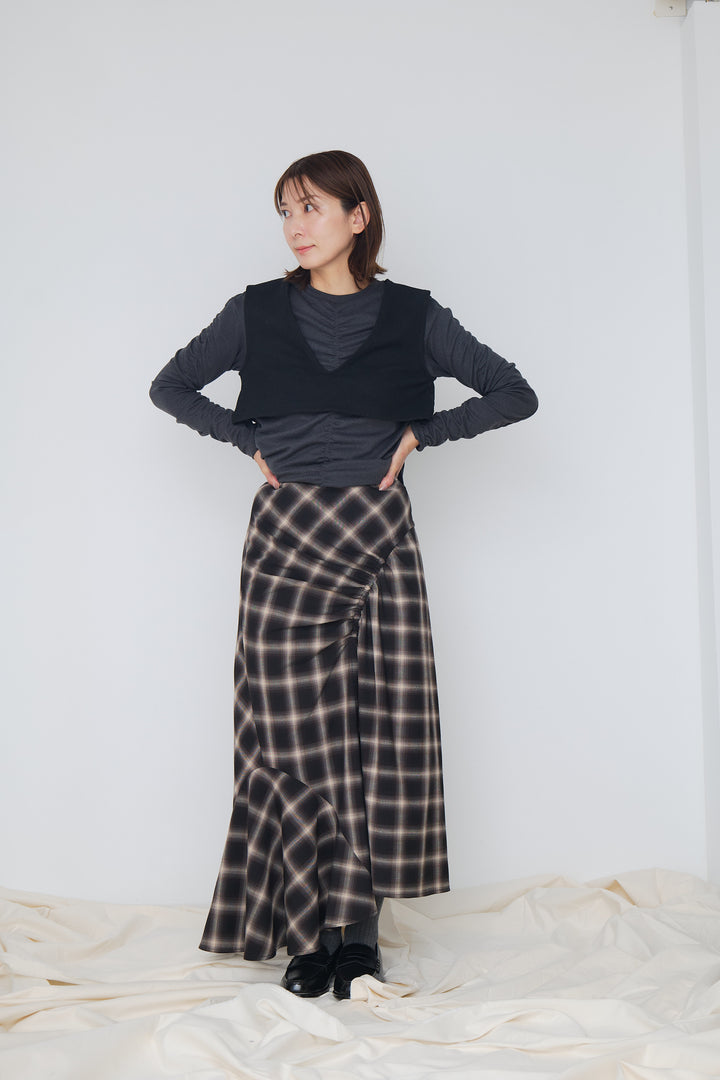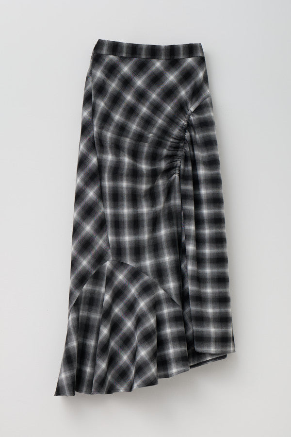 カジュアルになりすぎるチェック柄ですが、片側に寄せたギャザーとアシンメトリーなフレアで動きのある表情にすることで、クールかつモード感のあるデザインに仕上げました。