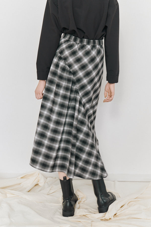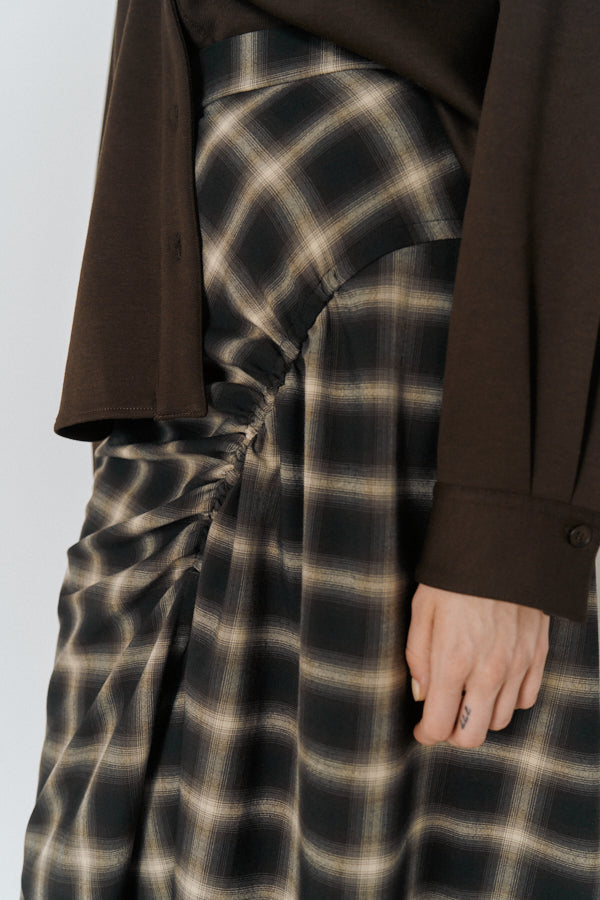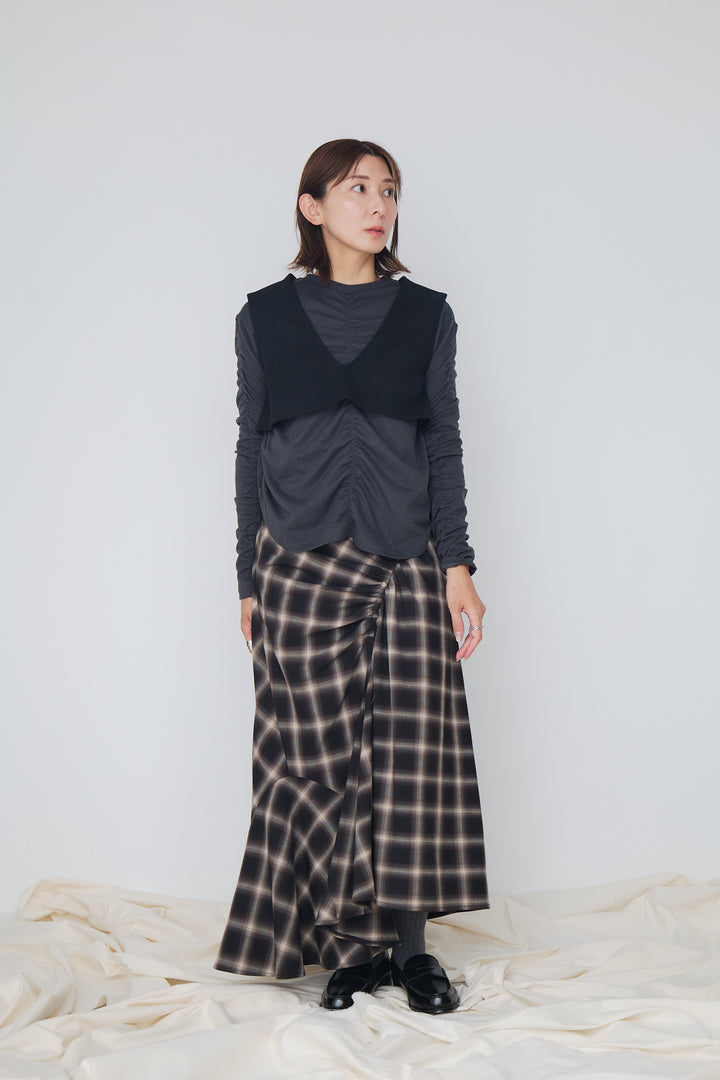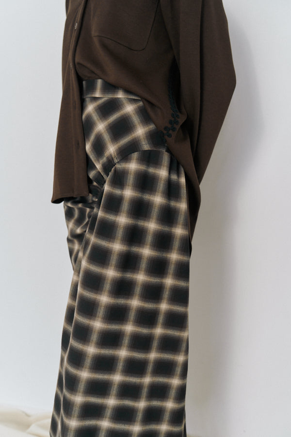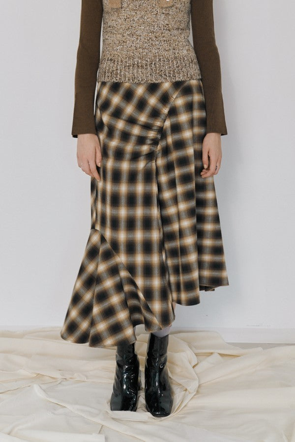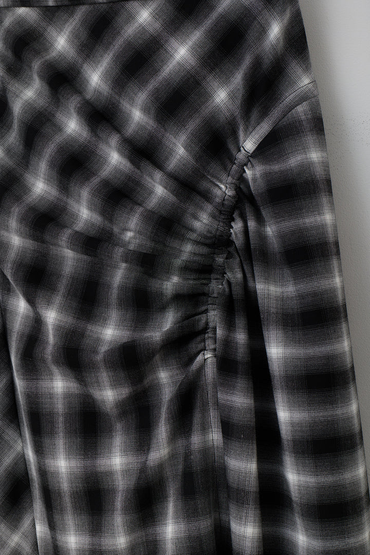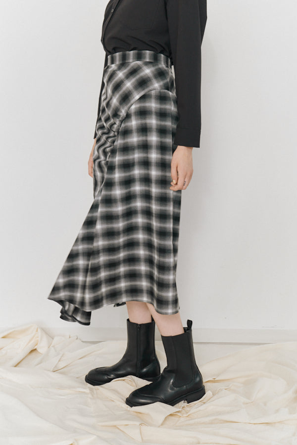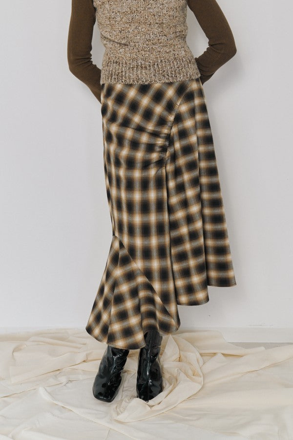 カジュアルになりすぎるチェック柄ですが、片側に寄せたギャザーとアシンメトリーなフレアで動きのある表情にすることで、クールかつモード感のあるデザインに仕上げました。