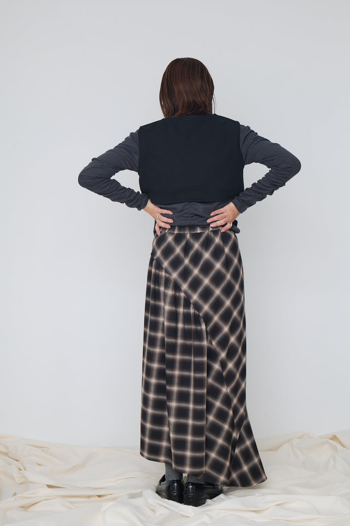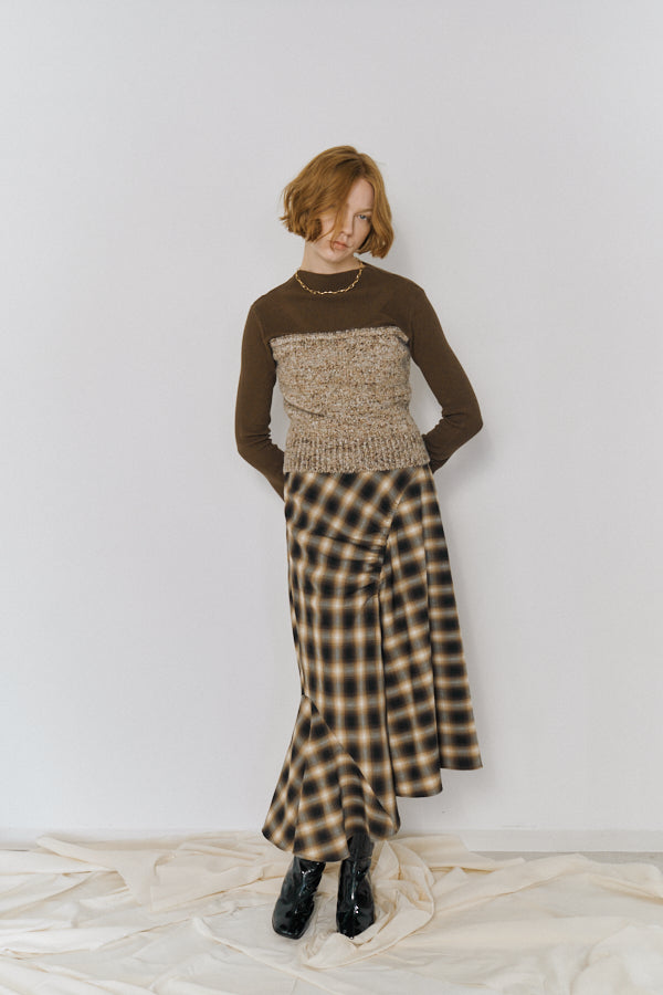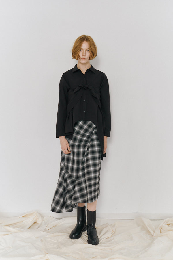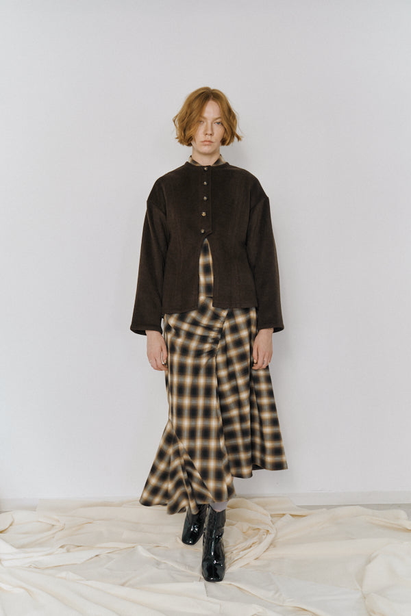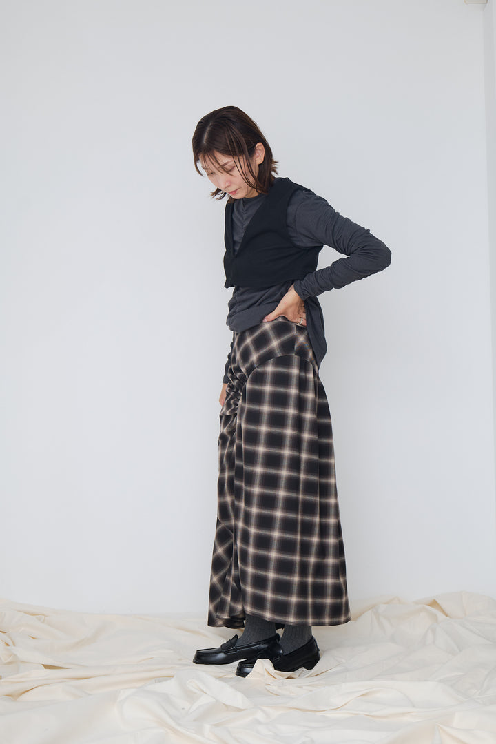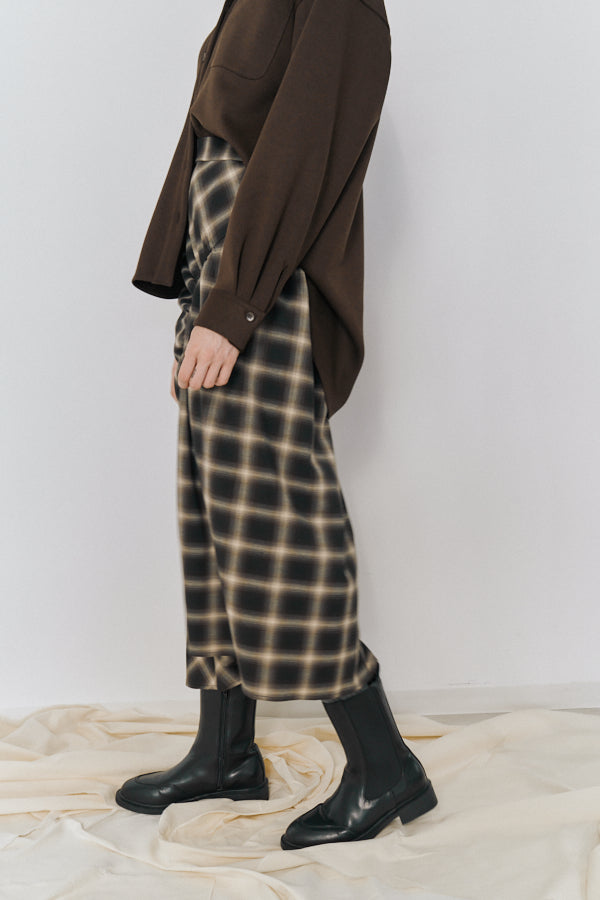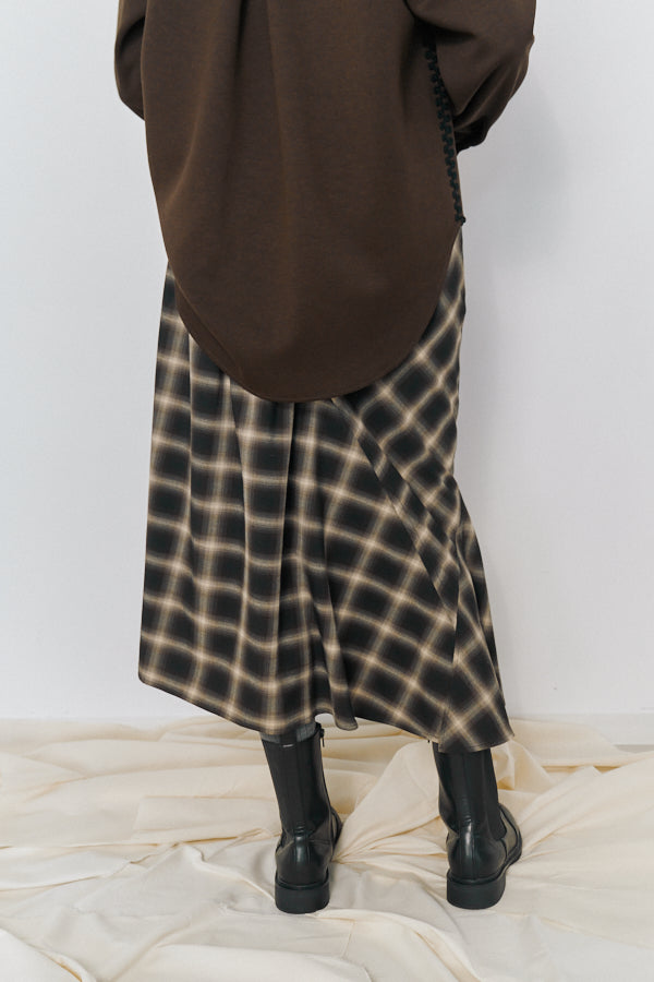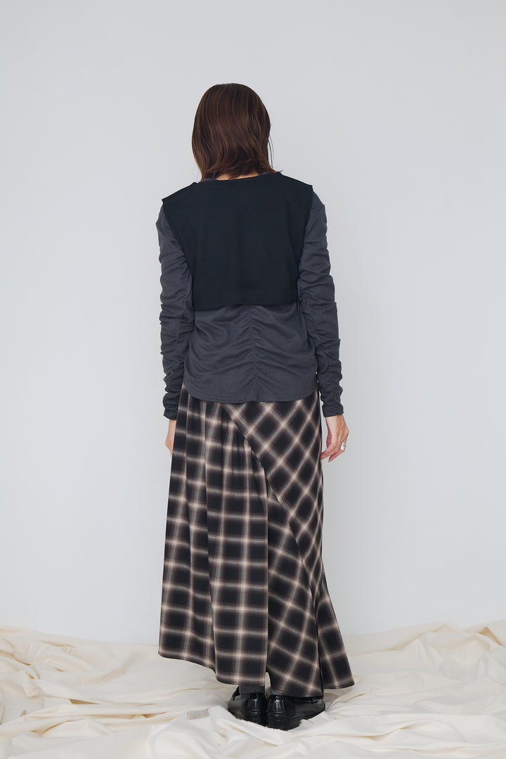 カジュアルになりすぎるチェック柄ですが、片側に寄せたギャザーとアシンメトリーなフレアで動きのある表情にすることで、クールかつモード感のあるデザインに仕上げました。