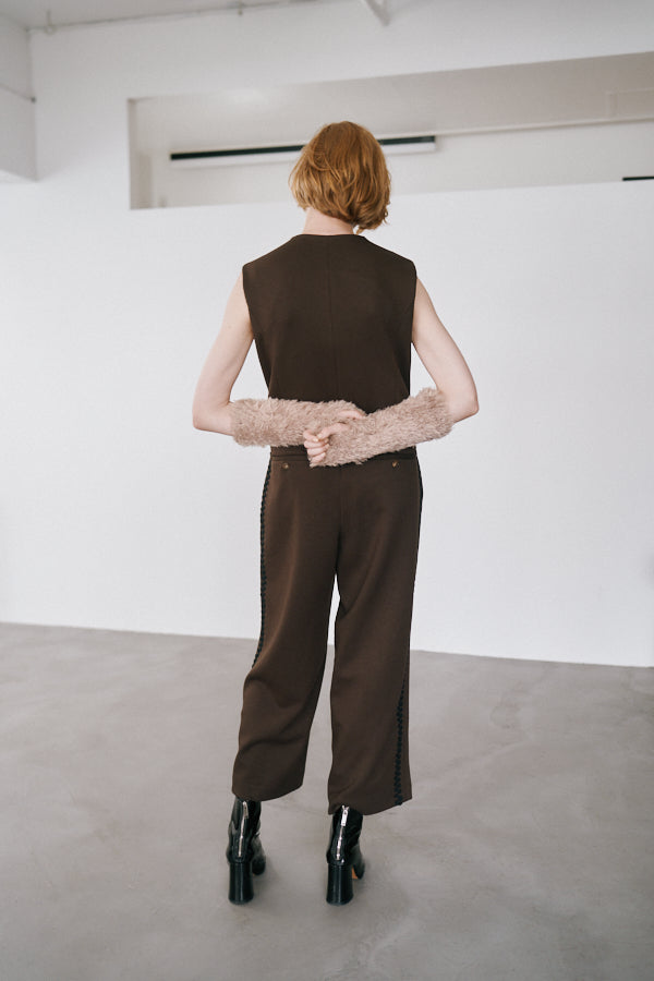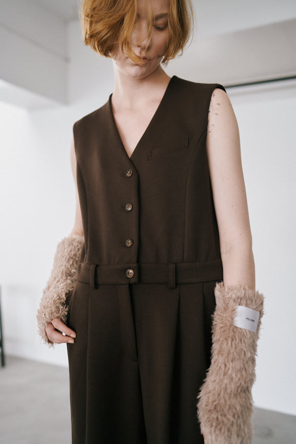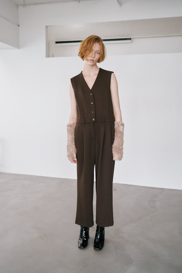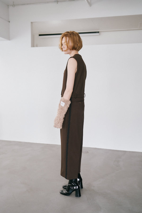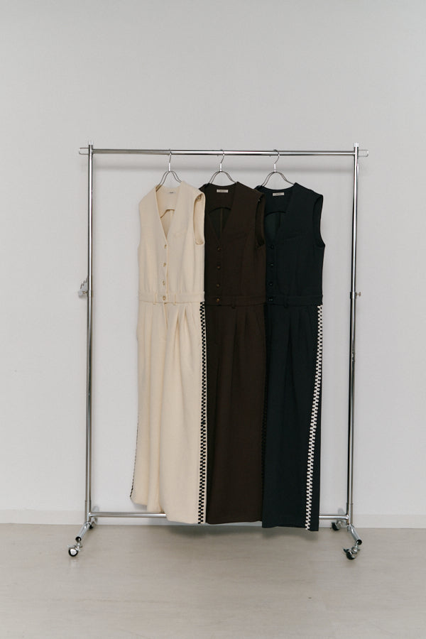 サイドにあしらわれたオリジナルコード刺繍がポイントのノースリーブオールインワン。クラシックな雰囲気のVネックデザインとフロントボタンがきちんと感を演出しつつ、刺繍ディテールが個性を引き立てます。