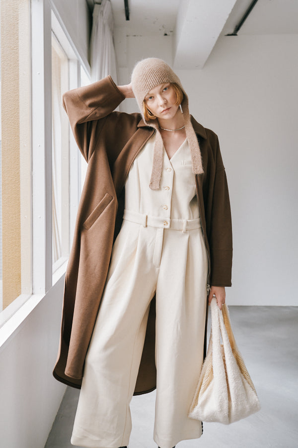 ゆったりとしたワイドシルエットのパンツ部分は動きやすく、スタイルをすっきりと見せてくれます。インナー次第で季節を問わず着こなせるのも魅力です。