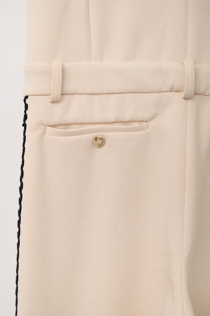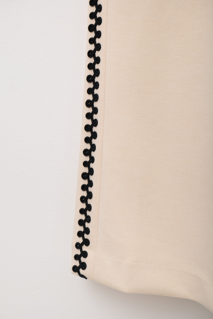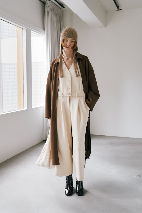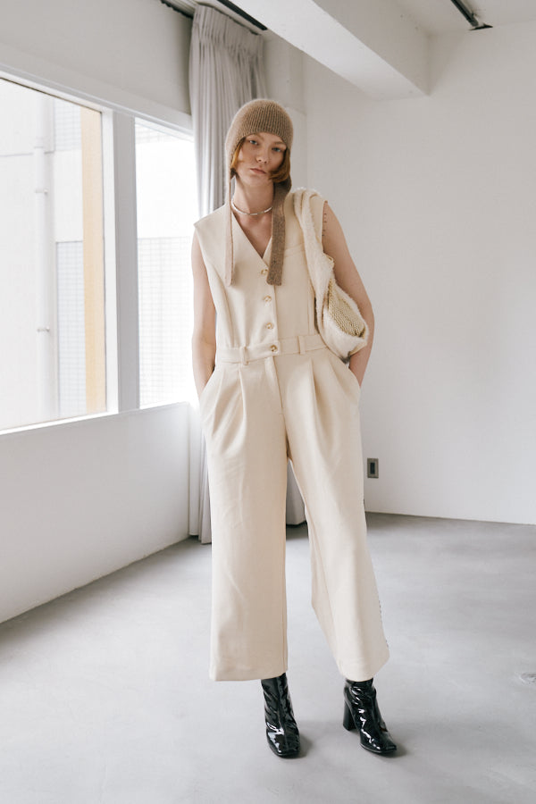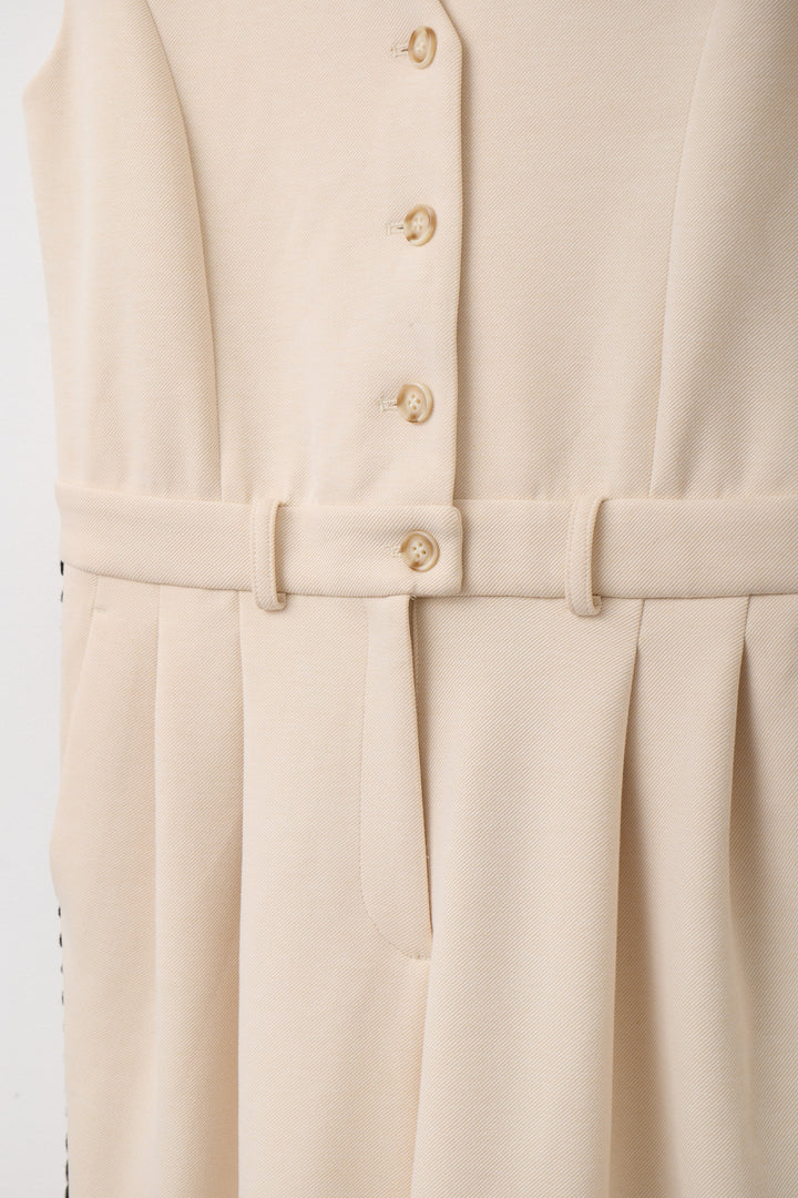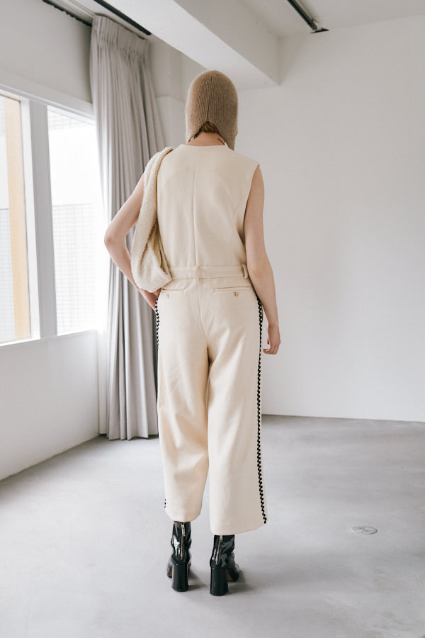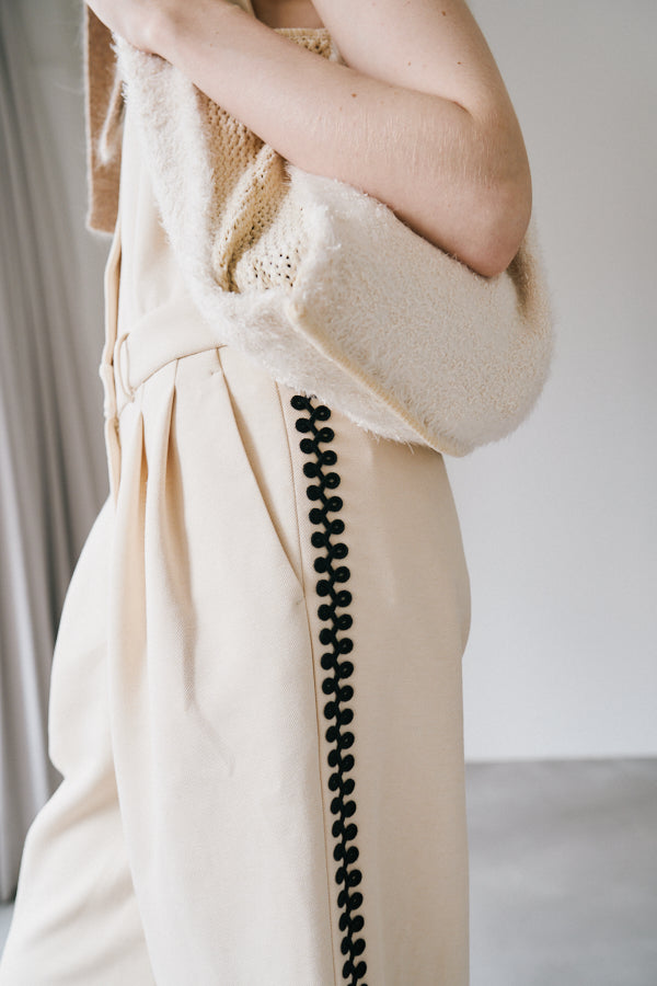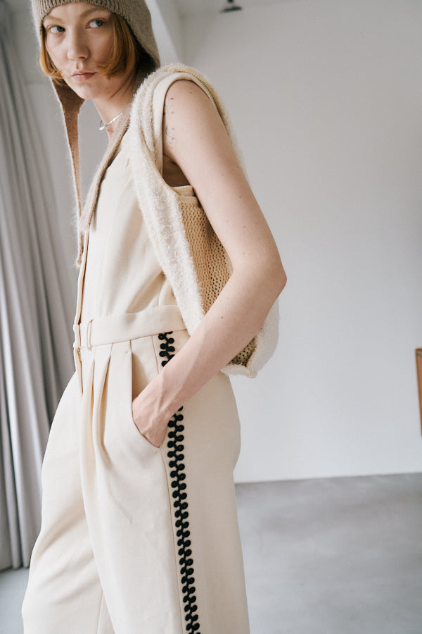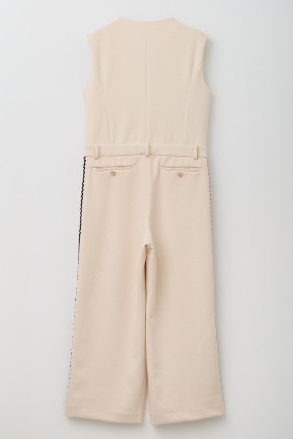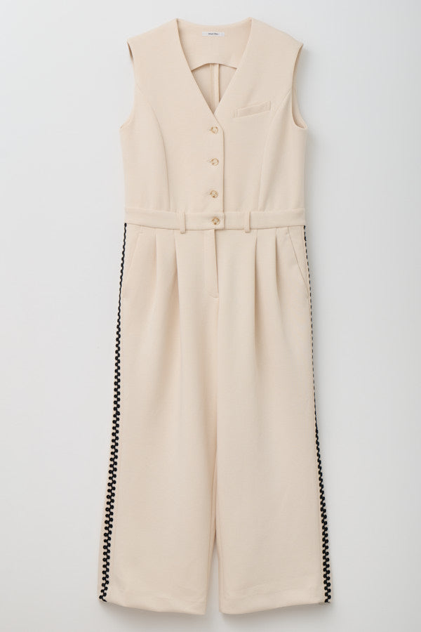 サイドにあしらわれたオリジナルコード刺繍がポイントのノースリーブオールインワン。クラシックな雰囲気のVネックデザインとフロントボタンがきちんと感を演出しつつ、刺繍ディテールが個性を引き立てます。