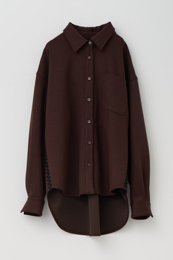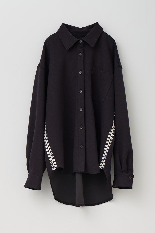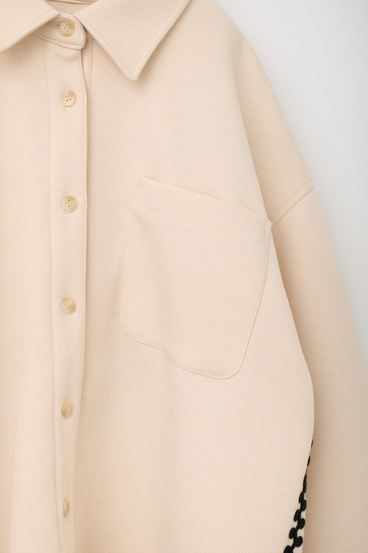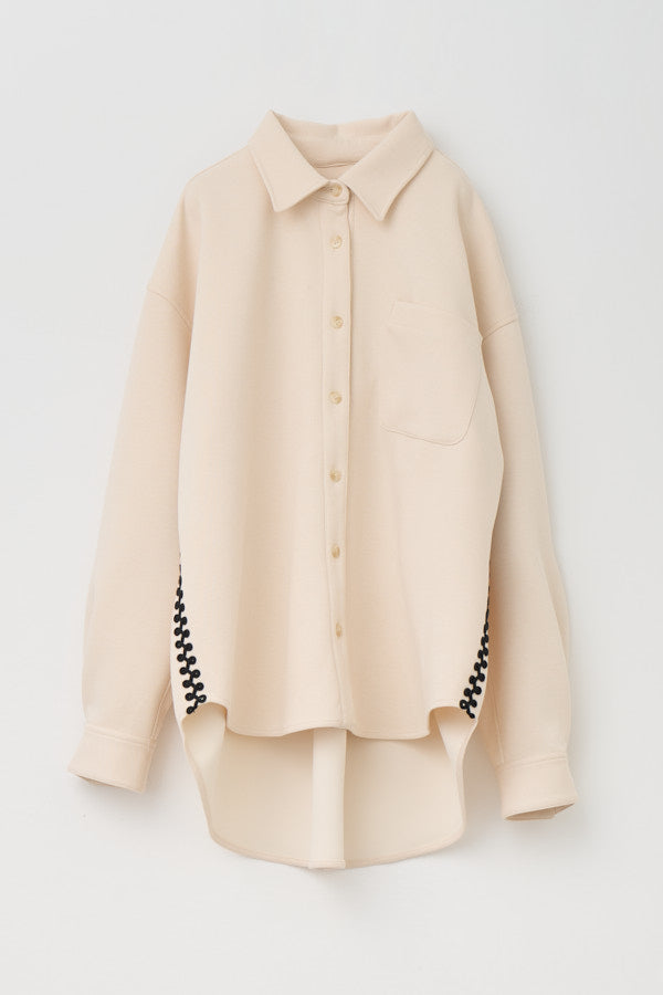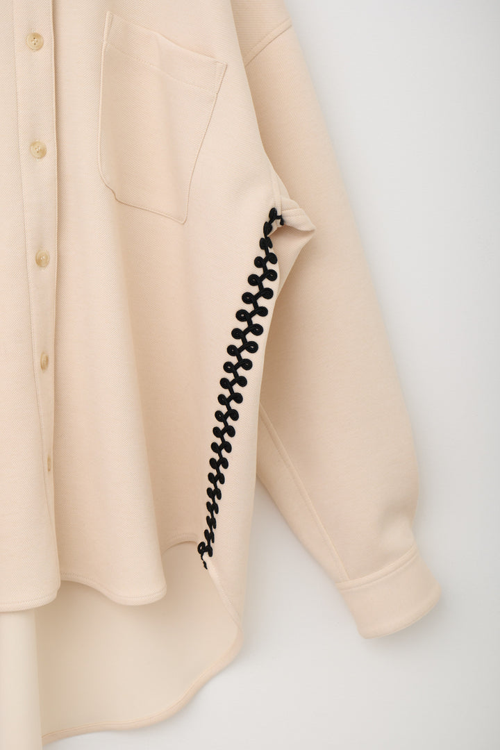 サイドに施されたオリジナルのコード刺繍がアクセントになったロングシャツ。シンプルなデザインの中に、さりげないディテールで個性をプラスした一枚です。