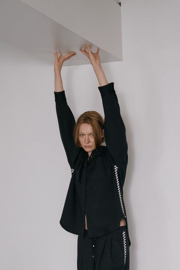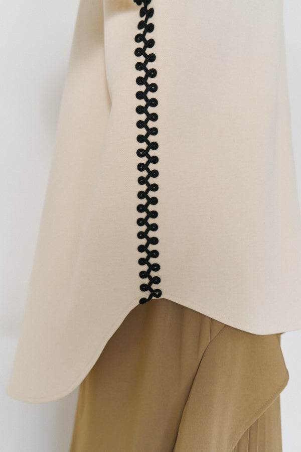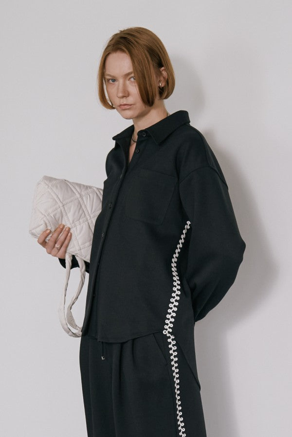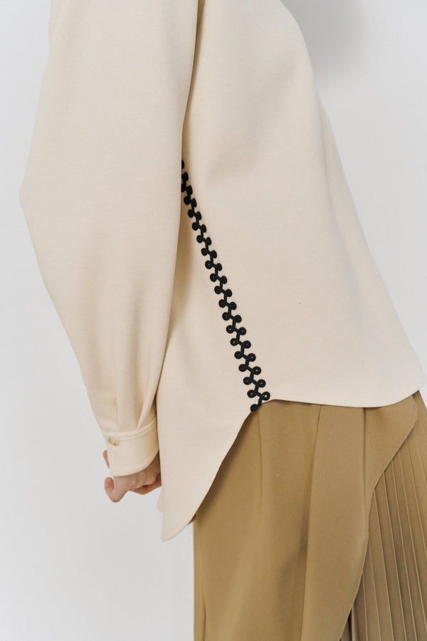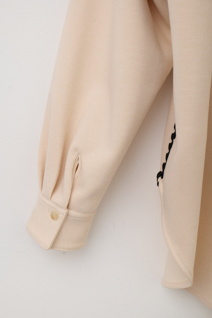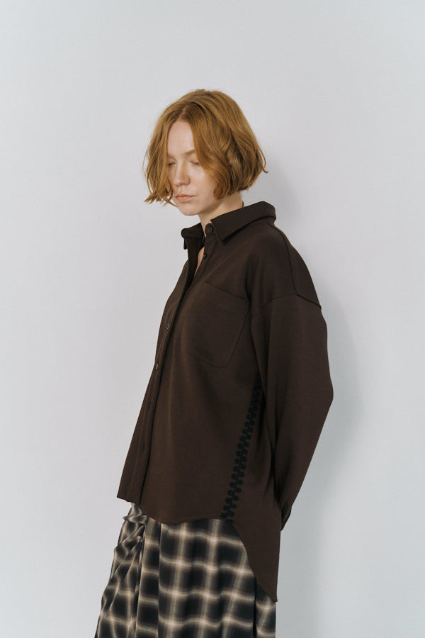 サイドに施されたオリジナルのコード刺繍がアクセントになったロングシャツ。シンプルなデザインの中に、さりげないディテールで個性をプラスした一枚です。