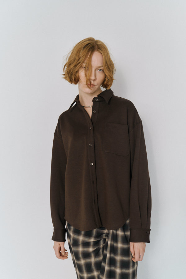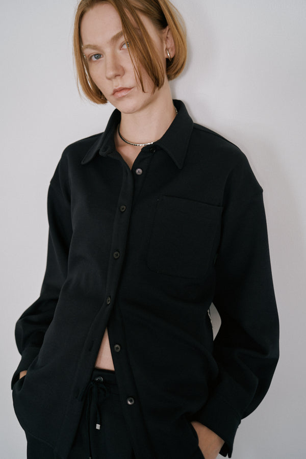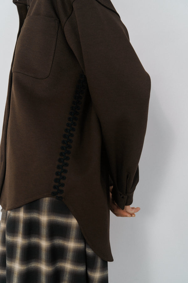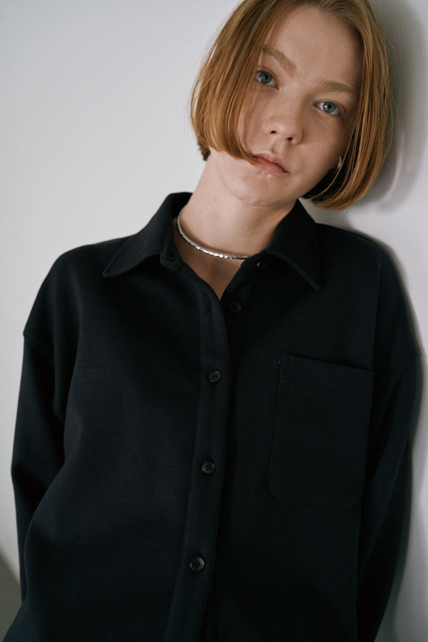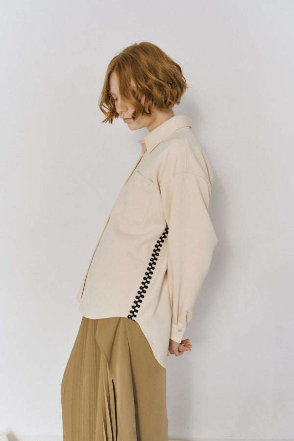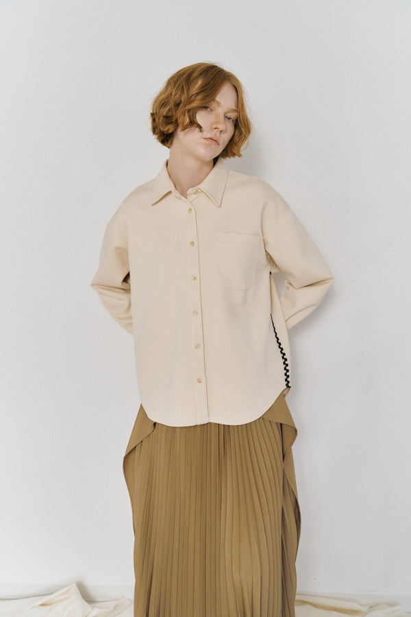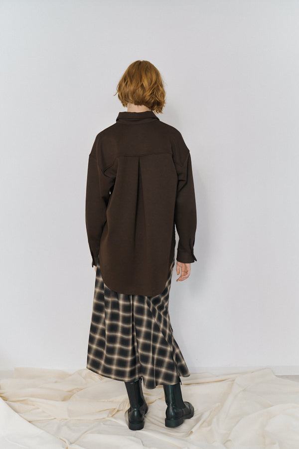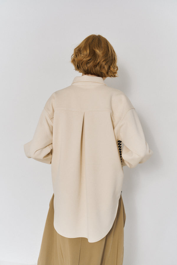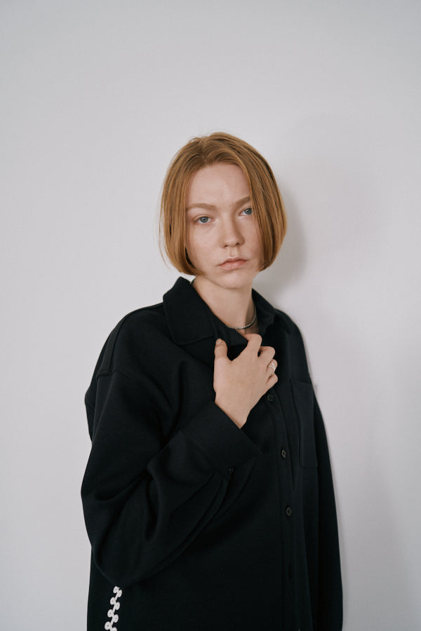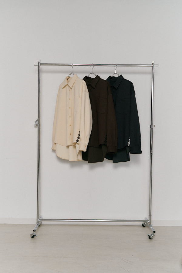 季節の変わり目や肌寒い日の軽い羽織りとしても活躍します。前後差のある着丈は、アウトスタイルでもバランス良く決まり、ヒップラインをカバーしてくれるのも嬉しいポイント。胸元にはポケットを配し、実用性も備えています。