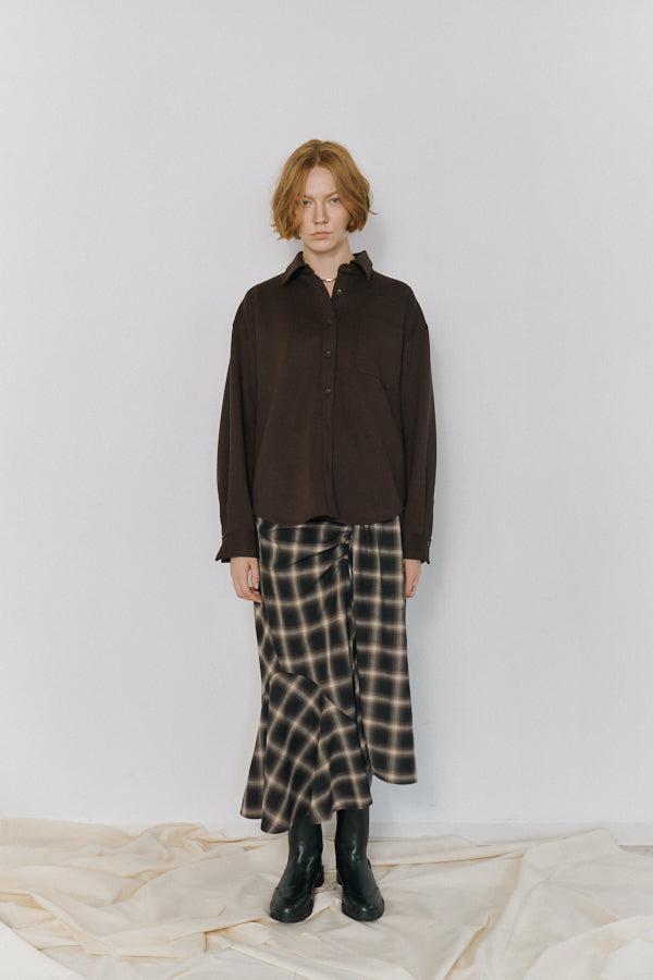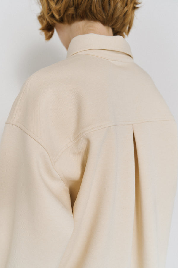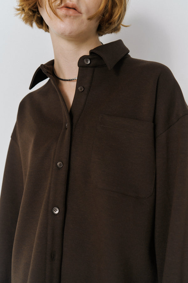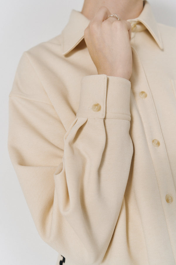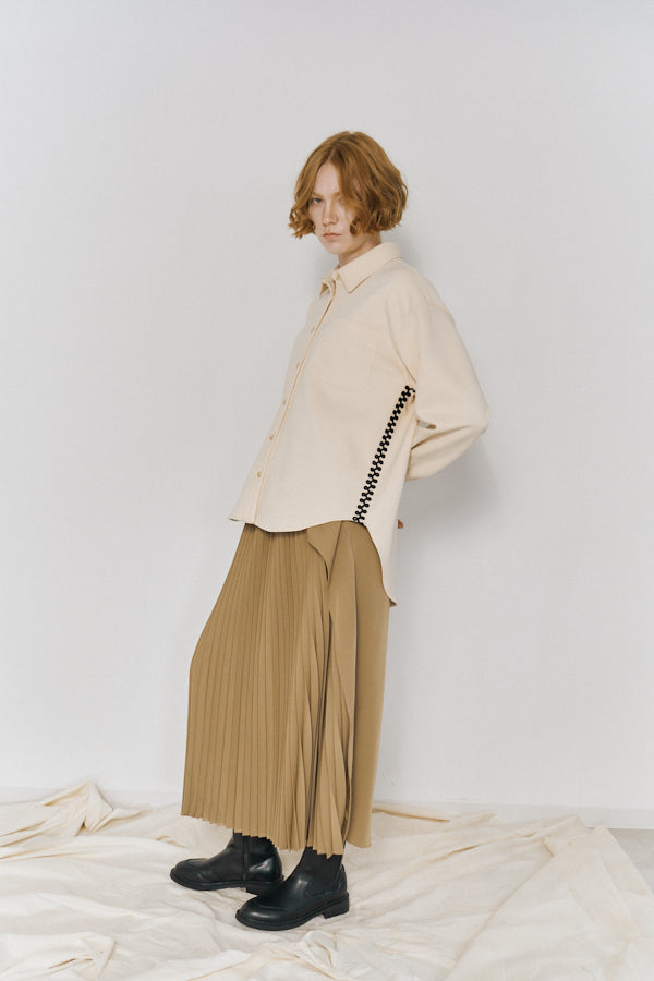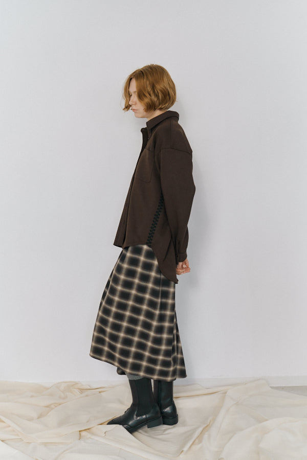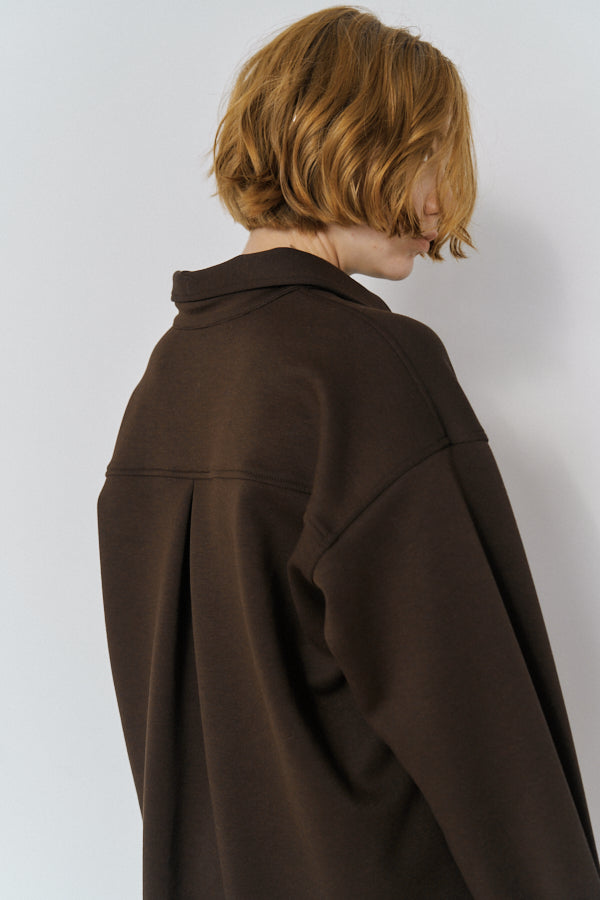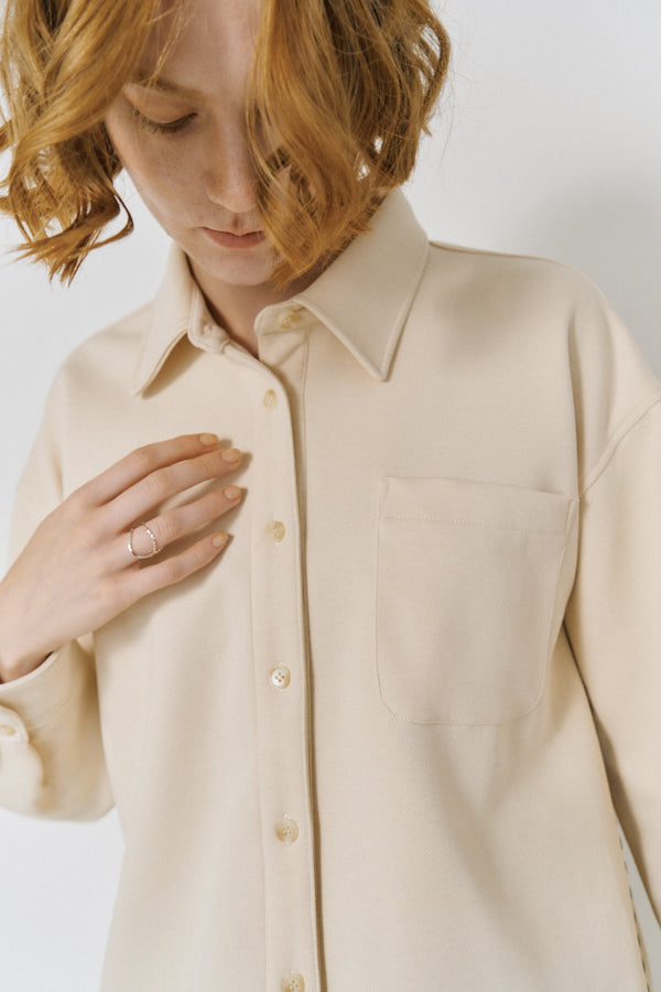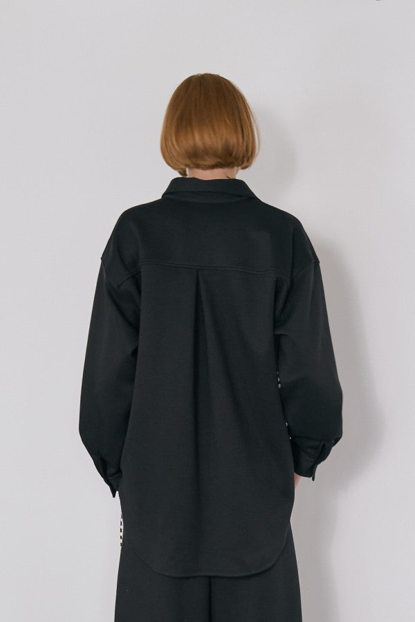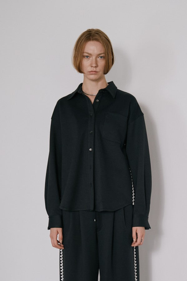 季節の変わり目や肌寒い日の軽い羽織りとしても活躍します。前後差のある着丈は、アウトスタイルでもバランス良く決まり、ヒップラインをカバーしてくれるのも嬉しいポイント。胸元にはポケットを配し、実用性も備えています。