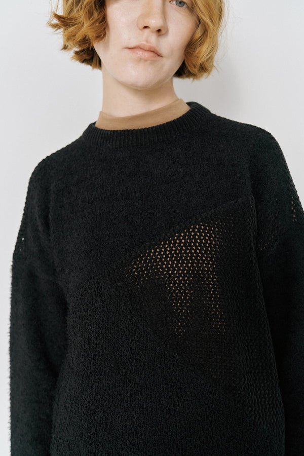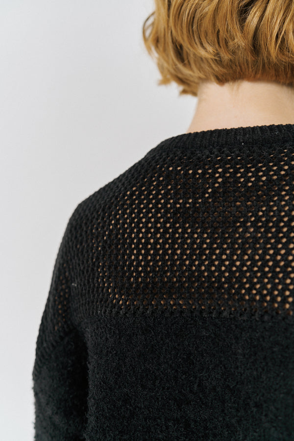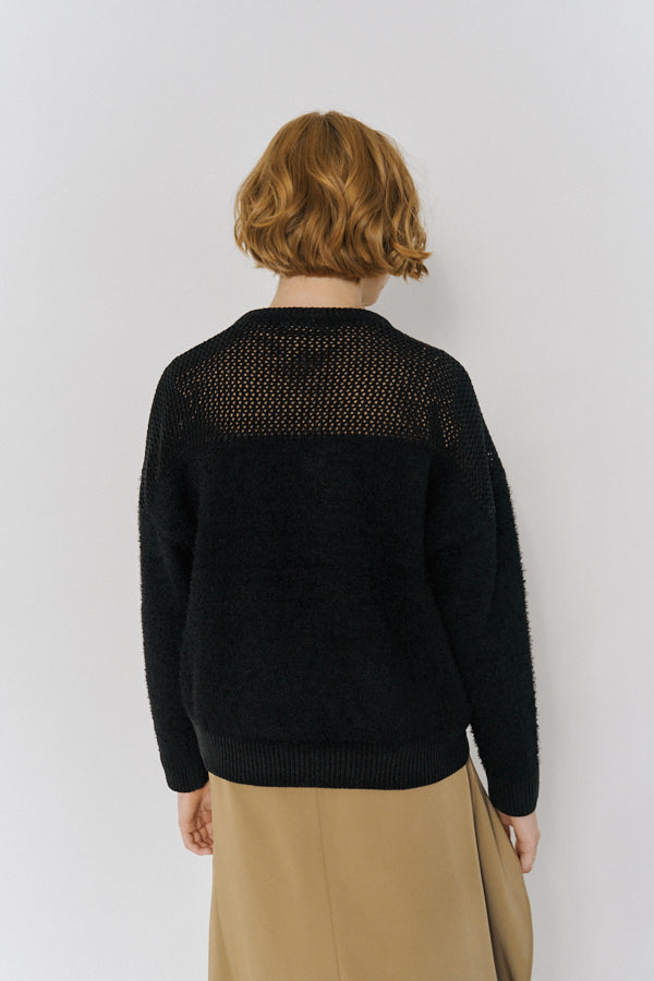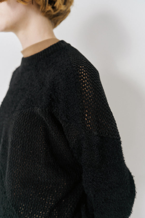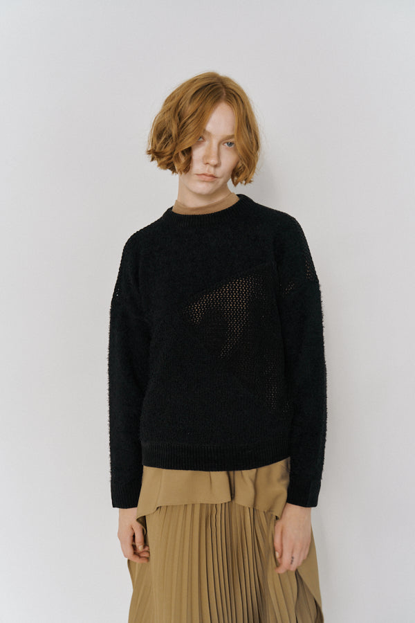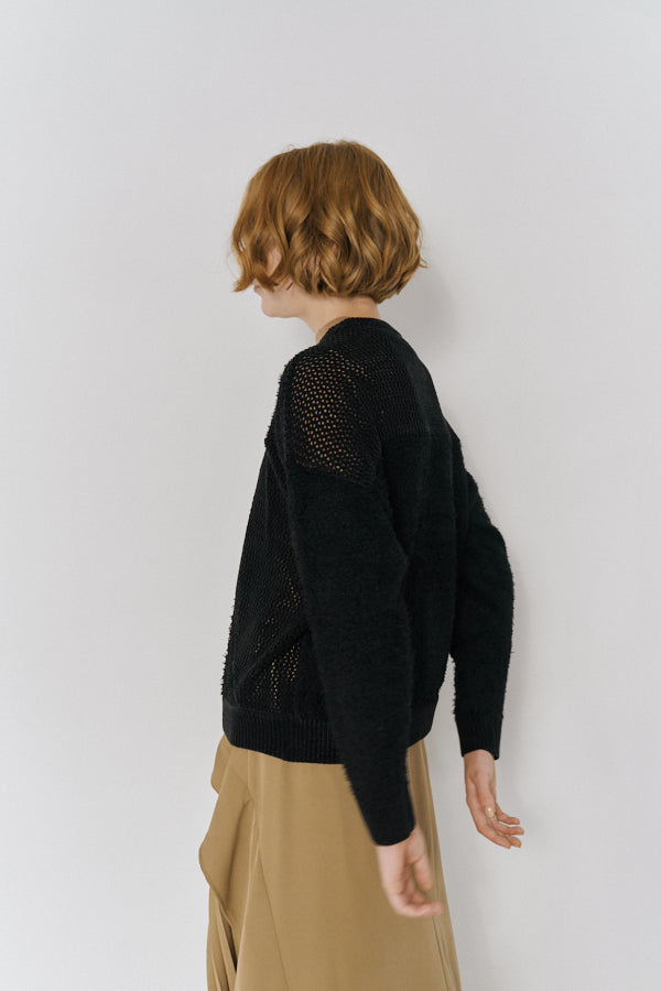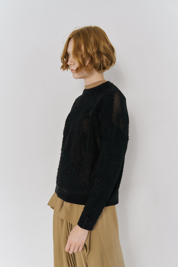 ふんわりとしたシャギー素材とメッシュ調ニットを組み合わせた、ニュアンスたっぷりのプルオーバーニット。