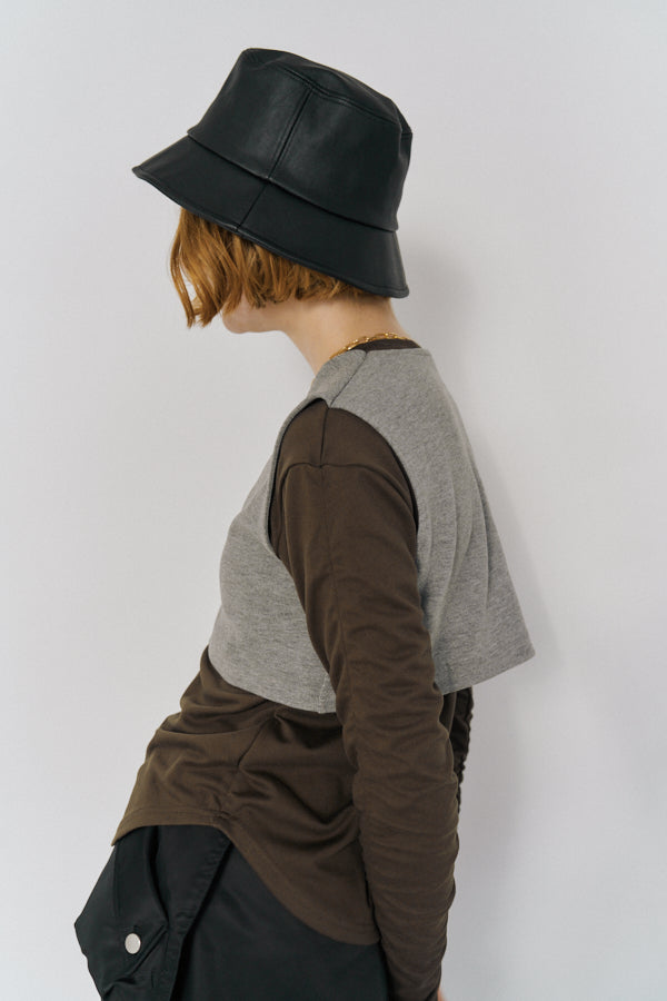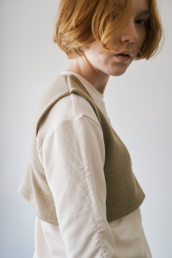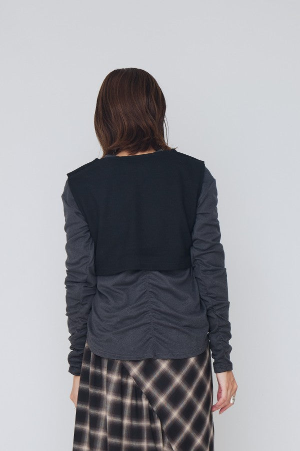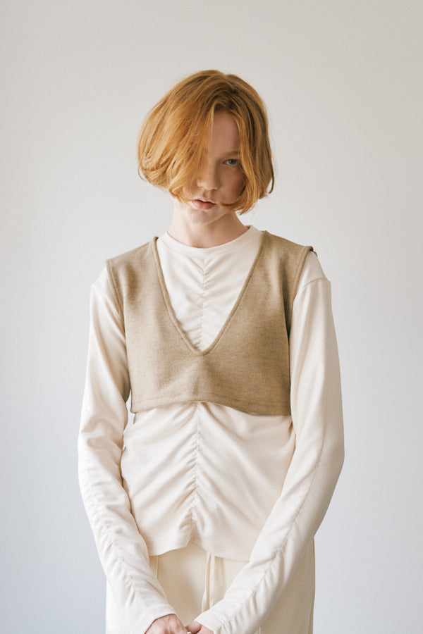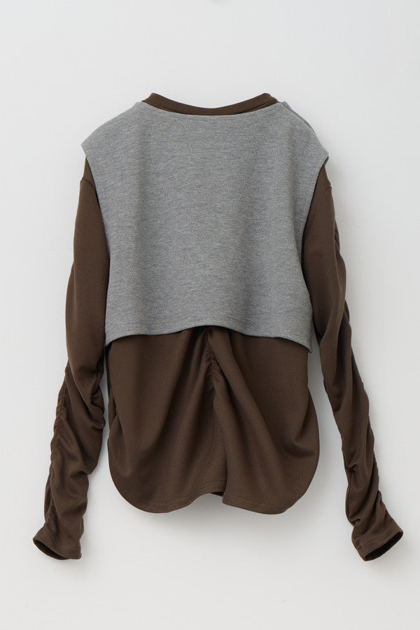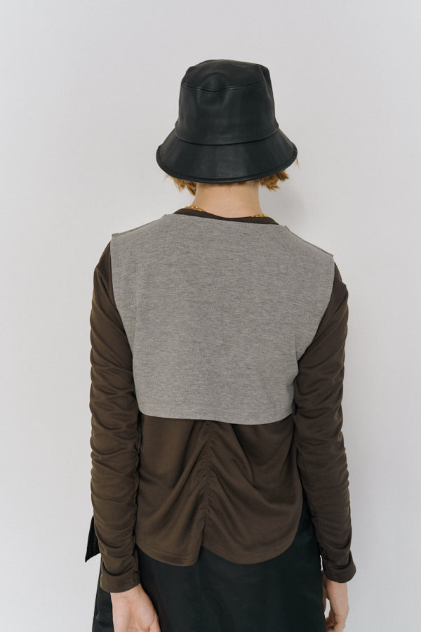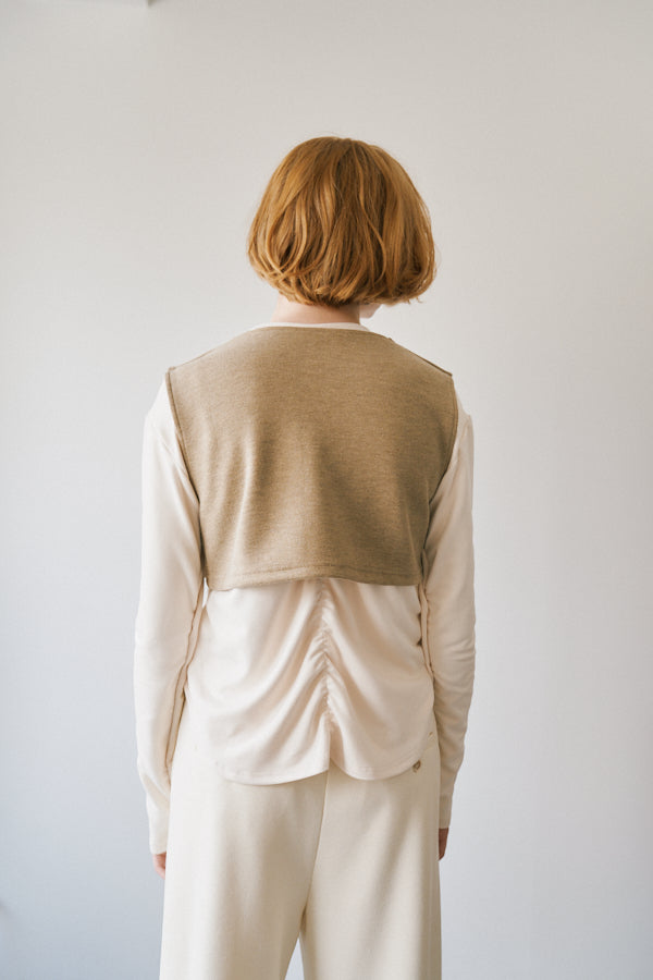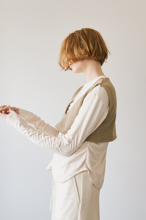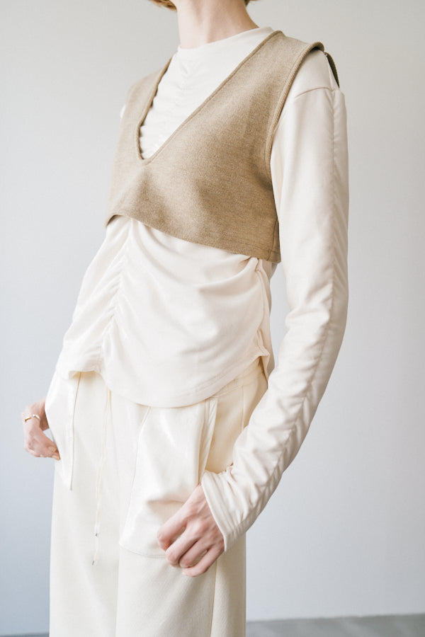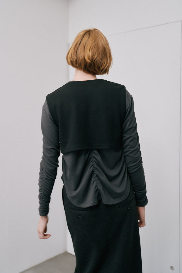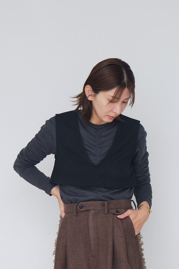 柔らかなカットソー素材をベースにしているため、着心地は快適。ベスト部分は程よいハリのある生地感でシルエットをきれいに見せてくれます。デニムやスカートと合わせたカジュアルコーデはもちろん、きれいめパンツと組み合わせれば大人っぽい印象にも。
