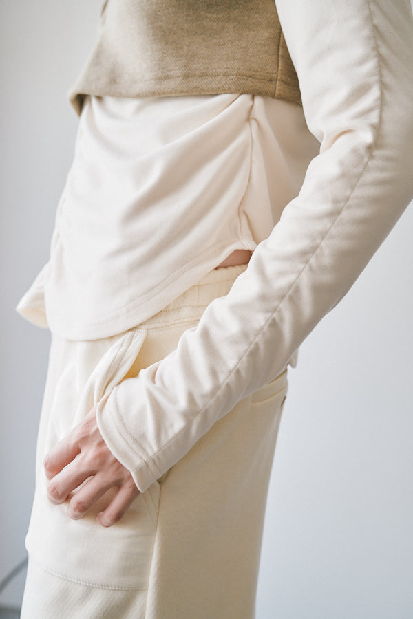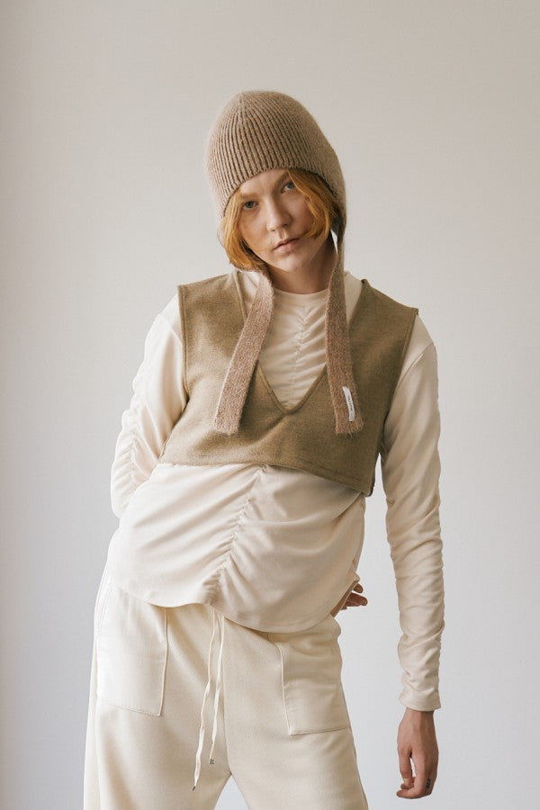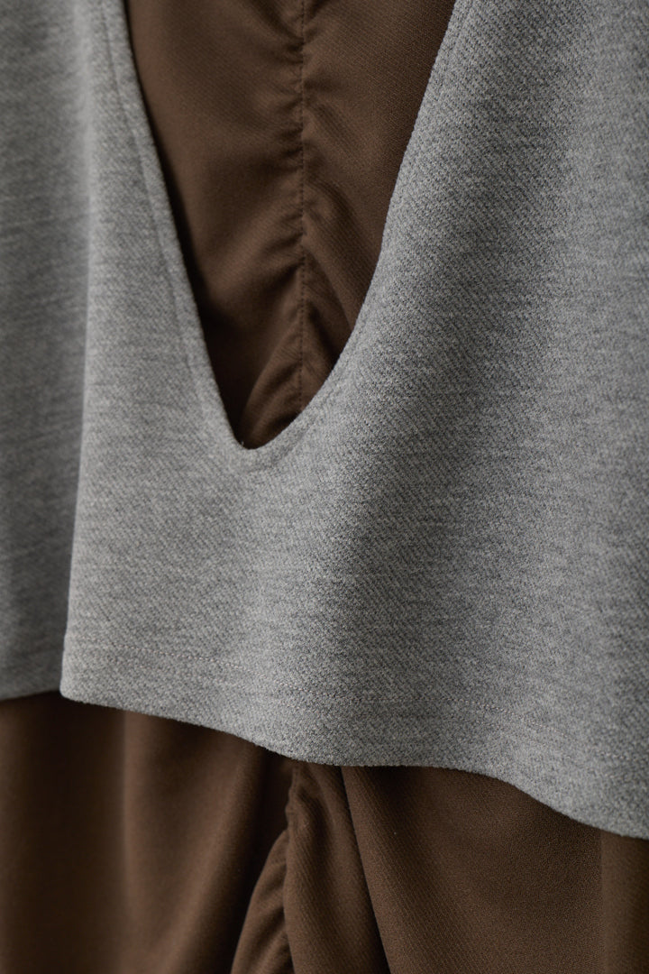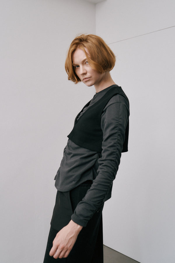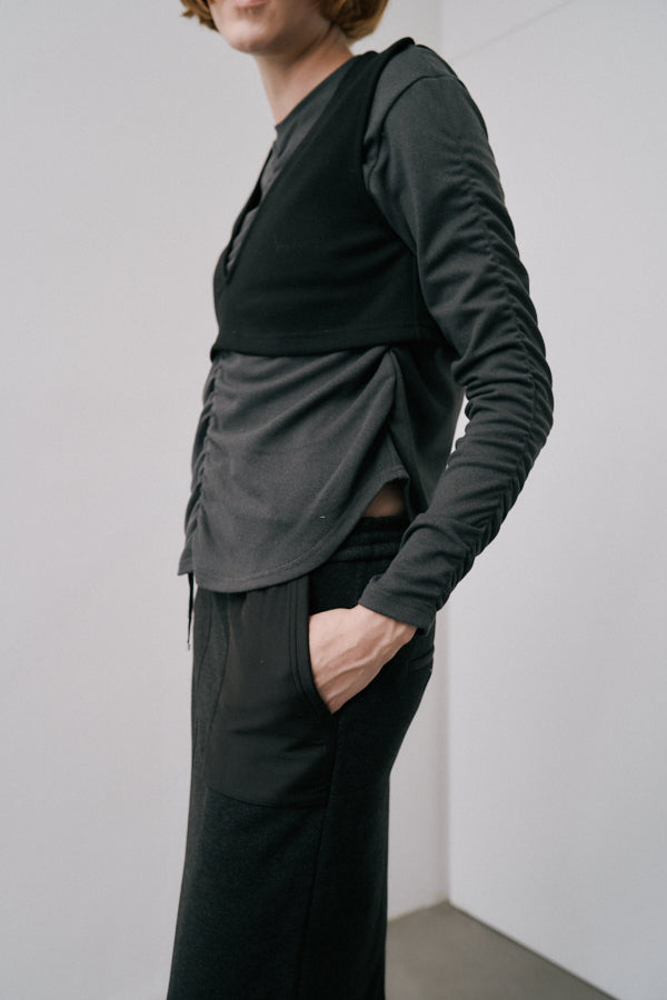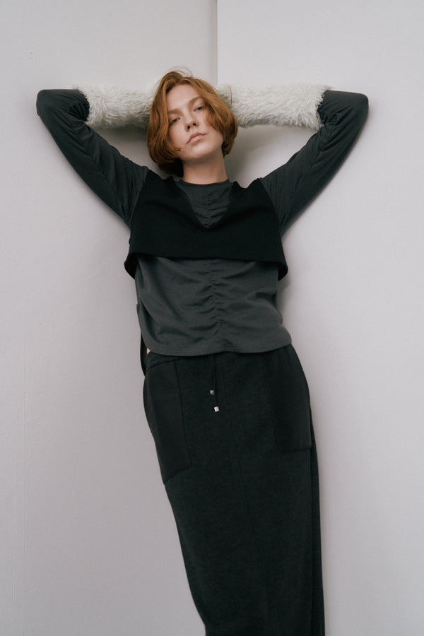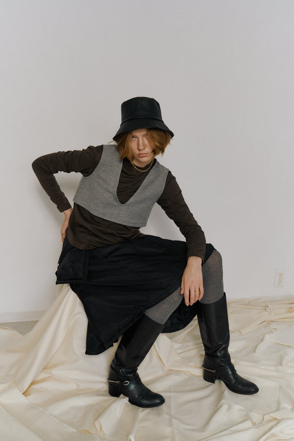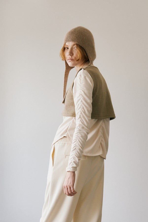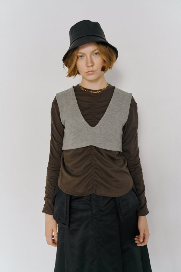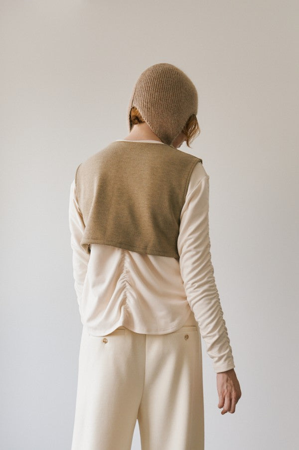 柔らかなカットソー素材をベースにしているため、着心地は快適。ベスト部分は程よいハリのある生地感でシルエットをきれいに見せてくれます。デニムやスカートと合わせたカジュアルコーデはもちろん、きれいめパンツと組み合わせれば大人っぽい印象にも。