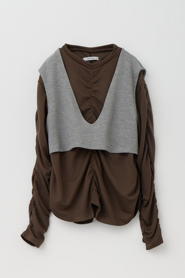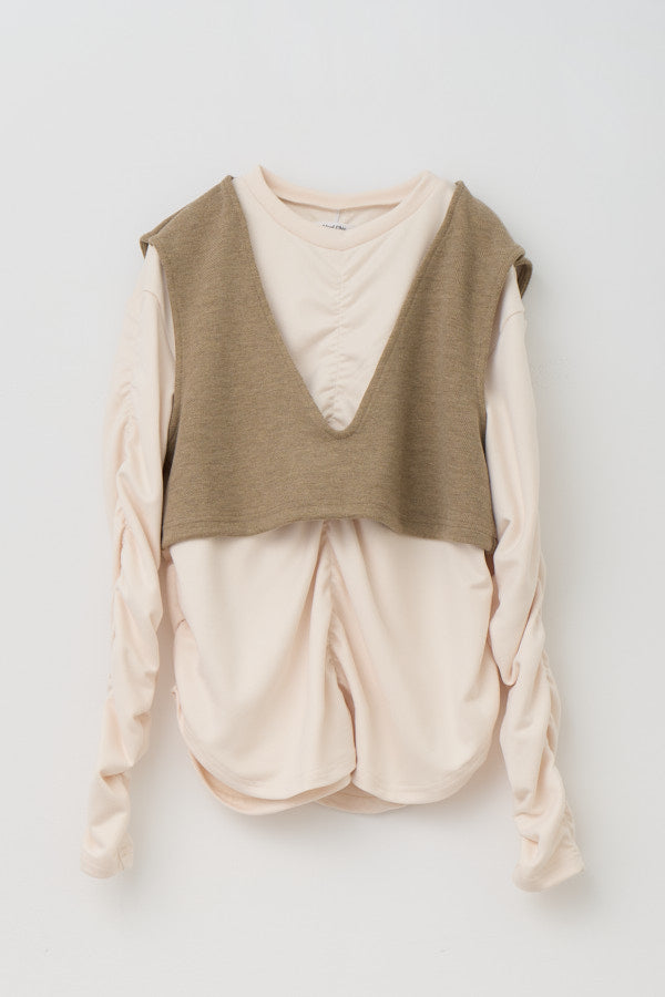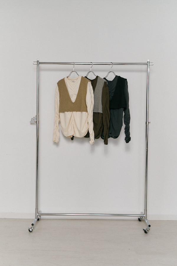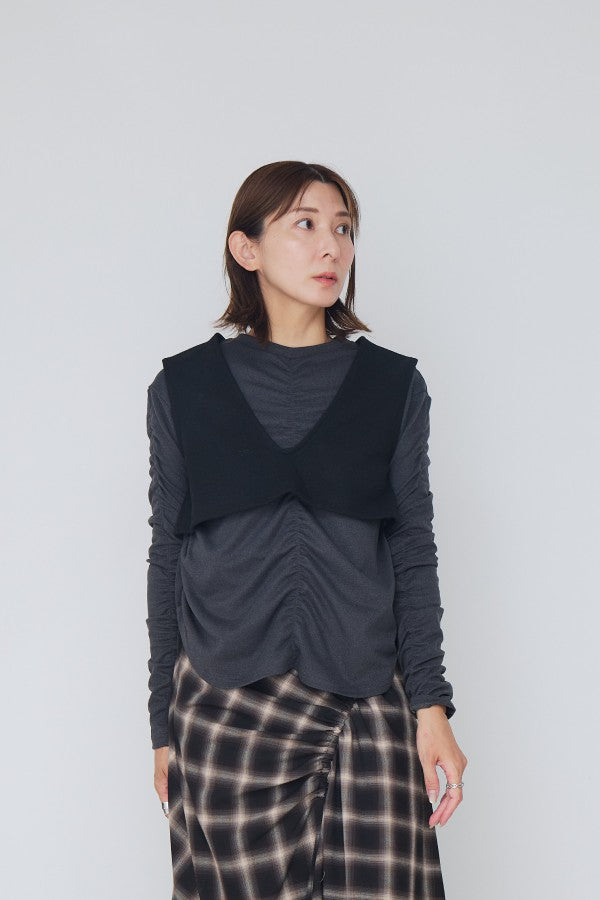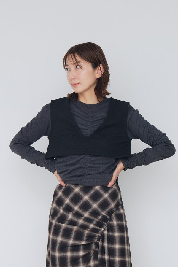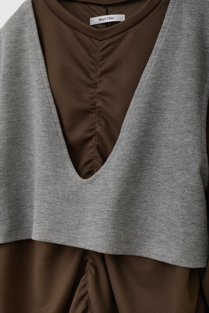 レイヤード風のデザインが目を惹くプルオーバートップス。深めに開いたVネックベストを重ね着したようなスタイルが、一枚でこなれ感を演出してくれます。