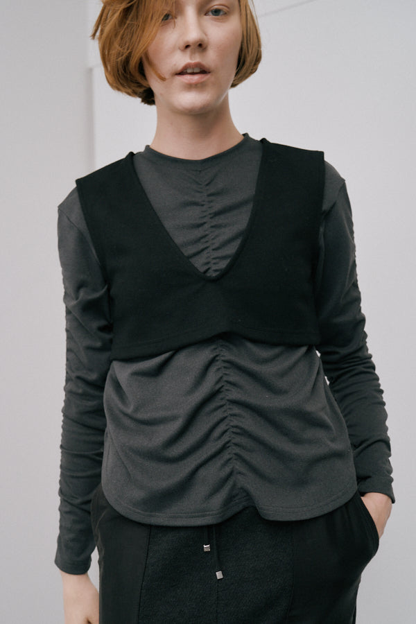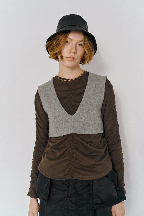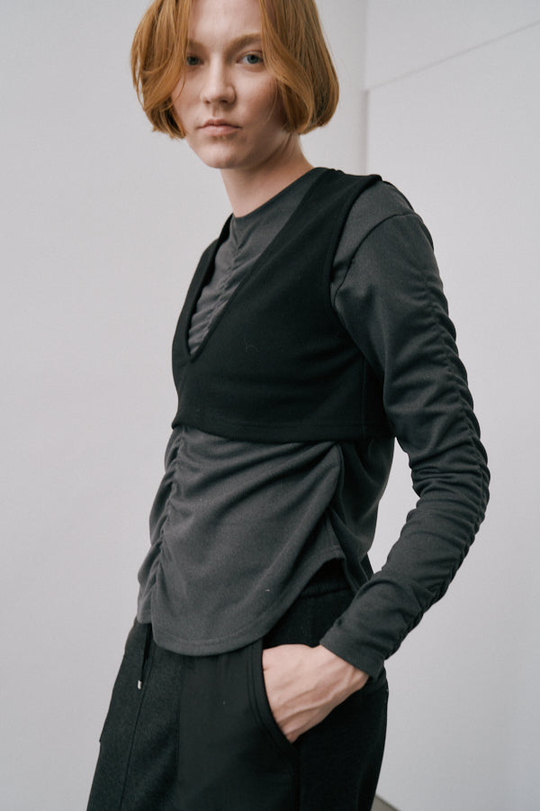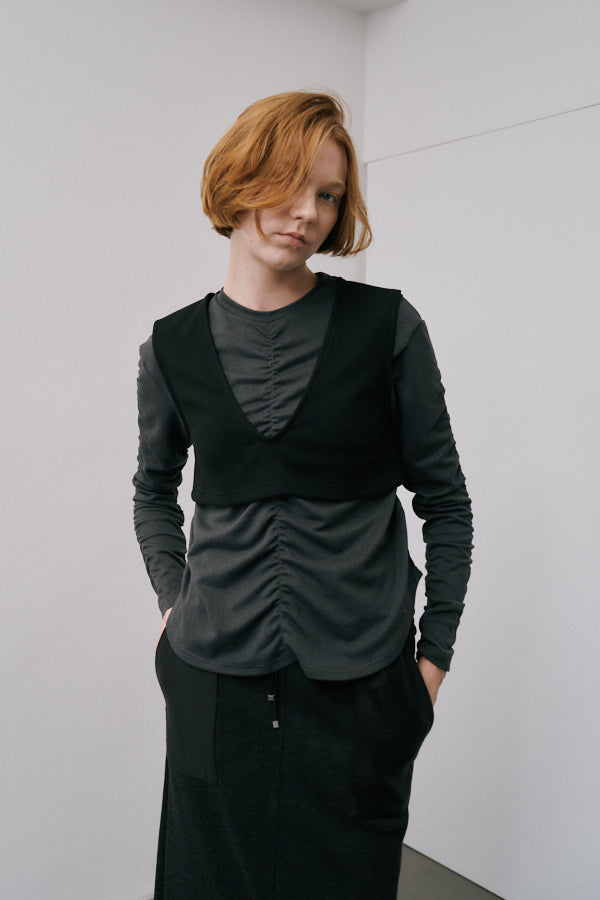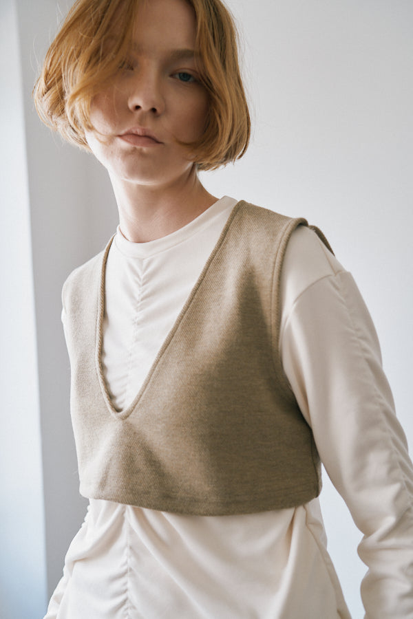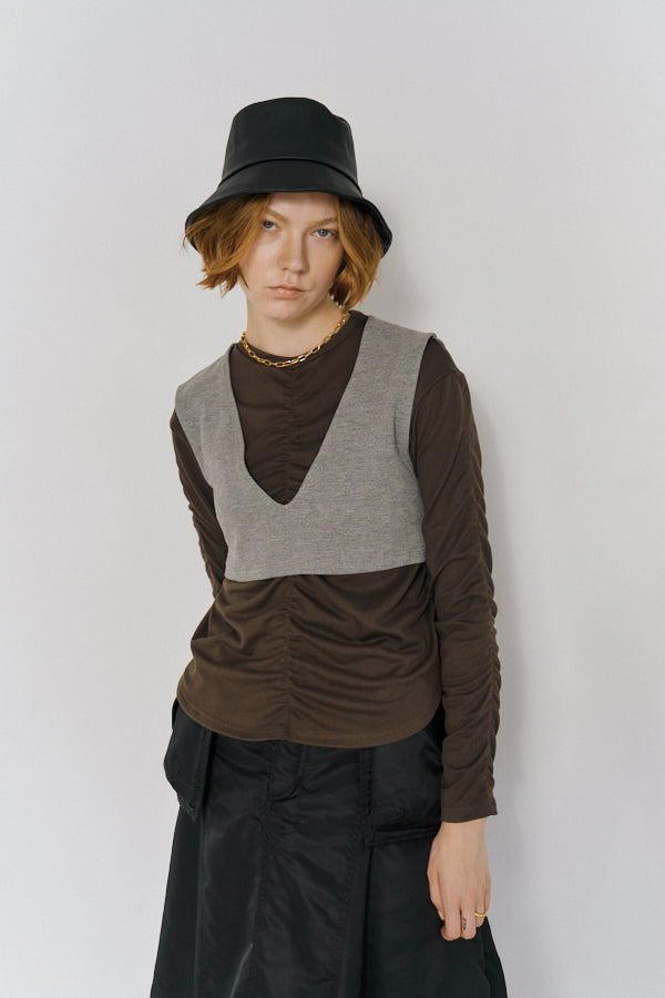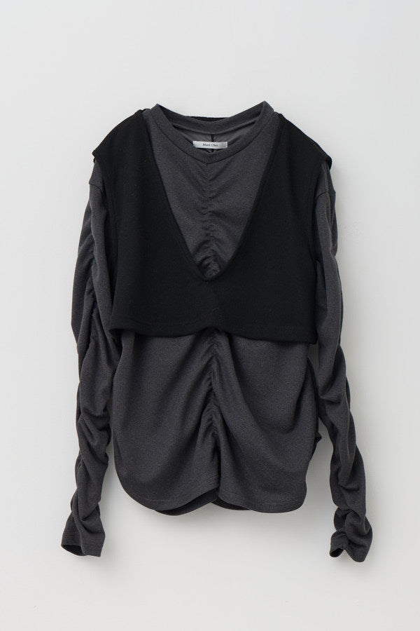 レイヤード風のデザインが目を惹くプルオーバートップス。深めに開いたVネックベストを重ね着したようなスタイルが、一枚でこなれ感を演出してくれます。