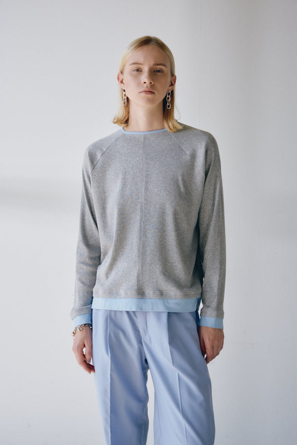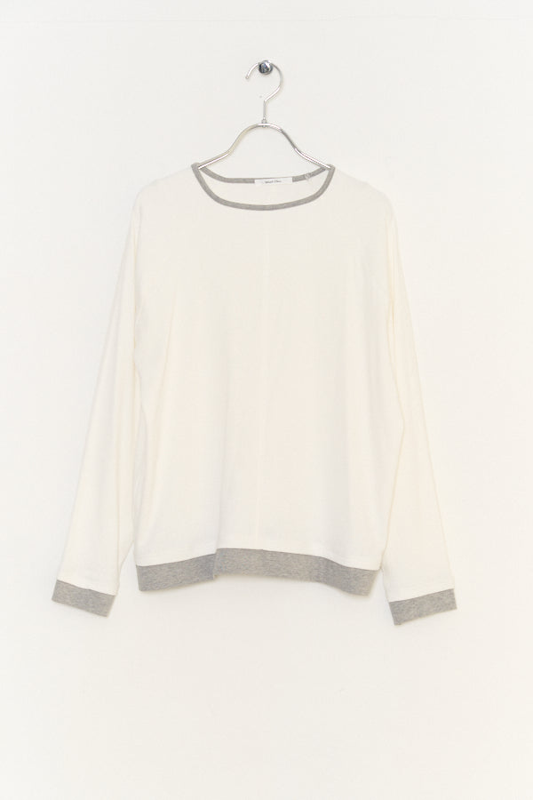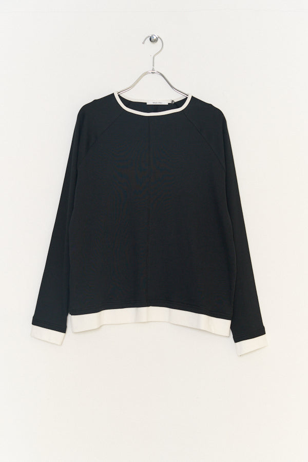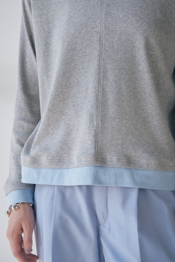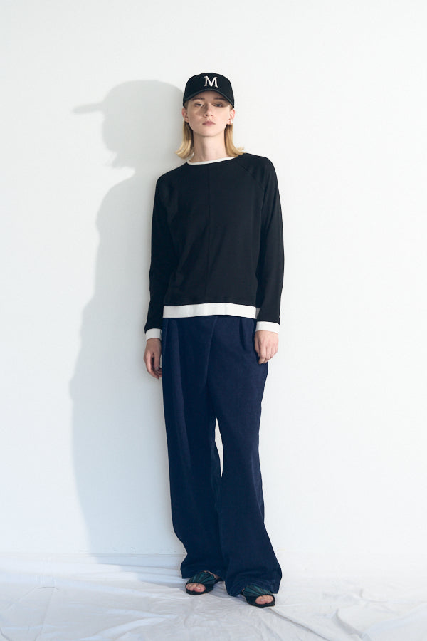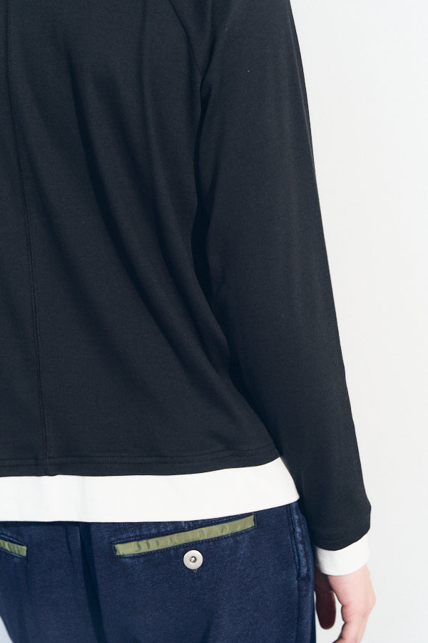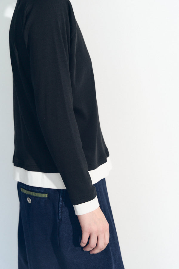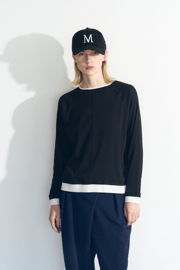 まるでレイヤードしているかのように見えるデザインが印象的な長袖トップス。衿ぐりや裾、袖口に異なる配色を効かせ、シンプルながらも立体感のあるスタイルを演出します。