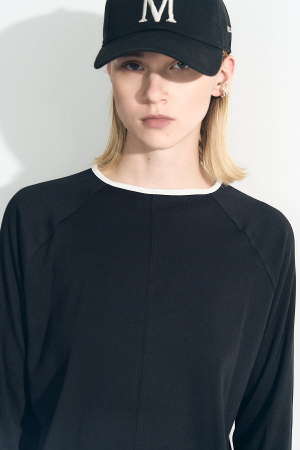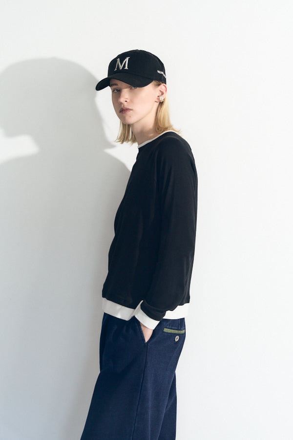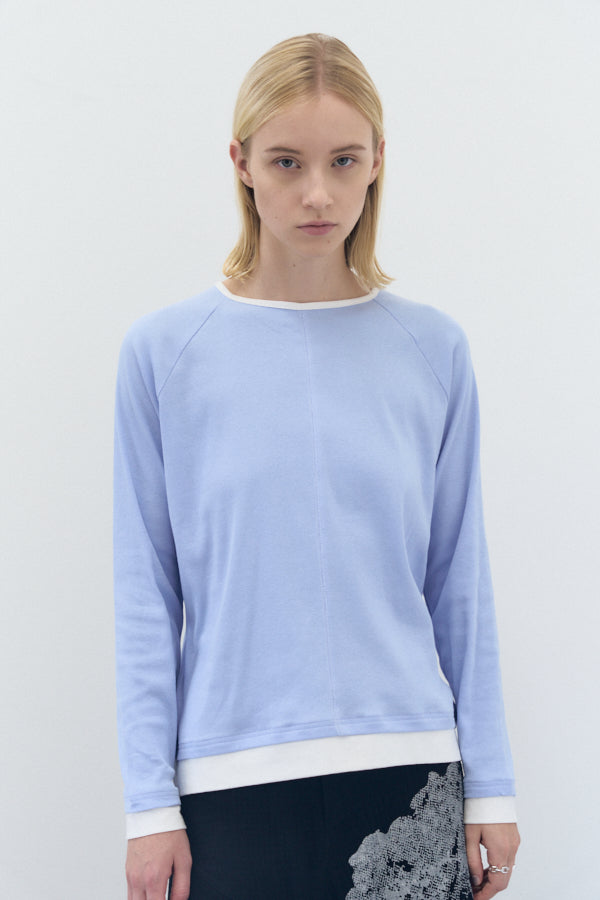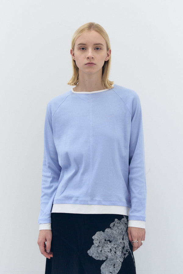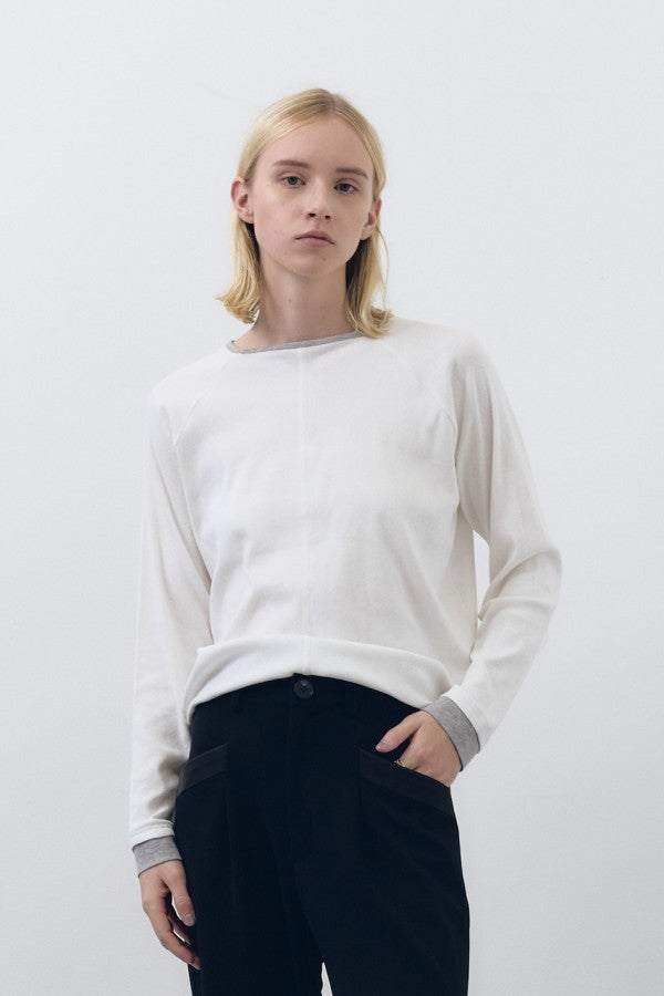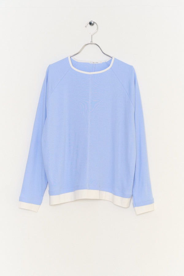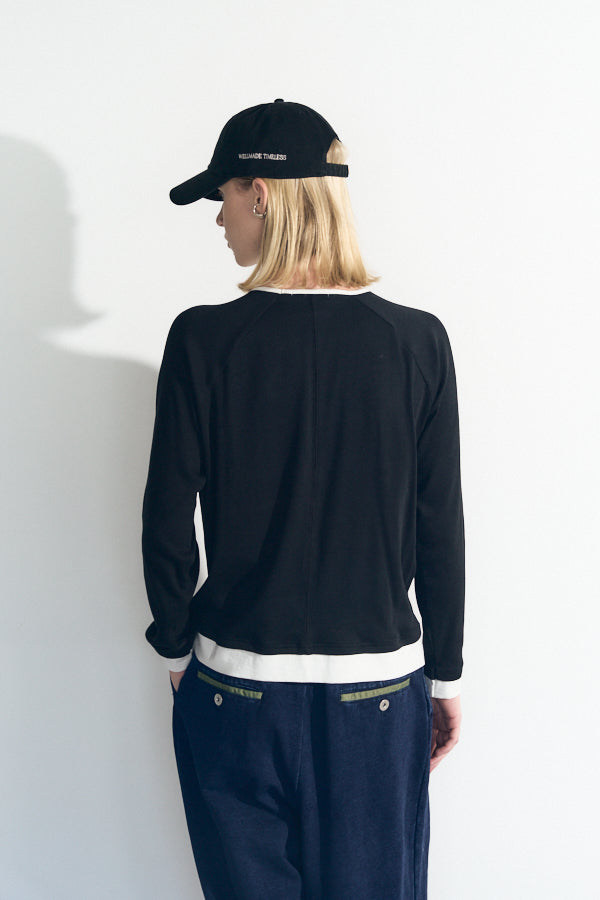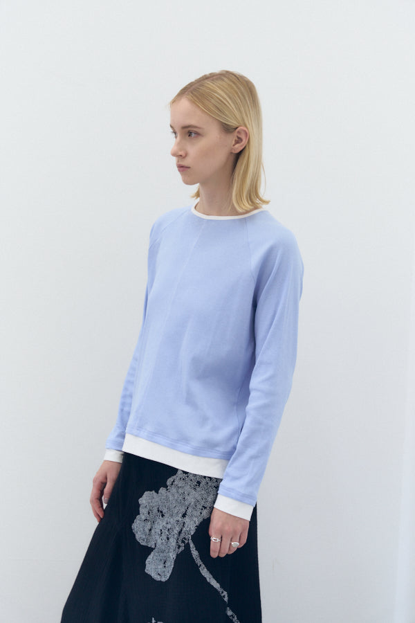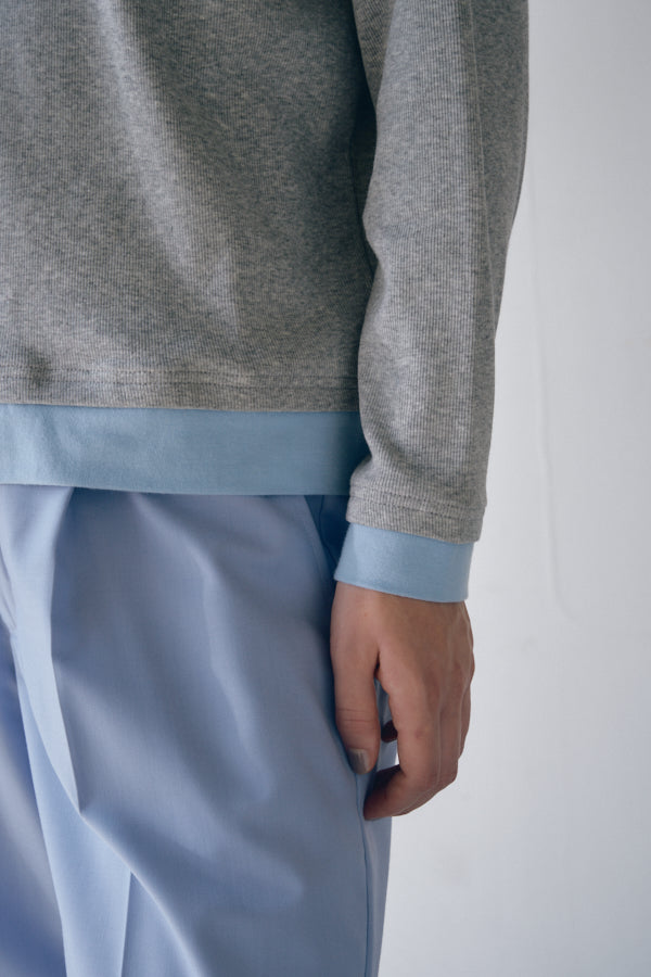 まるでレイヤードしているかのように見えるデザインが印象的な長袖トップス。衿ぐりや裾、袖口に異なる配色を効かせ、シンプルながらも立体感のあるスタイルを演出します。