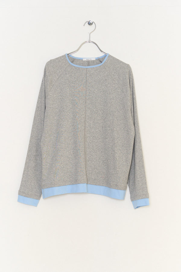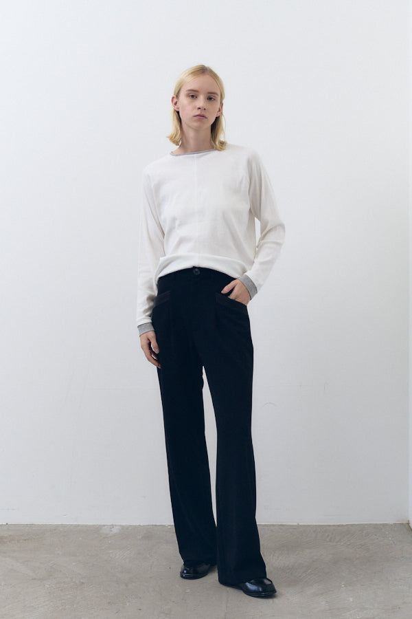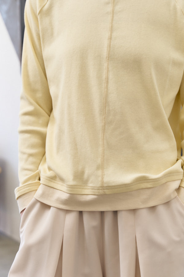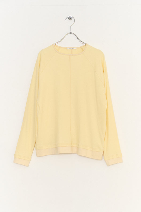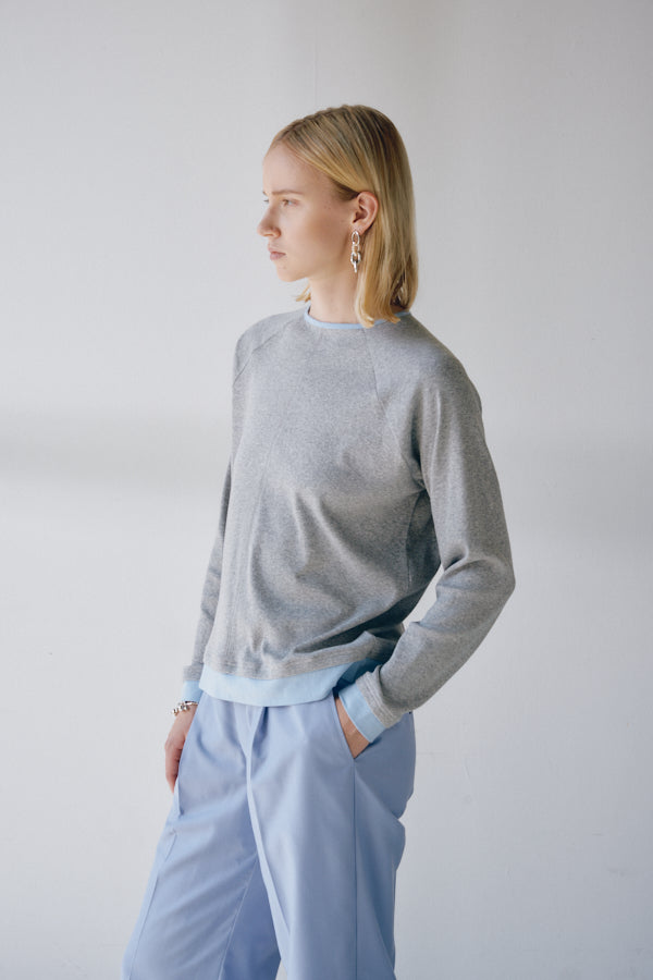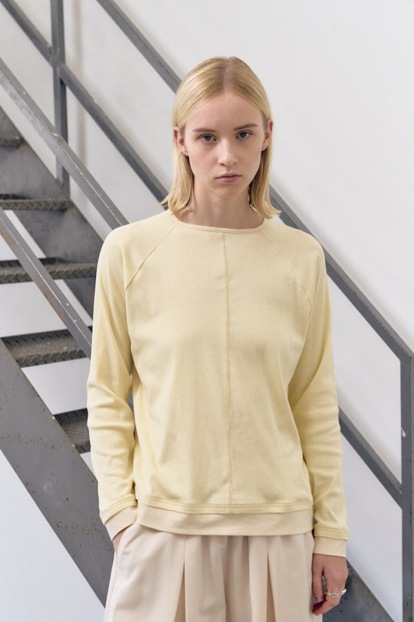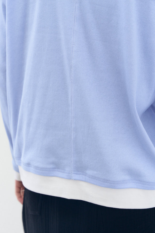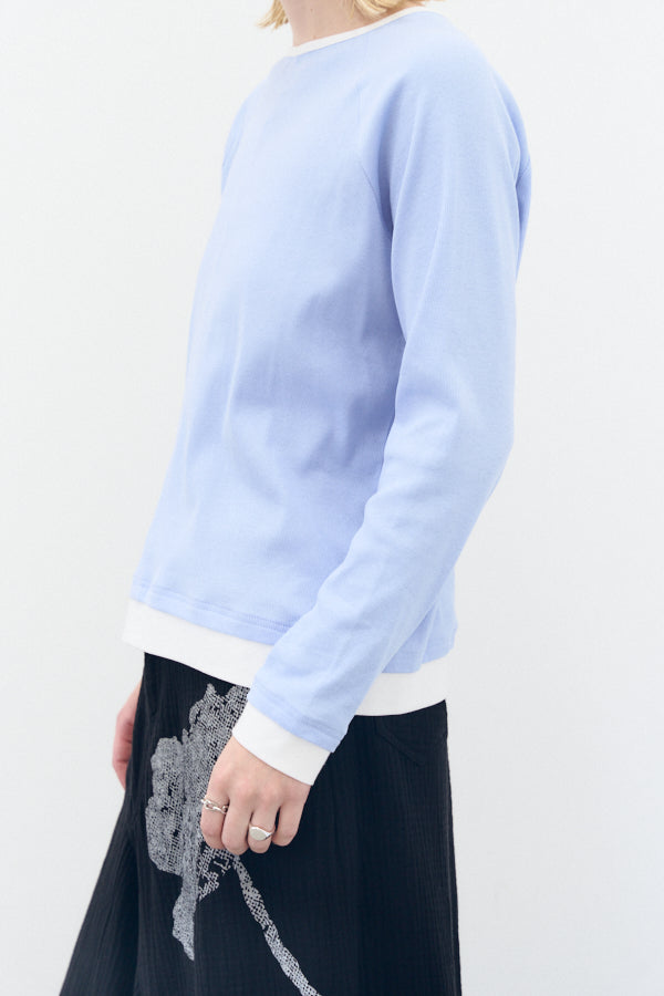 まるでレイヤードしているかのように見えるデザインが印象的な長袖トップス。衿ぐりや裾、袖口に異なる配色を効かせ、シンプルながらも立体感のあるスタイルを演出します。