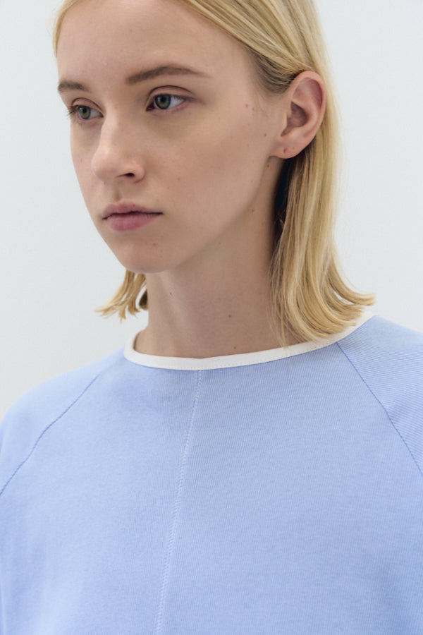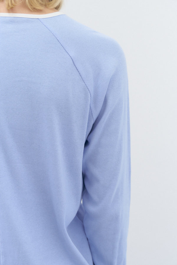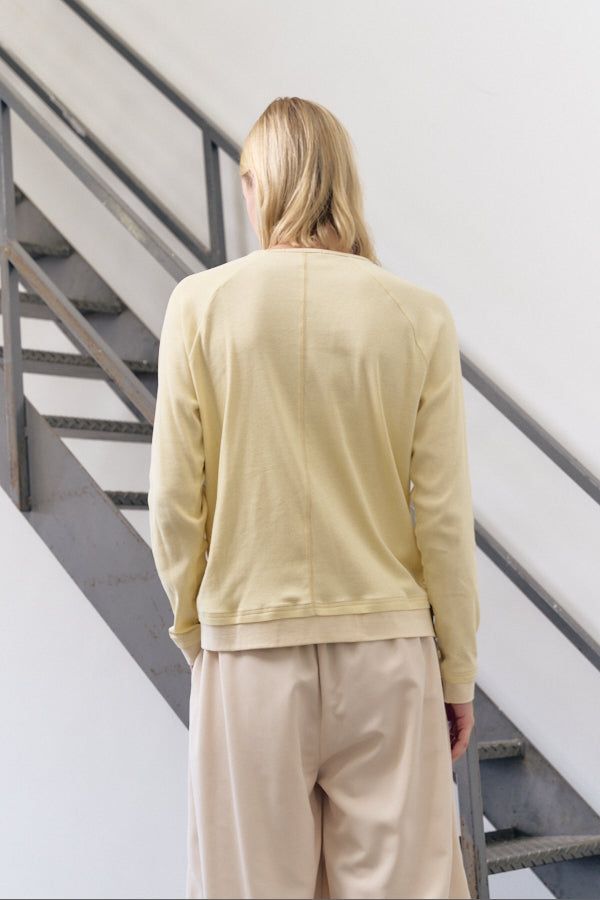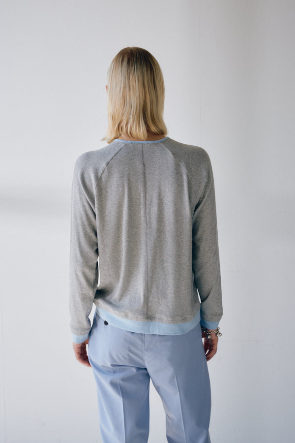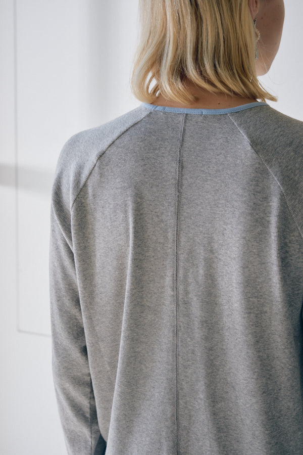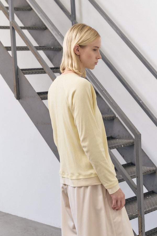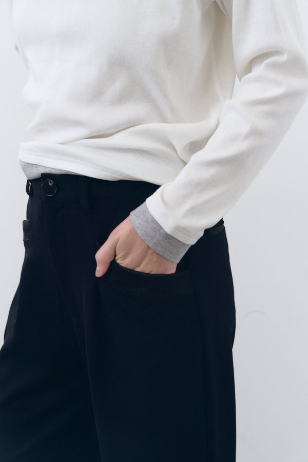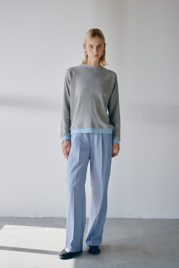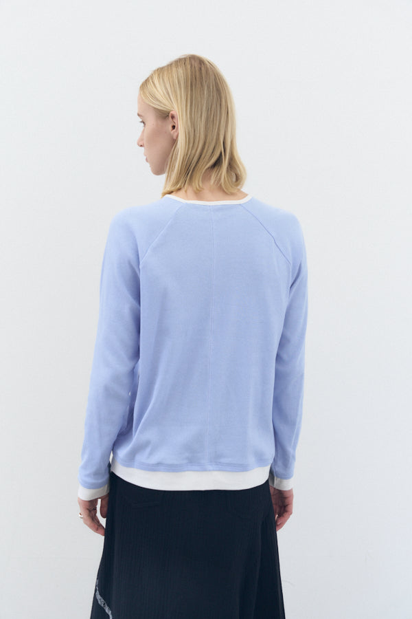 まるでレイヤードしているかのように見えるデザインが印象的な長袖トップス。衿ぐりや裾、袖口に異なる配色を効かせ、シンプルながらも立体感のあるスタイルを演出します。