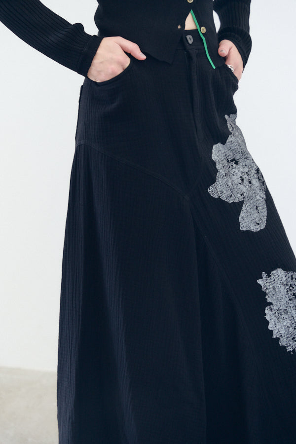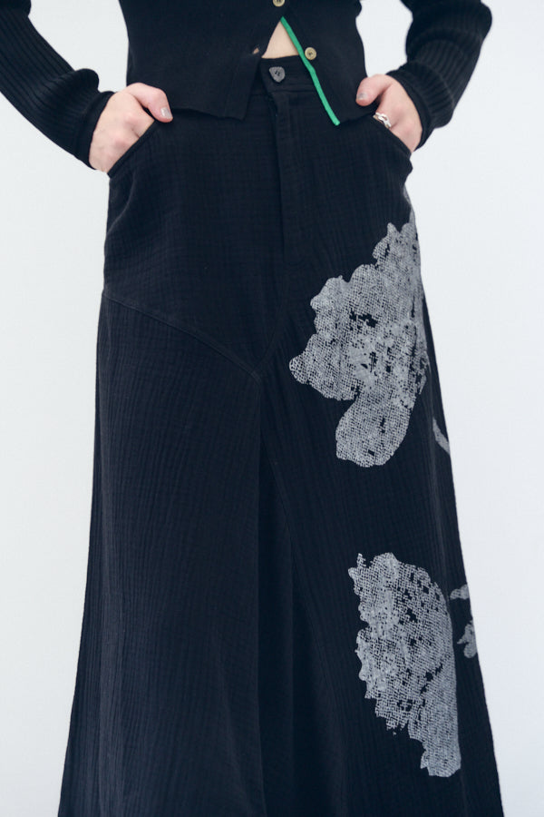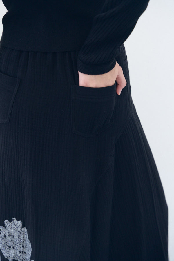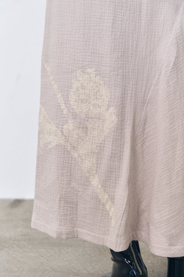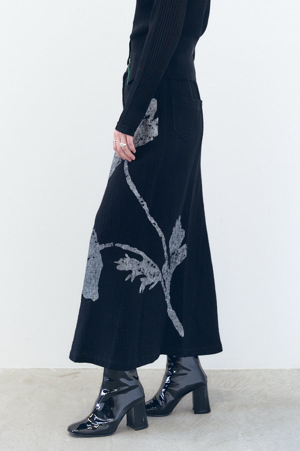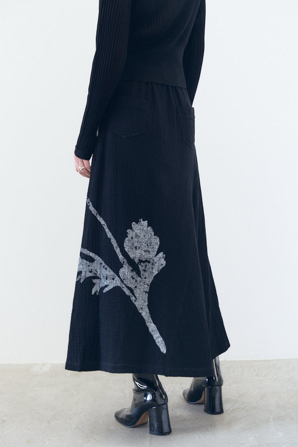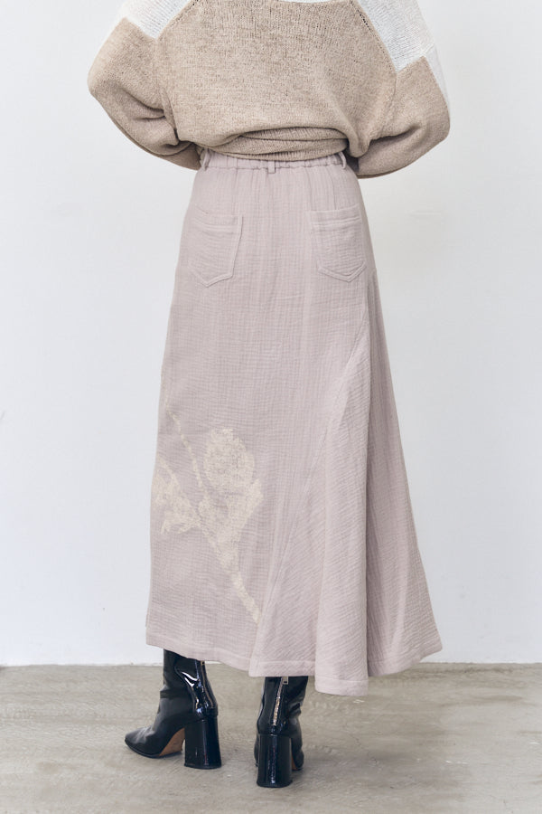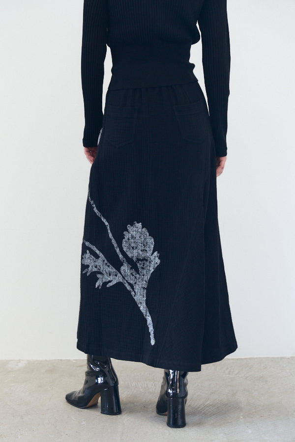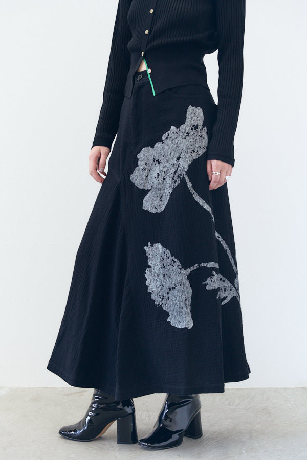 柔らかな風合いが魅力のダブルガーゼ素材に、大きく施した花柄プリントが目を引くスカート。ふんわりとした生地感が生み出す自然なドレープと、アーティスティックなフラワーモチーフのコントラストが、エレガントでモードな印象を演出します。