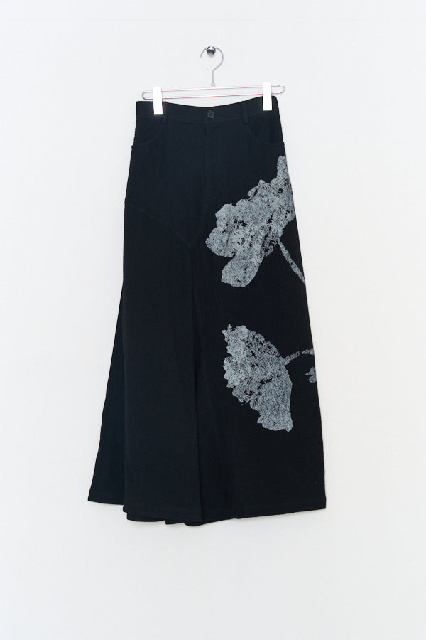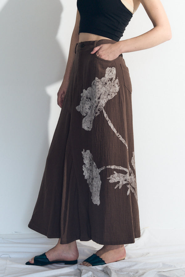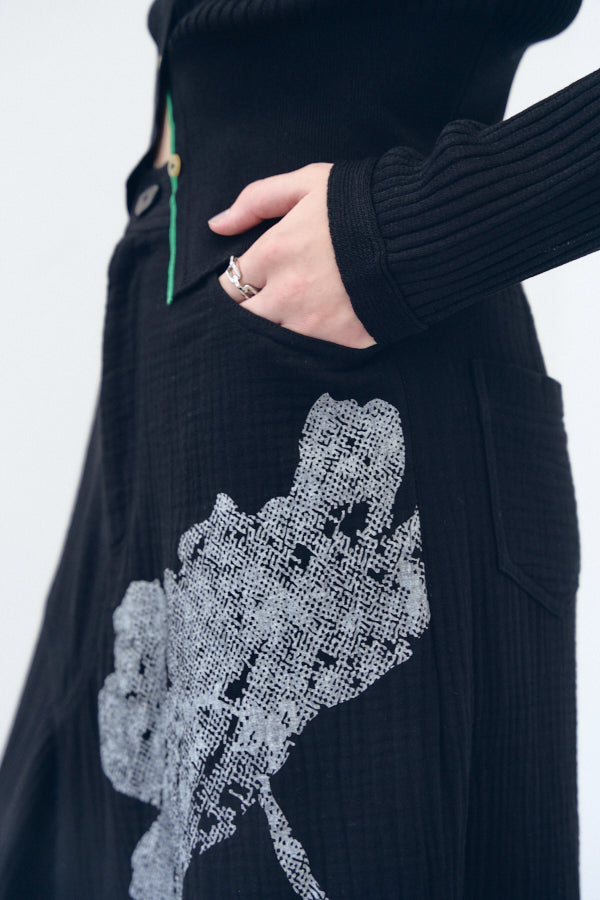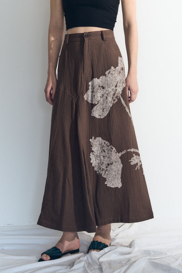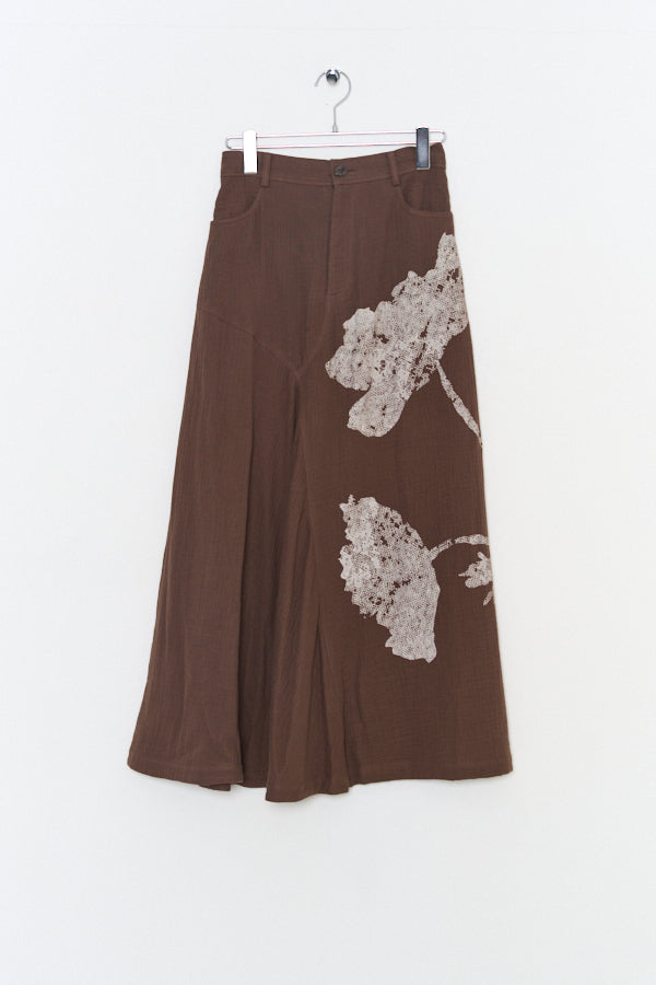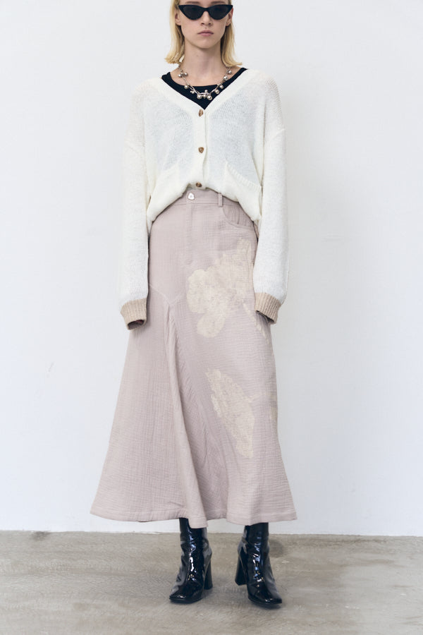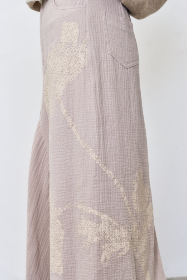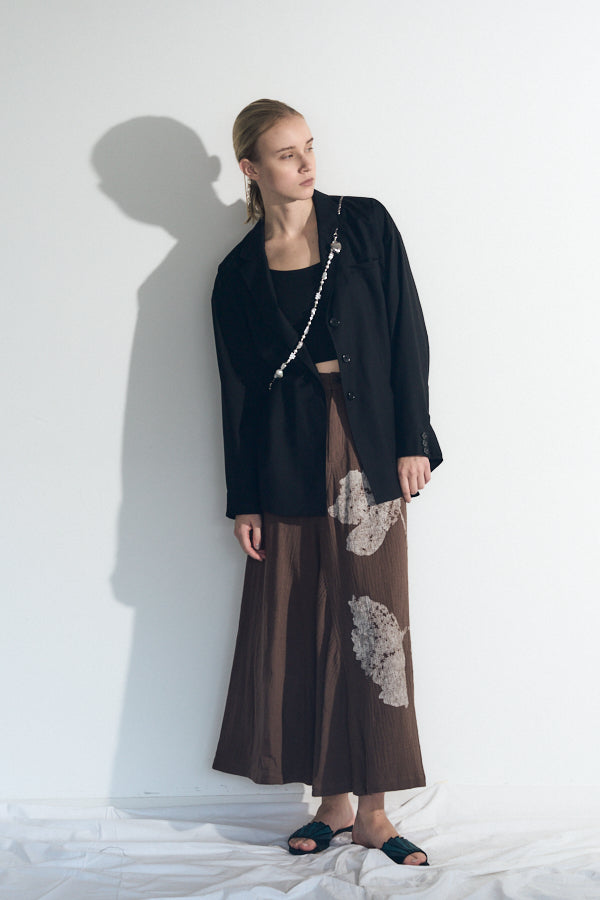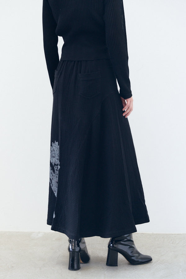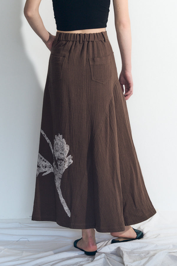 柔らかな風合いが魅力のダブルガーゼ素材に、大きく施した花柄プリントが目を引くスカート。ふんわりとした生地感が生み出す自然なドレープと、アーティスティックなフラワーモチーフのコントラストが、エレガントでモードな印象を演出します。