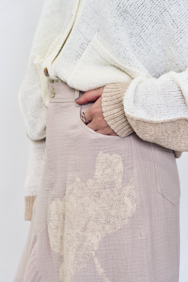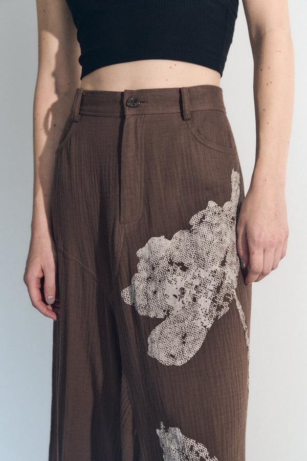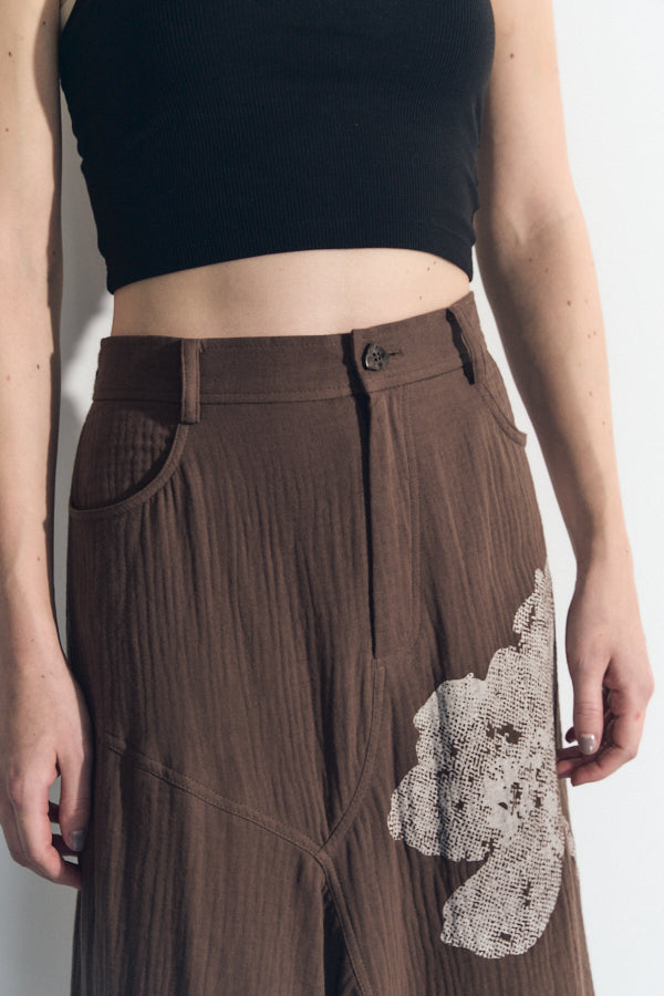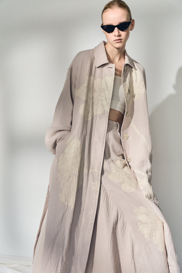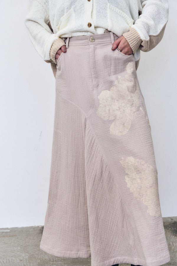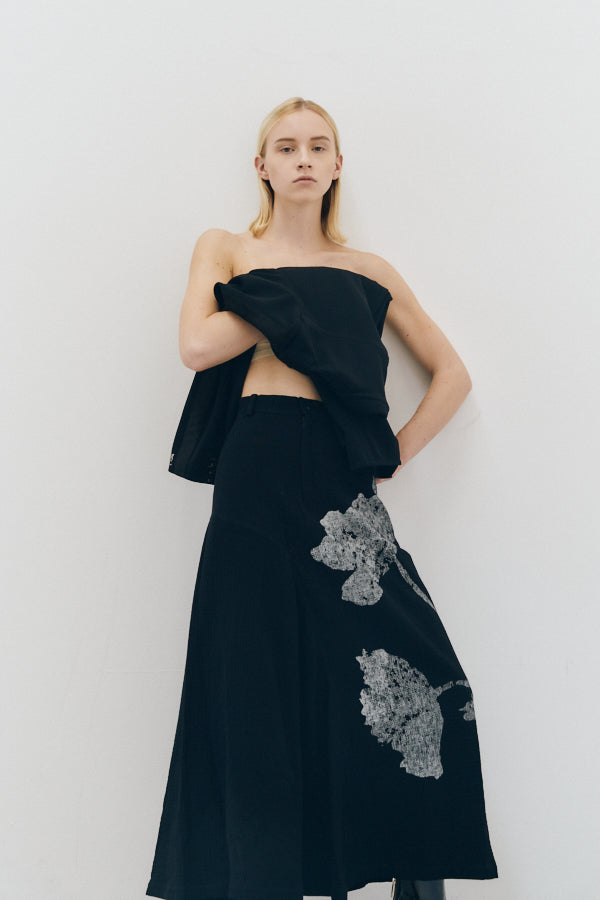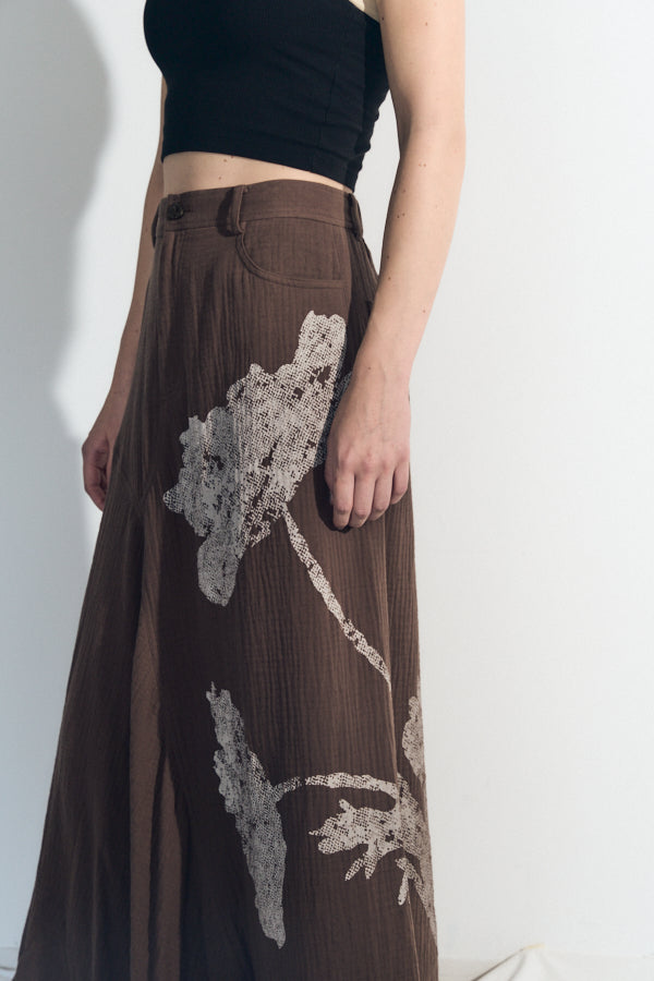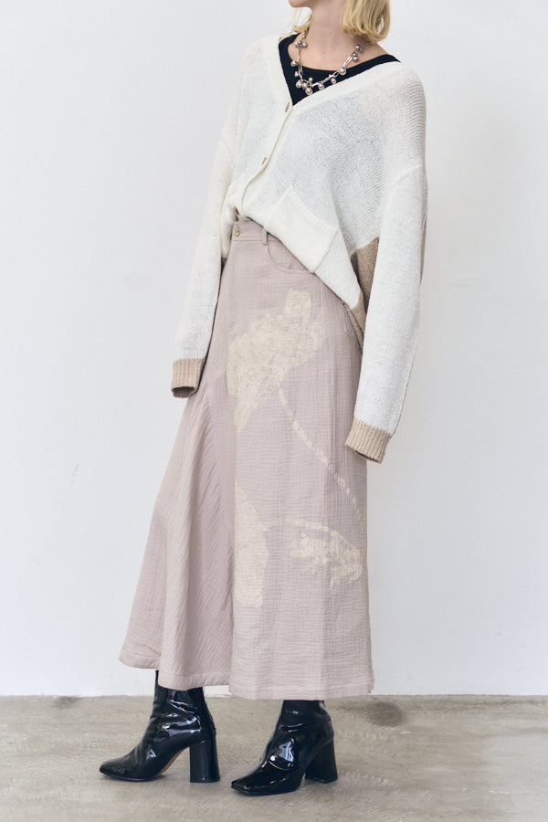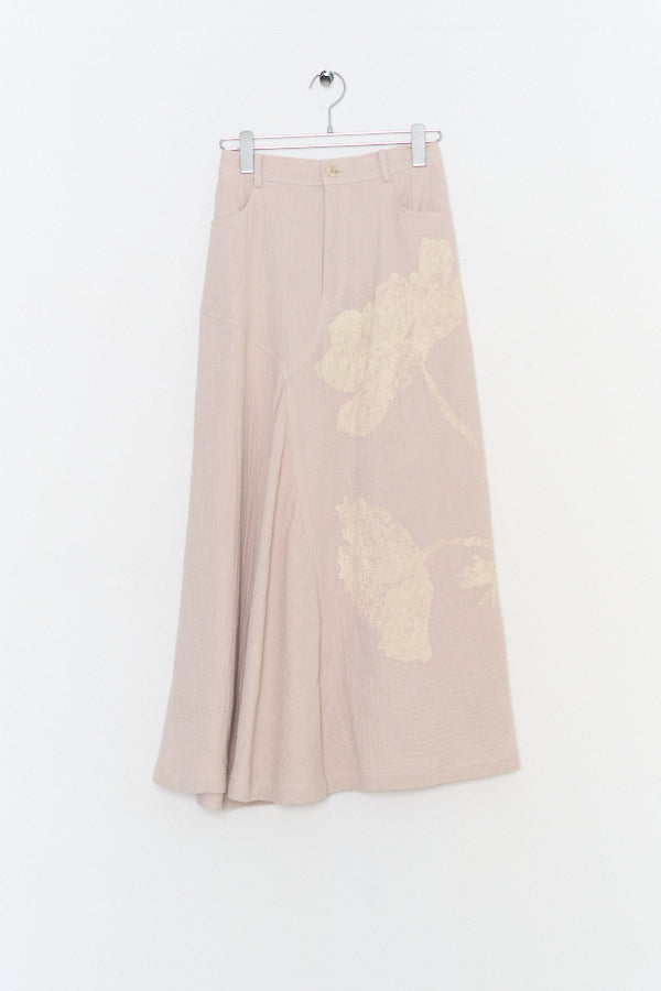 柔らかな風合いが魅力のダブルガーゼ素材に、大きく施した花柄プリントが目を引くスカート。ふんわりとした生地感が生み出す自然なドレープと、アーティスティックなフラワーモチーフのコントラストが、エレガントでモードな印象を演出します。