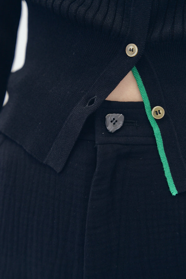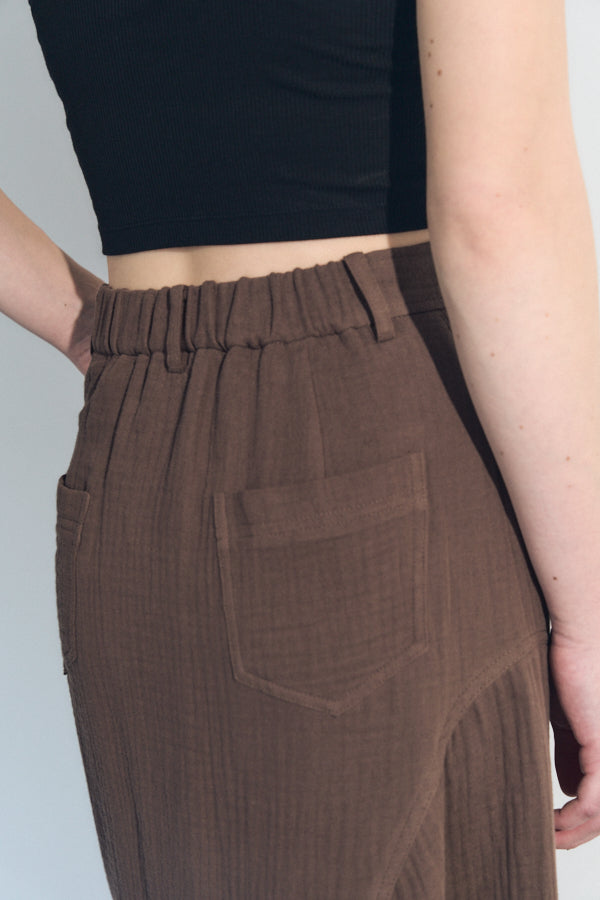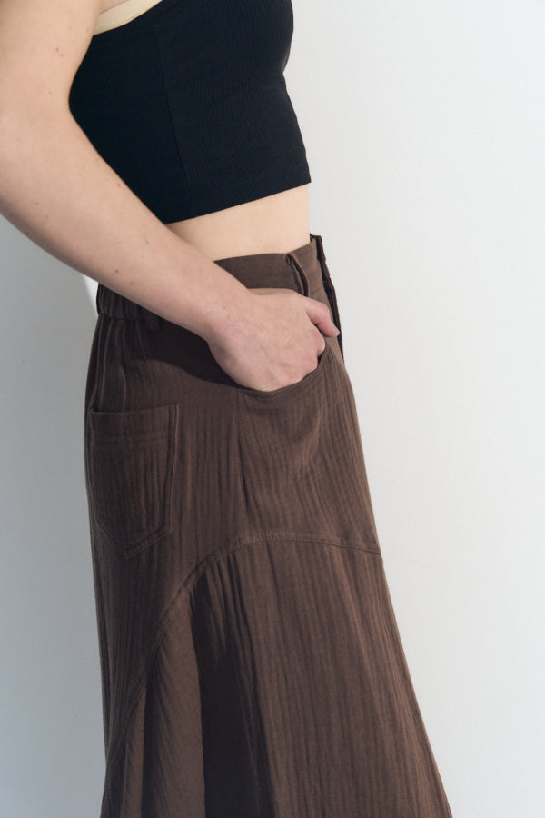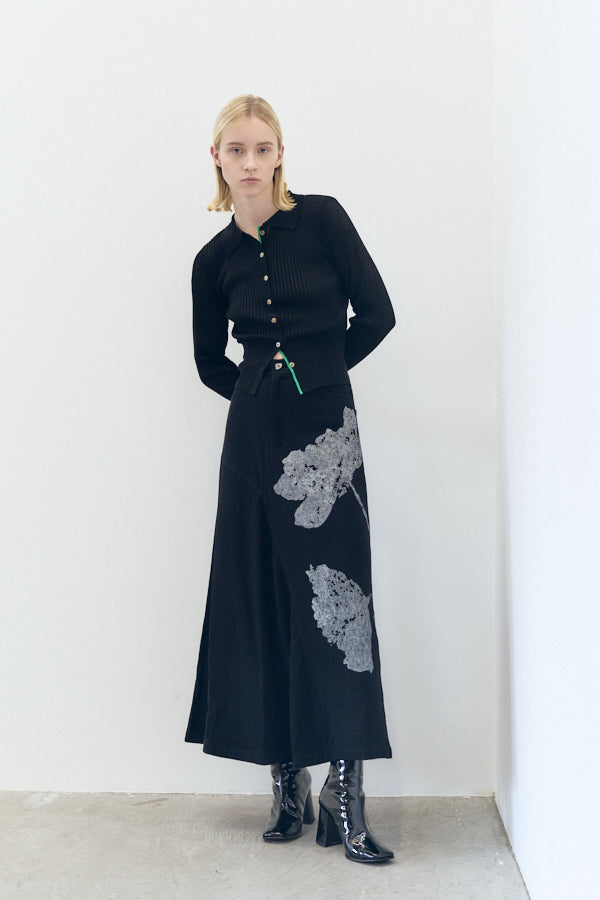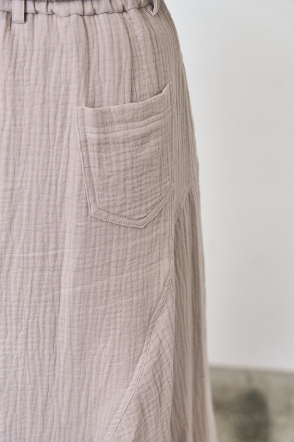 歩くたびに軽やかに揺れ、シンプルなトップスと合わせるだけでスタイリングの主役に。カラーごとに異なる表情を楽しめる、存在感のある一枚です。