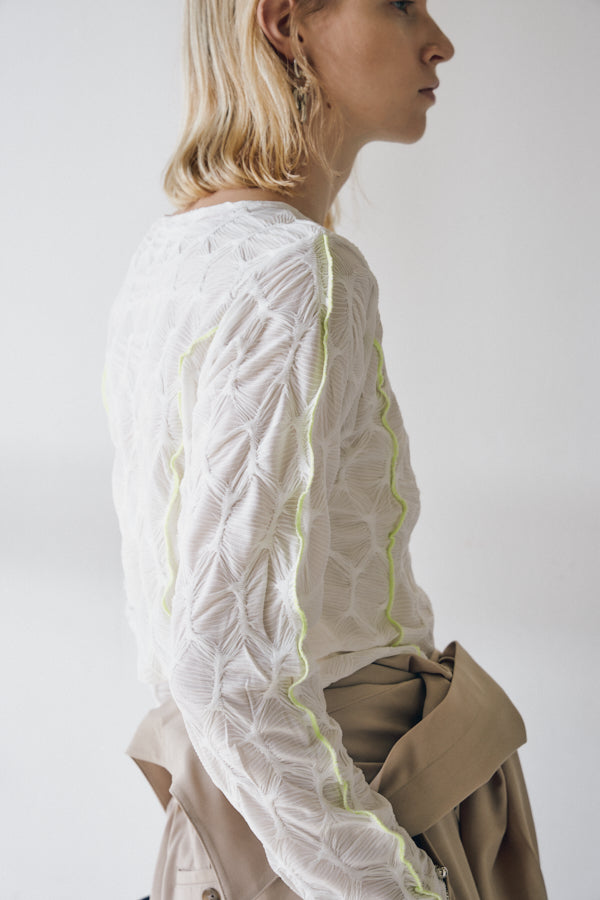 さらに、袖や身頃にあしらわれた配色のメロウがアクセントとなり、フェミニンさとモード感を兼ね備えた一枚に仕上げました。