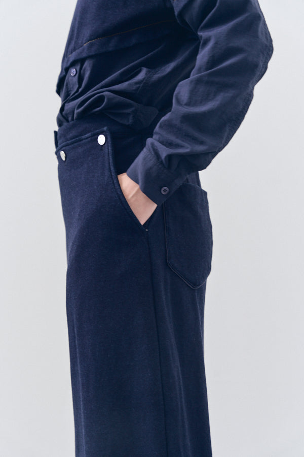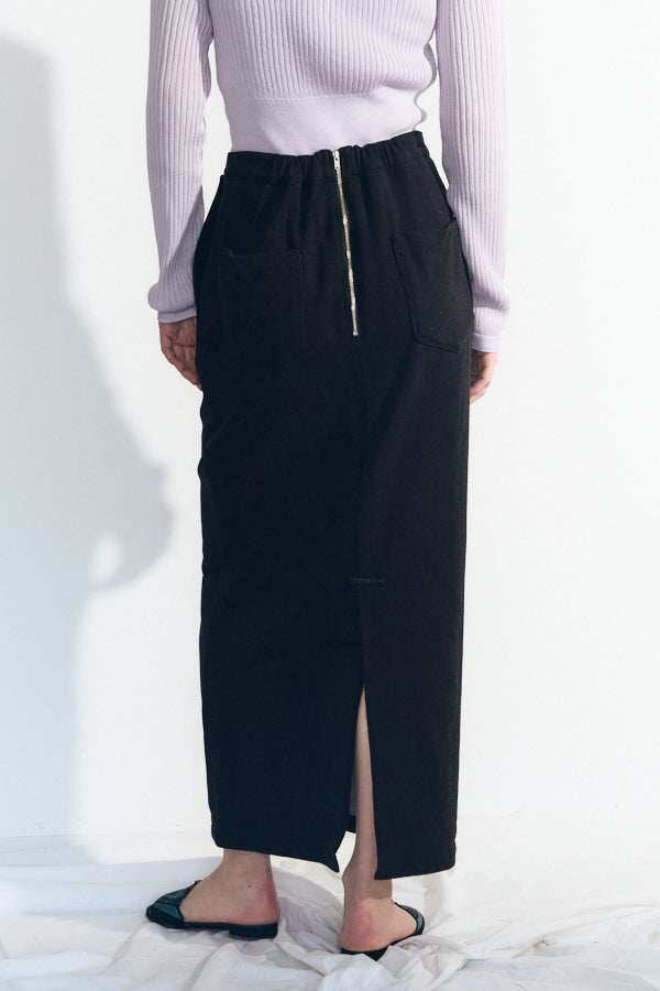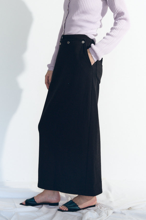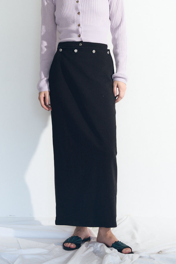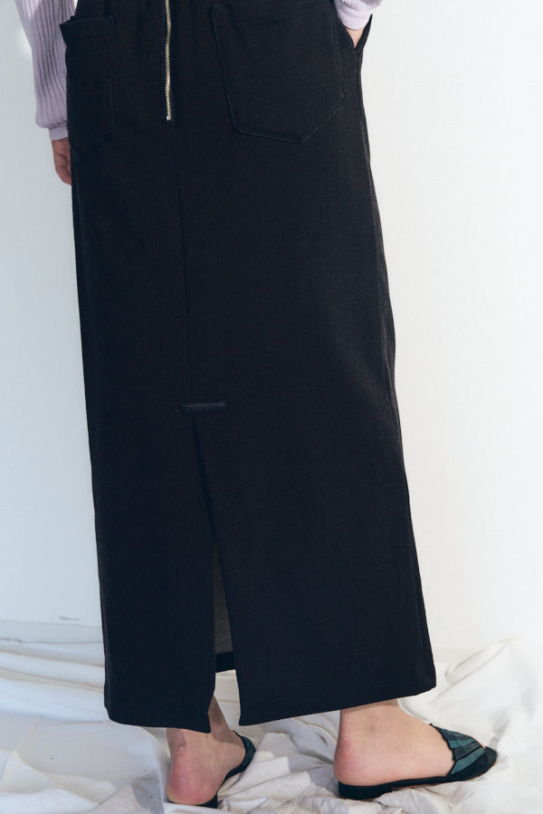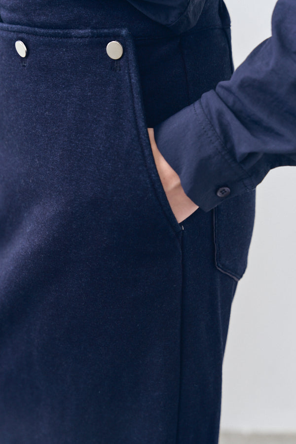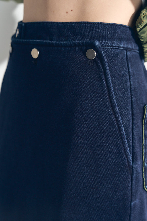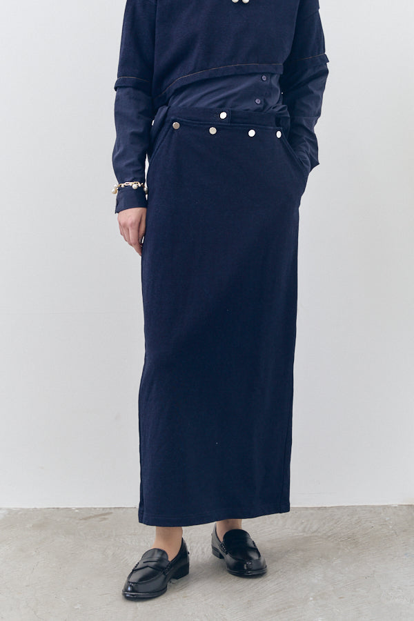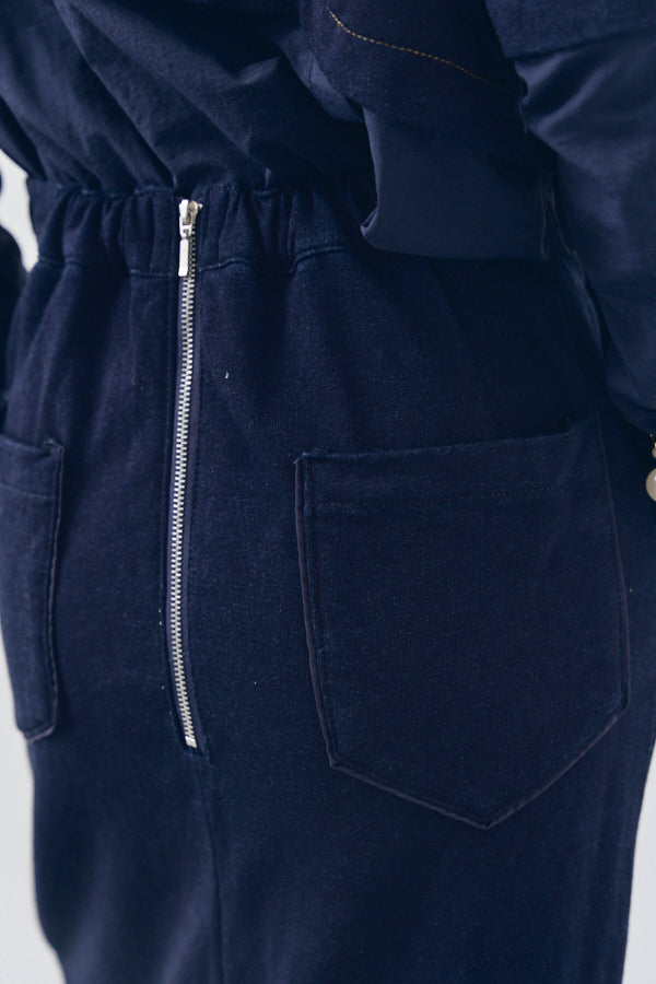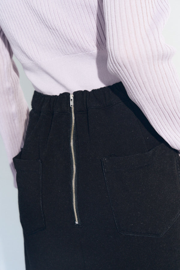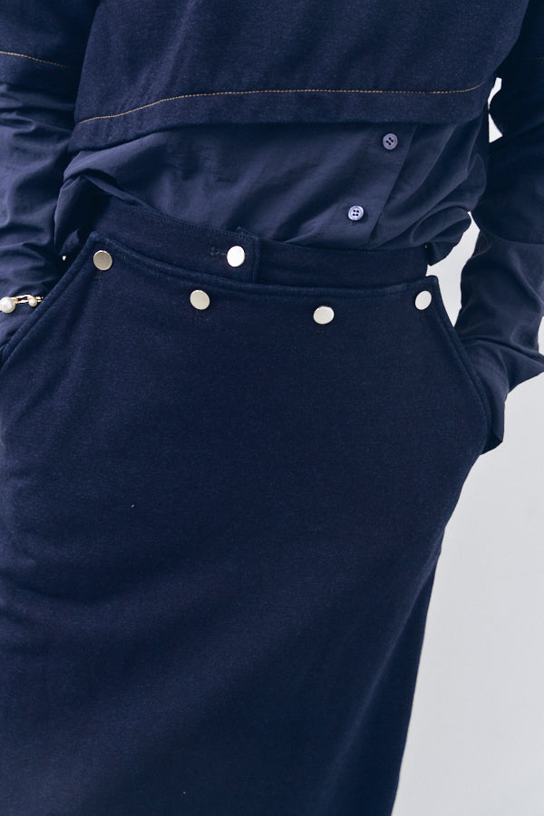 フロントに並ぶスナップボタンや、後ろに施したジップとスリットが抜け感をプラス。カジュアルながらもモードな雰囲気を持ち、スタイリングを格上げしてくれるアイテムです。