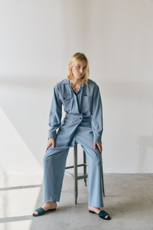 ラップ風のワイドシルエットと落ち感のある素材ですっきりとしたスタイルアップを演出しました。
