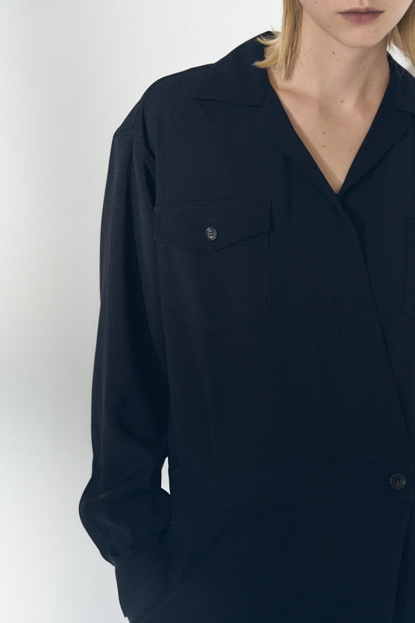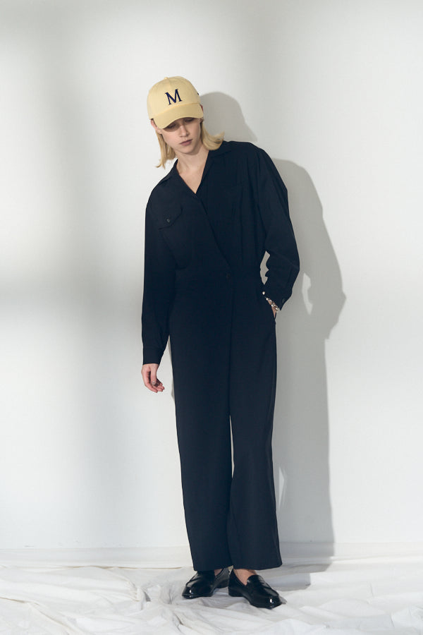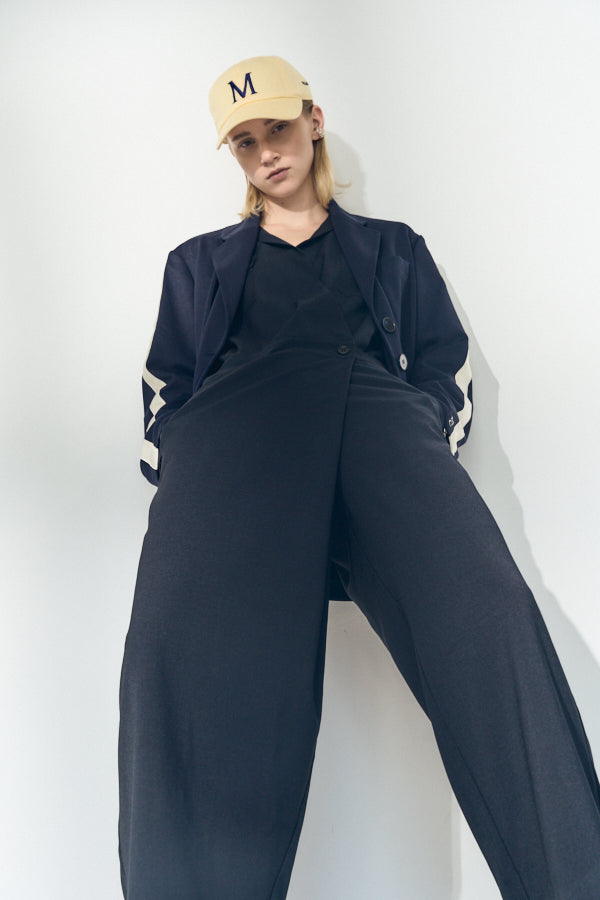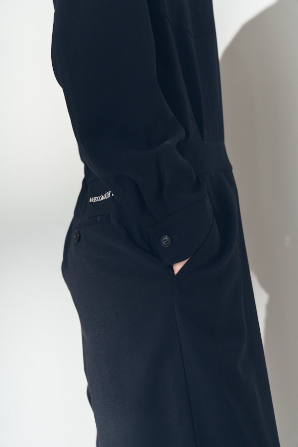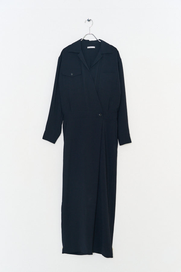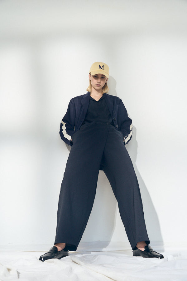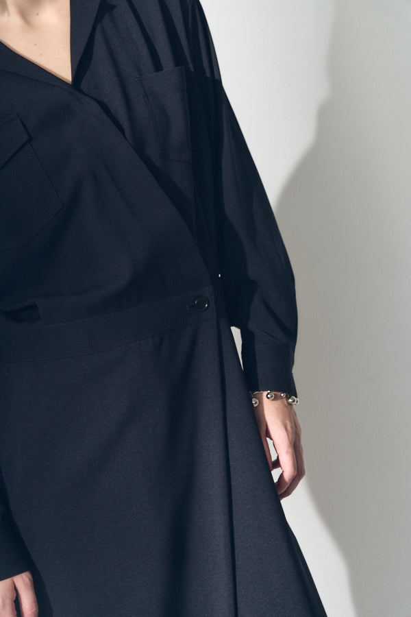 ラップ風のワイドシルエットと落ち感のある素材ですっきりとしたスタイルアップを演出しました。