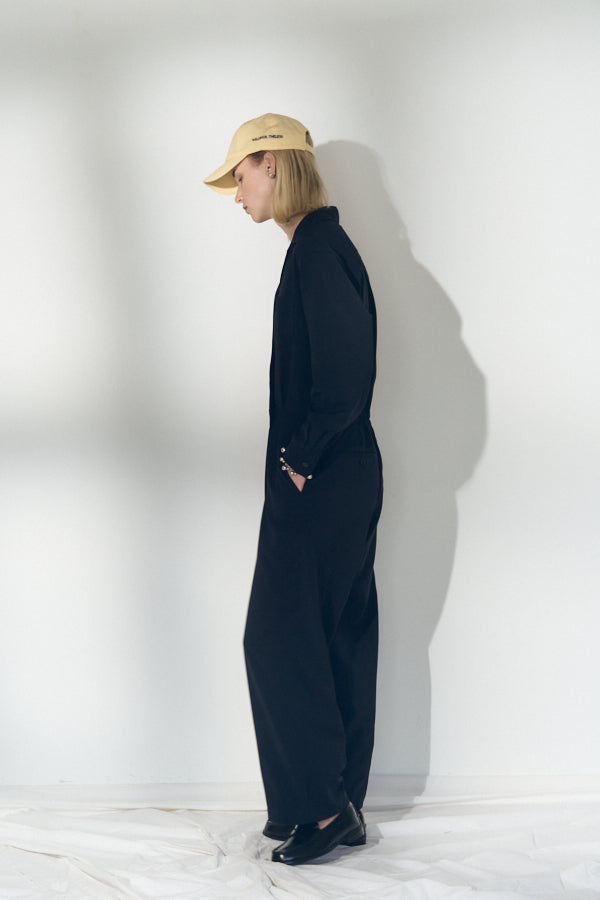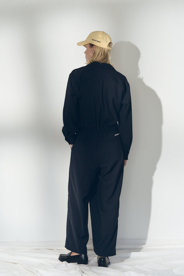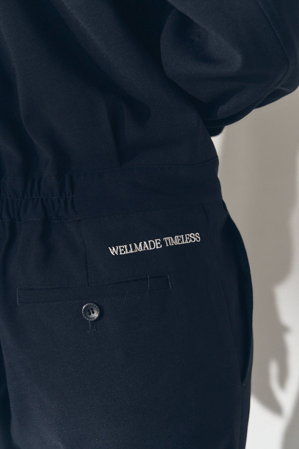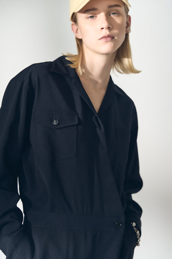 フロントをカシュクール風に仕立てることで、従来のワークウェアの無骨さを感じさせず、洗練された雰囲気に仕上げています。後ろの腰には刺繍をオン。