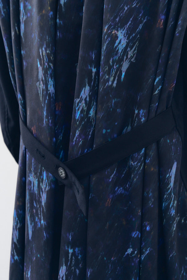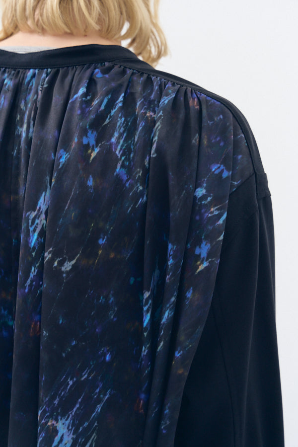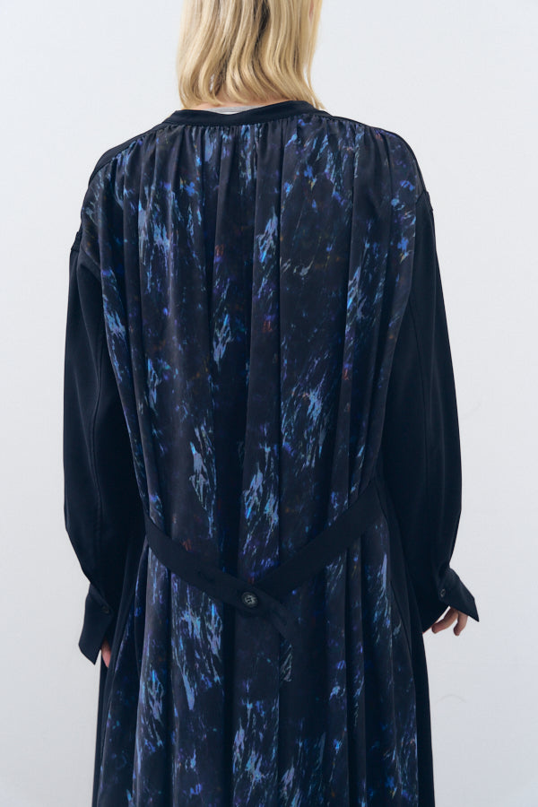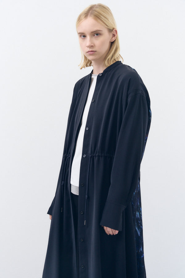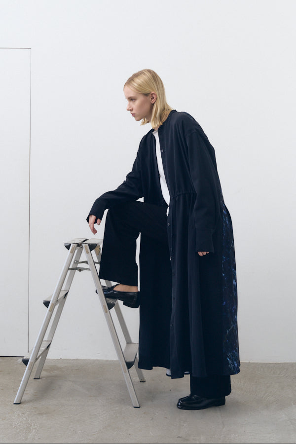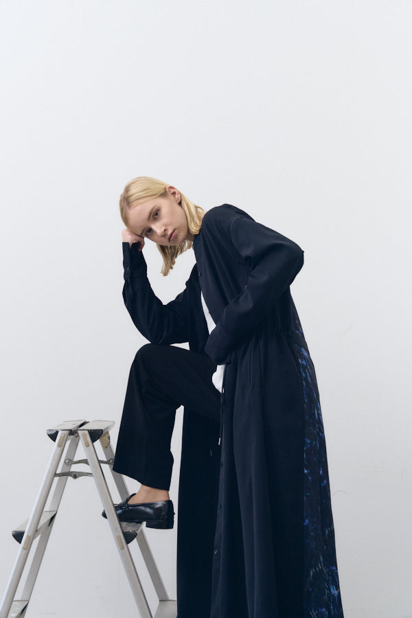 無地とプリントのコントラストがモードな存在感を放ち、一枚で着映えするデザインに仕上げています。