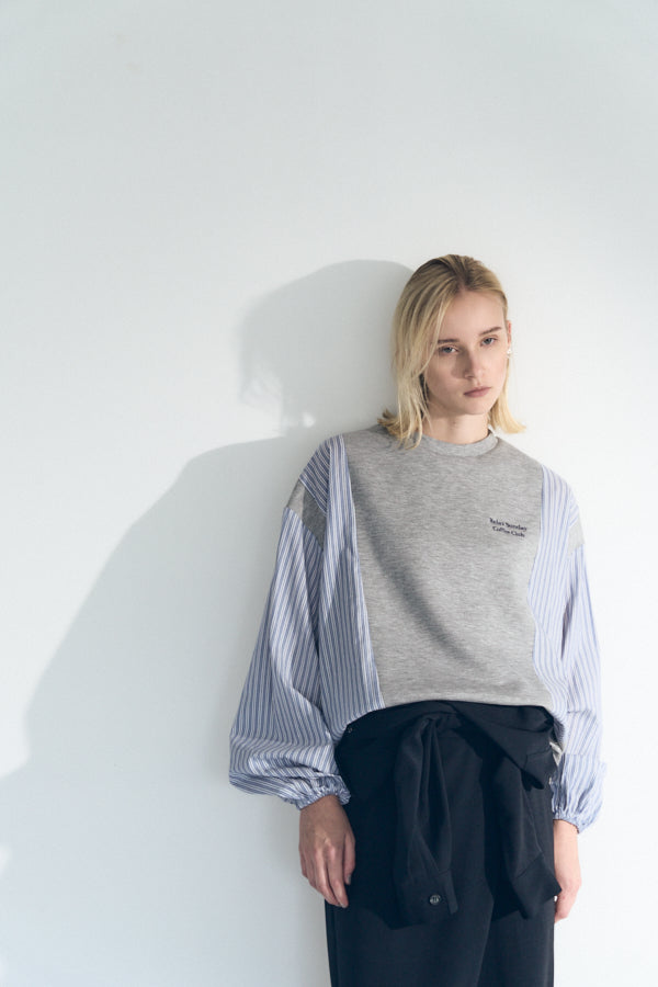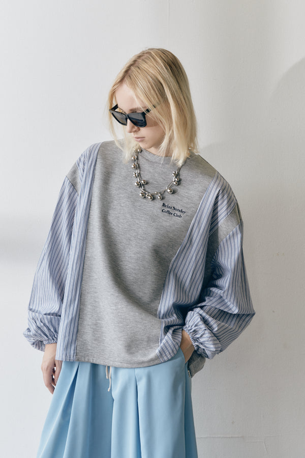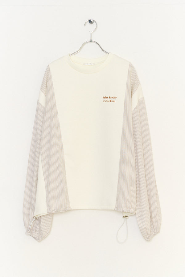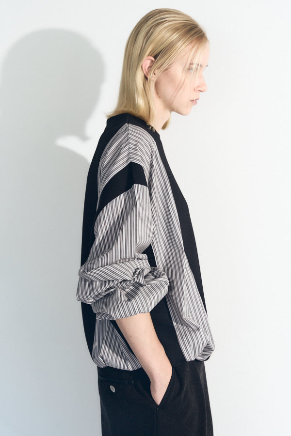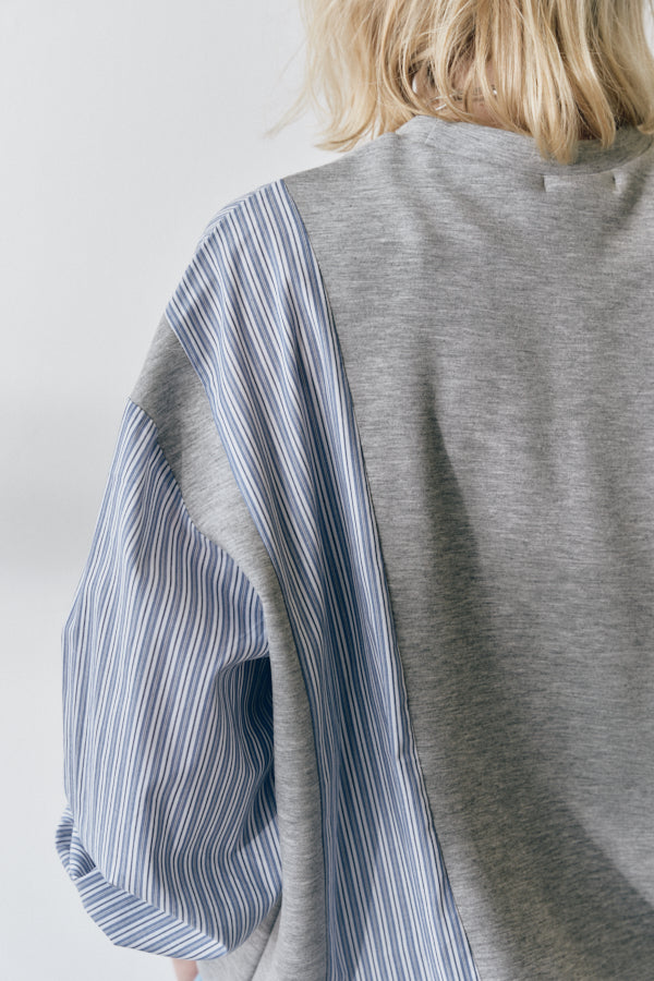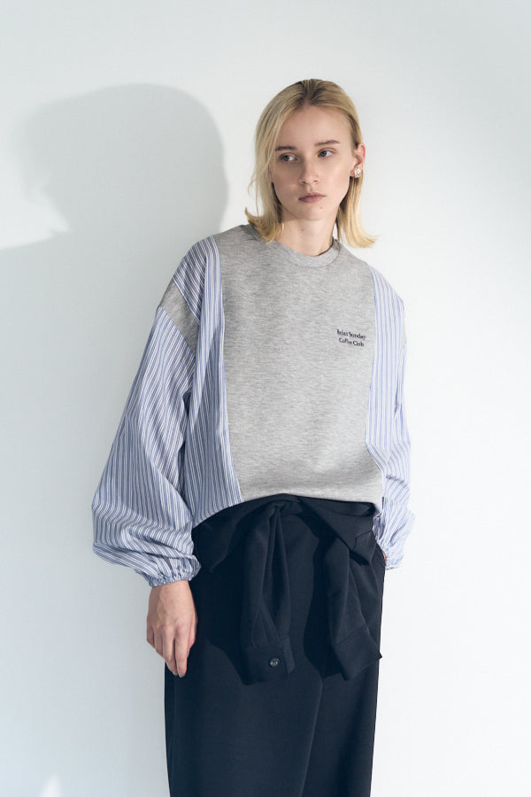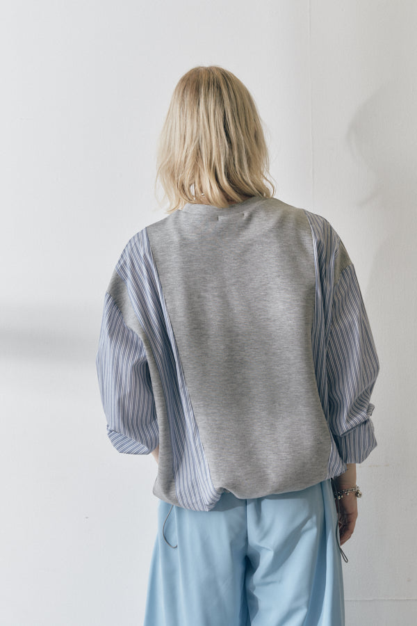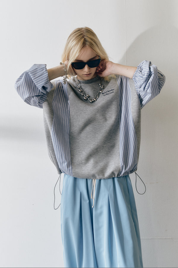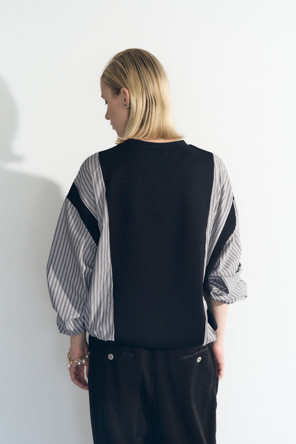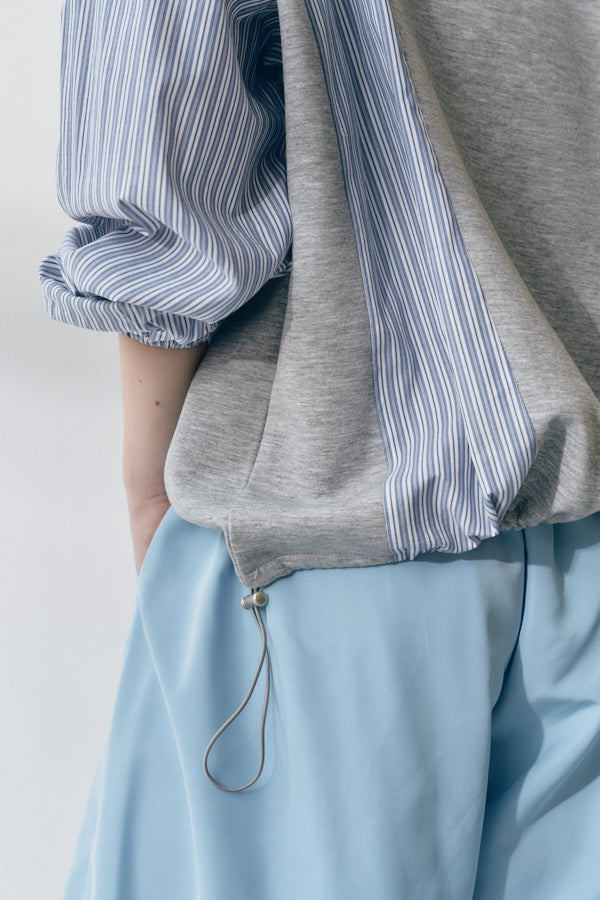 袖や身頃を所々切り替えストライプ生地を採用、ゆったりとしたシルエットと袖口のゴムで生まれる自然なボリューム感が特徴です。